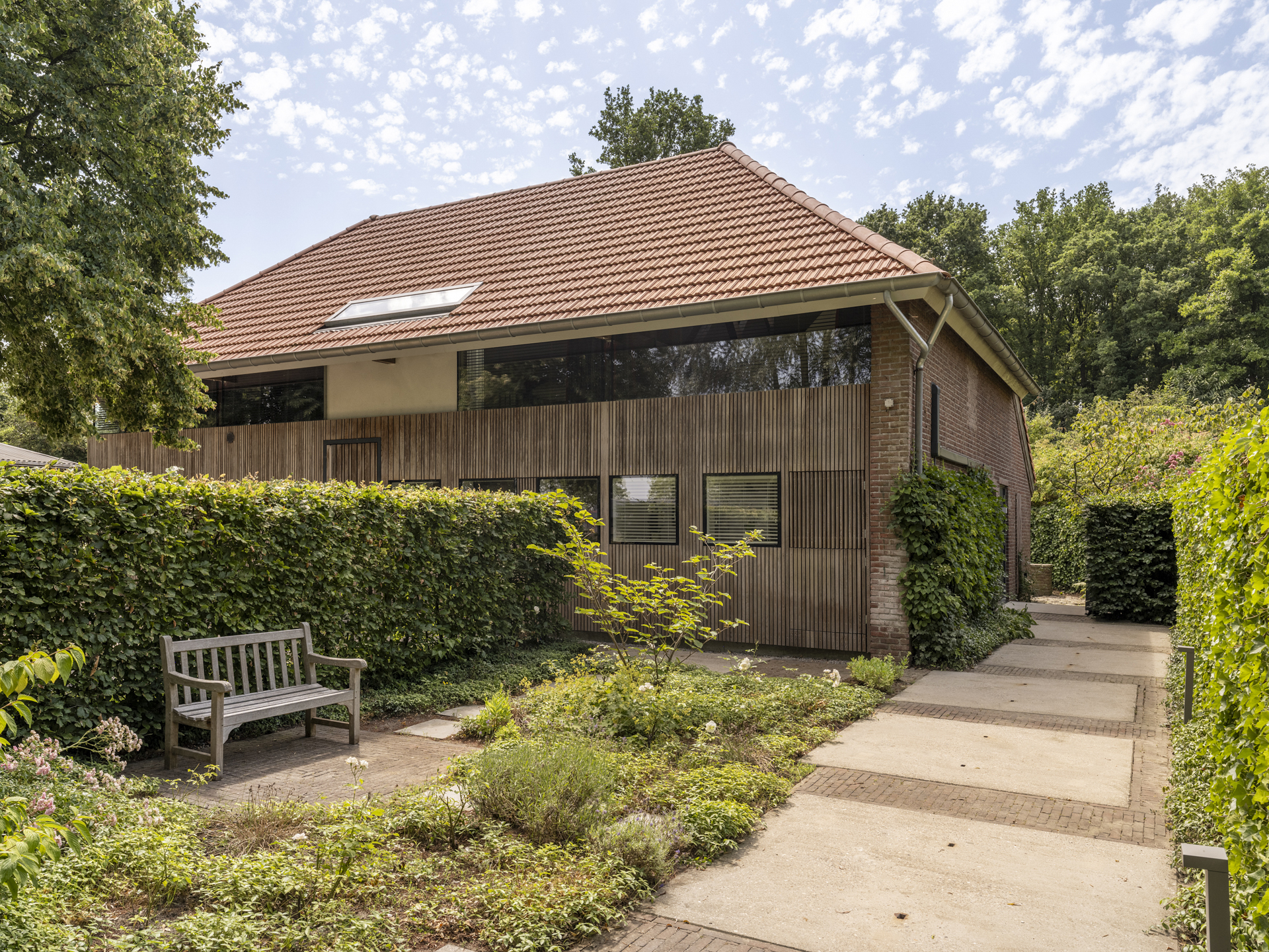 Aan dit bijgebouw is in 2025 een zeer degelijke overkapping geplaatst, een heerlijk verlengstuk van de leefruimte in de tuin. Het dak is te openen en sluiten (een lamellen-systeem), zowel voor lichttoetreding als bescherming tegen regen. Tevens is de overkapping voorzien van uitschuifbare windschermen.