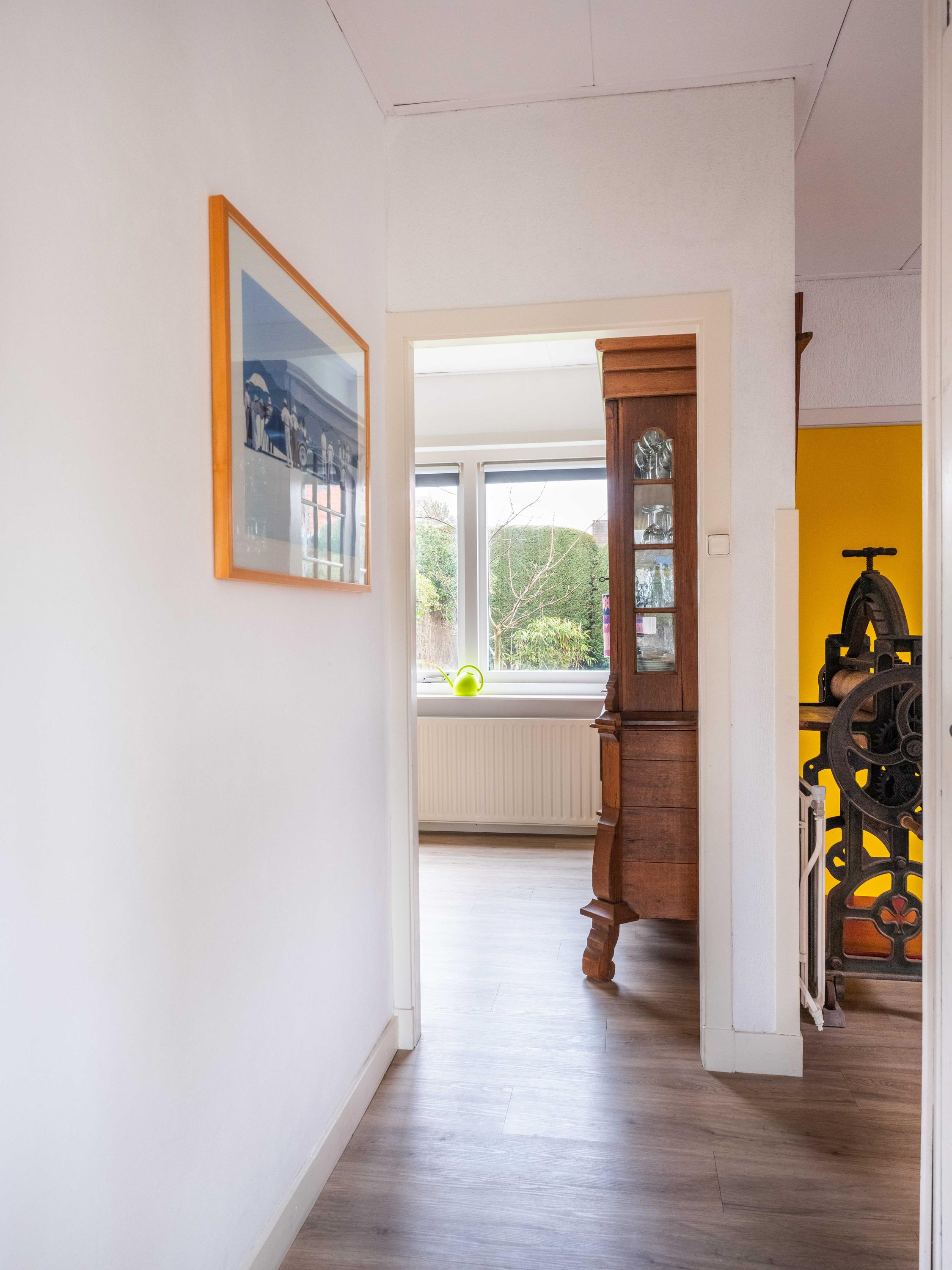 Een vaste trap brengt u naar de eerste verdieping met dakkapel. De overloop biedt toegang tot drie slaapkamers, waarvan één met vaste kasten, en de badkamer. De nette badkamer is voorzien van een dubbele wastafel, toilet en een inloopdouche.