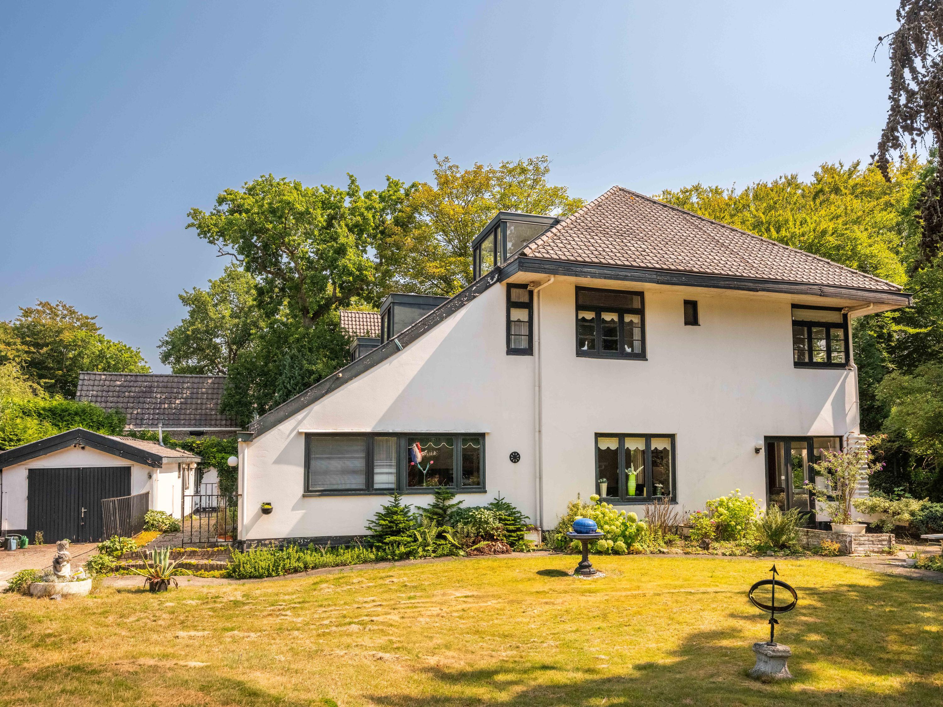 Via de oprit krijg je toegang tot de kavel. Hier tref je ook een grote vrijstaande garage. Plek genoeg voor auto's op eigen terrein. De villa is gelegen op een ruime kavel met fraai aangelegde boom- en struikpartijen rondom.