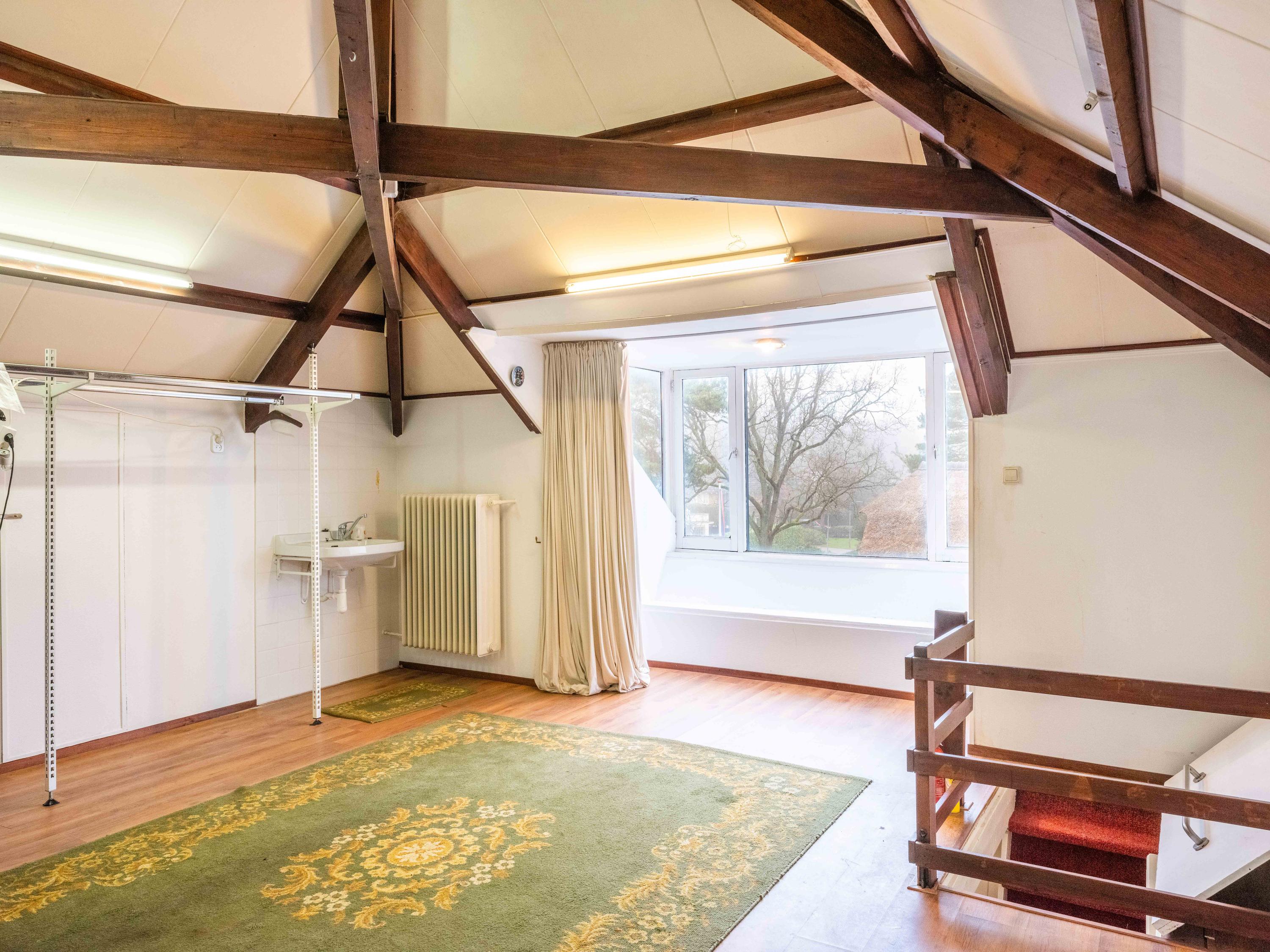 De tuingerichte zit-/eetkamer met openslaande deuren is flink van formaat en naar wens nader in te delen. De keuken is gesloten en eenvoudig uitgevoerd, via de achterdeur in de bijkeuken bereiken we de tuin met de flinke garage van ca. 40 m2. Op de begane grond is tevens een riante atelierruimte beschikbaar die ook prima dienst kan doen als slaapkamer. Via deze ruimte is de tevens van buitenaf bereikbare kantoorruimte bereikbaar. Ideaal voor praktijk aan huis bijvoorbeeld.