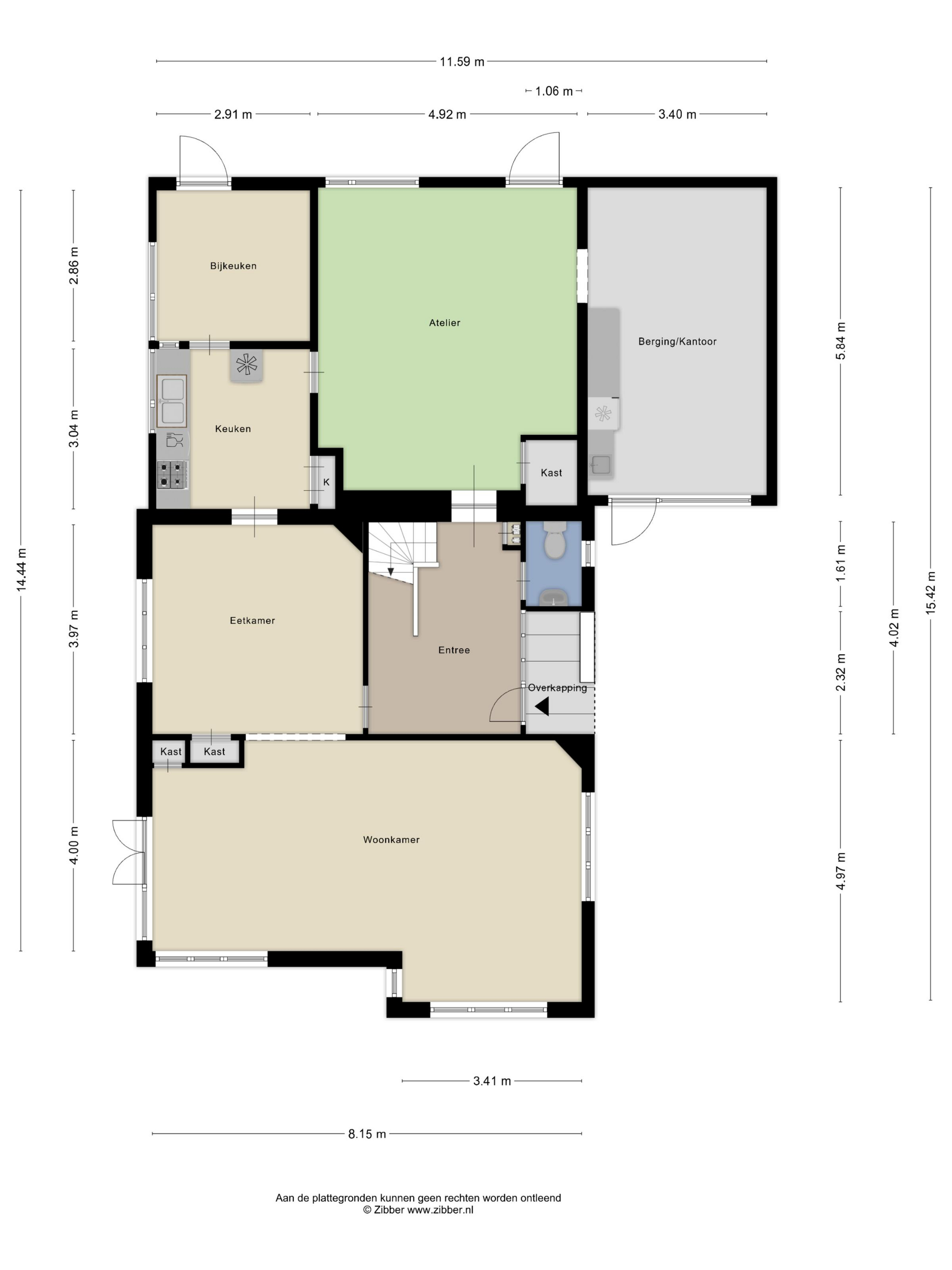 Via de voordeur aan de rechterzijde van de woning komen we in de ruime hal. Van hieruit zijn de woonkamer, keuken met bijkeuken en het atelier met werkkamer te bereiken. De trapopgang leidt naar de eerste verdieping met slaapkamers en een eenvoudige badcel met separaat toilet. Een vaste trap brengt ons naar de flinke zolderkamer met dakkapel van waaruit een mooi uitzicht op dit authentieke stukje Bergen.