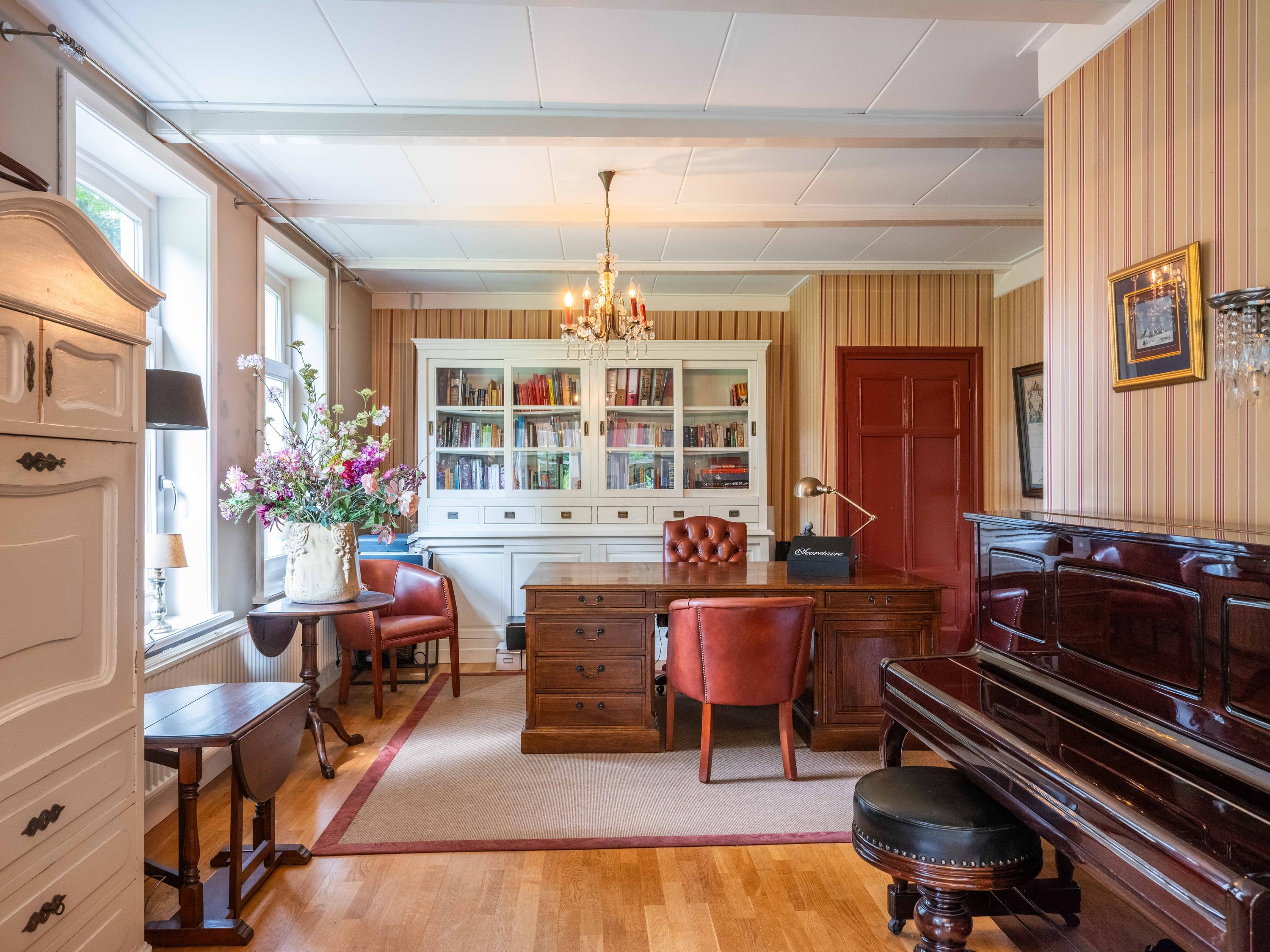 De ruime living van 18 meter lang is licht door de vele raampartijen. Kamer-en-suite deuren delen nu de ruimte in tweeën, waarvan een deel kantoor is. In de woonkamer vinden we een gezellige houtkachel en een deur naar het terras. De ruime landelijke open keuken heeft een opvallende schouw met groot fornuis. Aansluitend aan de keuken vinden we een waskamer met aansluiting voor wasmachine en droger en opbergruimte. Aangrenzend bevind zich een linnenkamer. Er is een bijkeuken met inbouwkasten over de gehele lengte en een keukenblok. De deur gaat naar het tweede terras grenzend aan de woning.