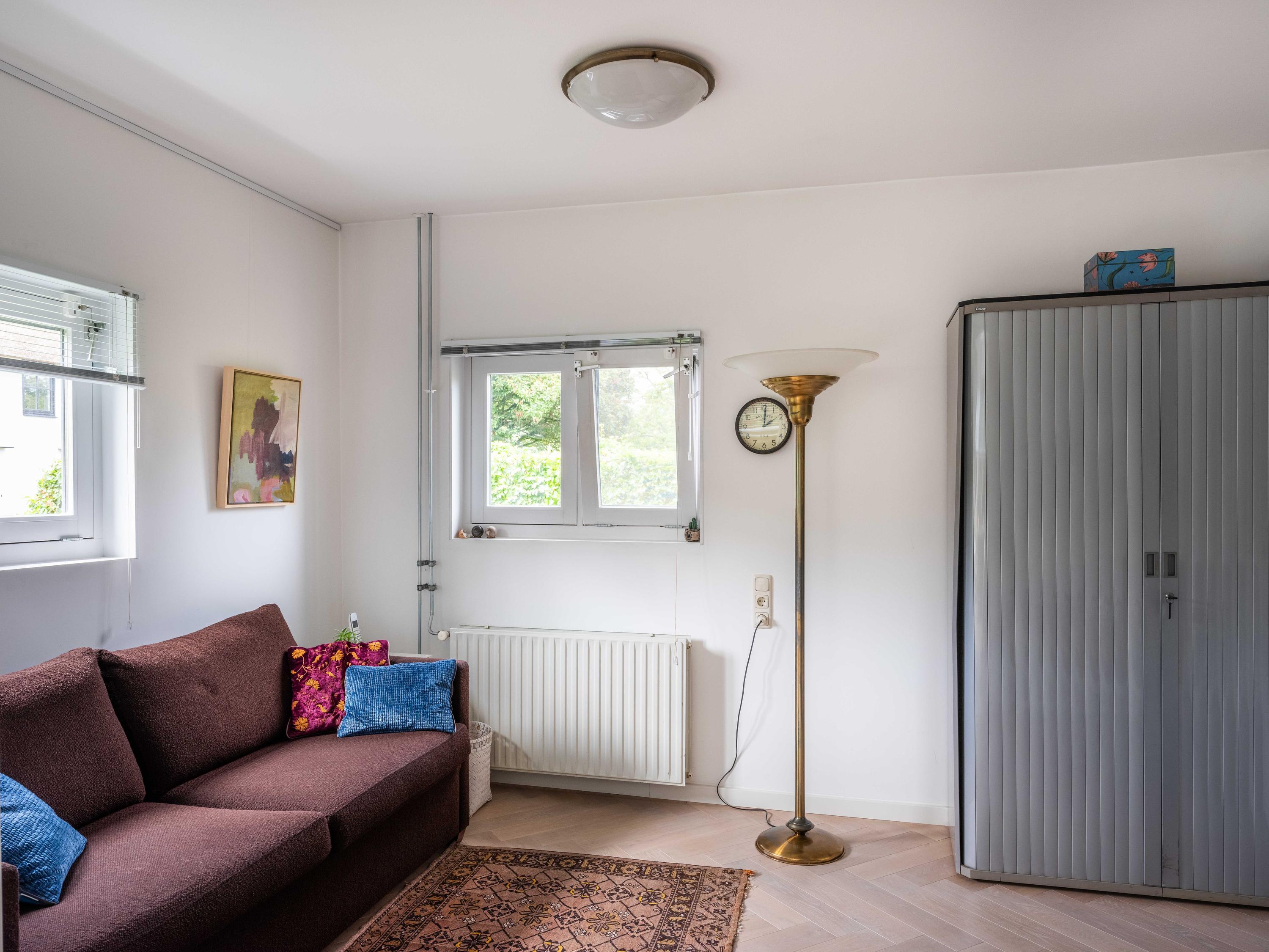 Bij binnenkomst via de hal met meterkast, toilet en trapopgang naar de eerste verdieping, bereikt u de lichte, lange en ruime woonkamer met eikenhouten vloer. Drie openslaande deuren bieden toegang tot de keurig aangelegde, ruime tuin. Naast de woonkamer bevindt zich een werk/hobbykamer, eveneens bereikbaar vanuit de hal via openslaande deuren. Aansluitend aan de woonkamer is er een badkamer met douche en wastafel.