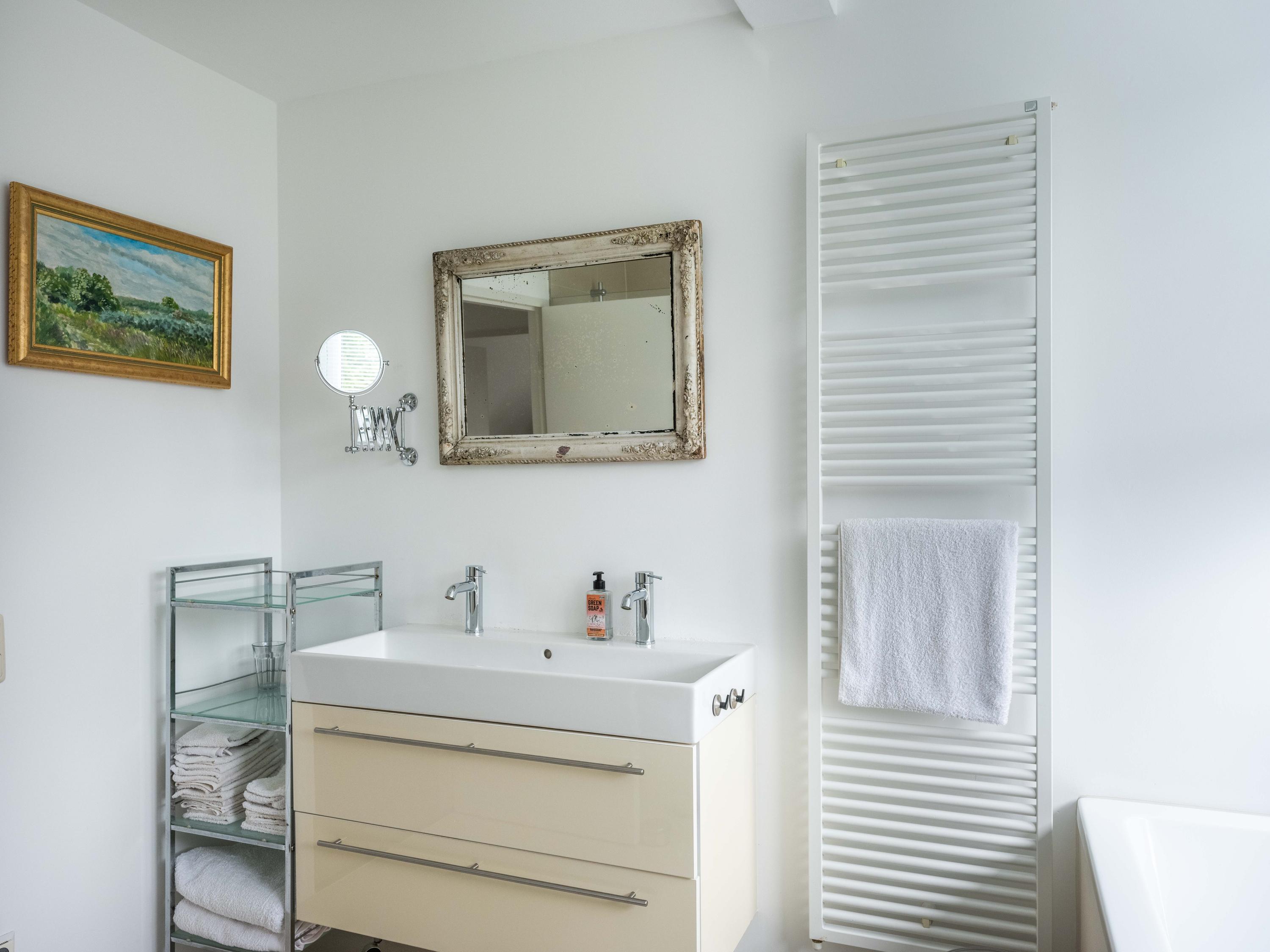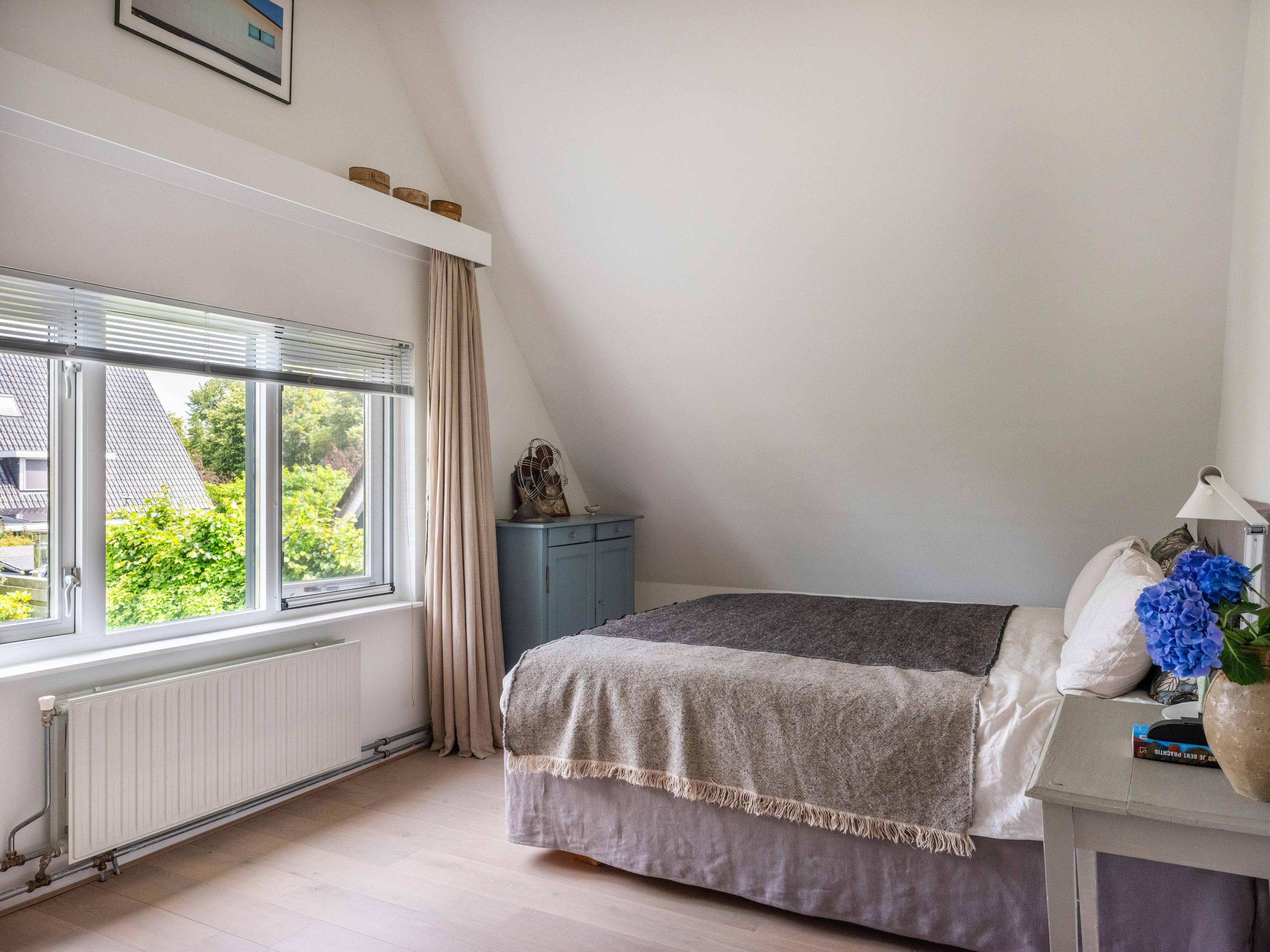 Op de eerste verdieping zijn twee ruime slaapkamers (waarvan één met airco) en een derde, kleinere slaapkamer. De badkamer heeft een dubbele wastafel, ligbad en inloopdouche. Op deze verdieping vindt u ook een ruim toilet en de was-/droogaansluiting. Een vlizotrap leidt naar de zolder die dient als bergruimte en waar de airco en ventilatie-installatie zich bevinden.