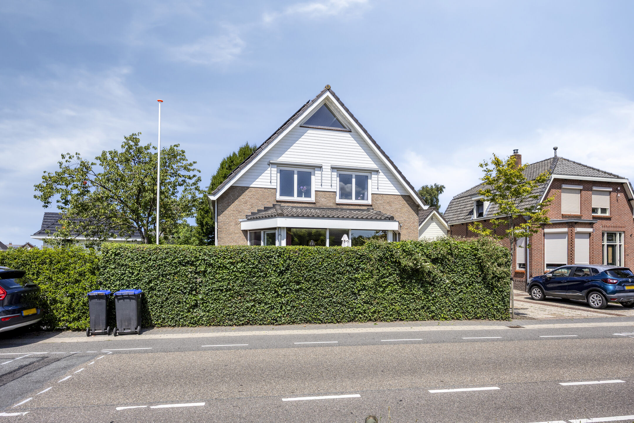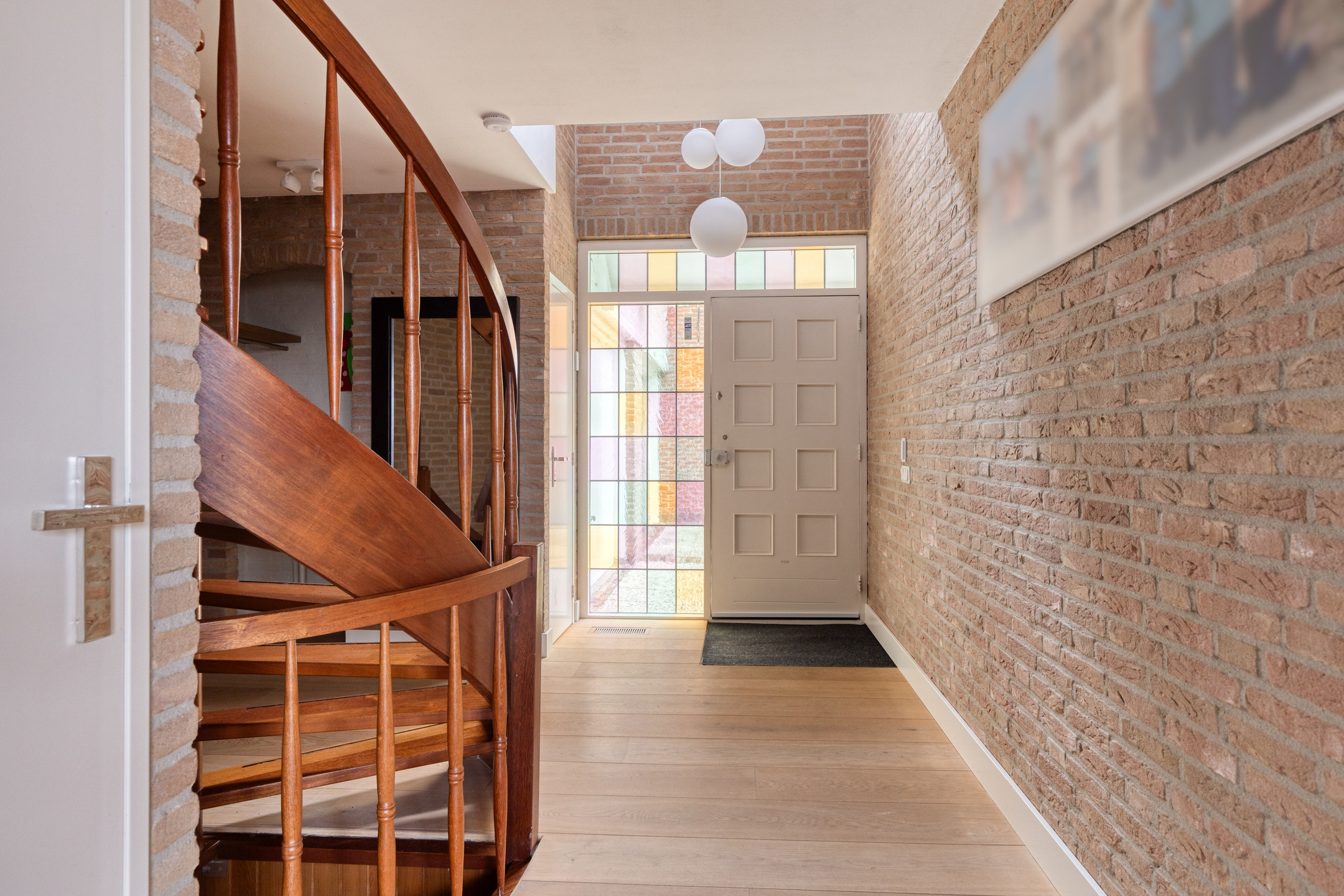 Via de ruime oprit met parkeergelegenheid voor meerdere auto’s, inclusief een laadpunt, en toegang tot de garage waar zich de aansluitingen voor de wasmachine en droger bevinden, kom je bij de entree.