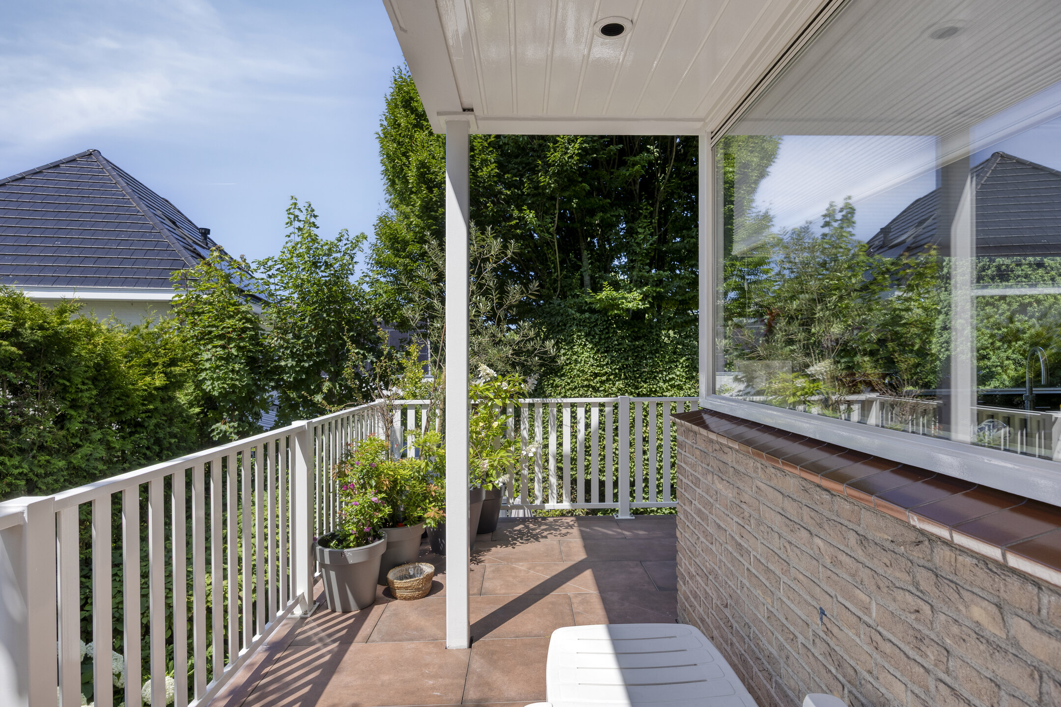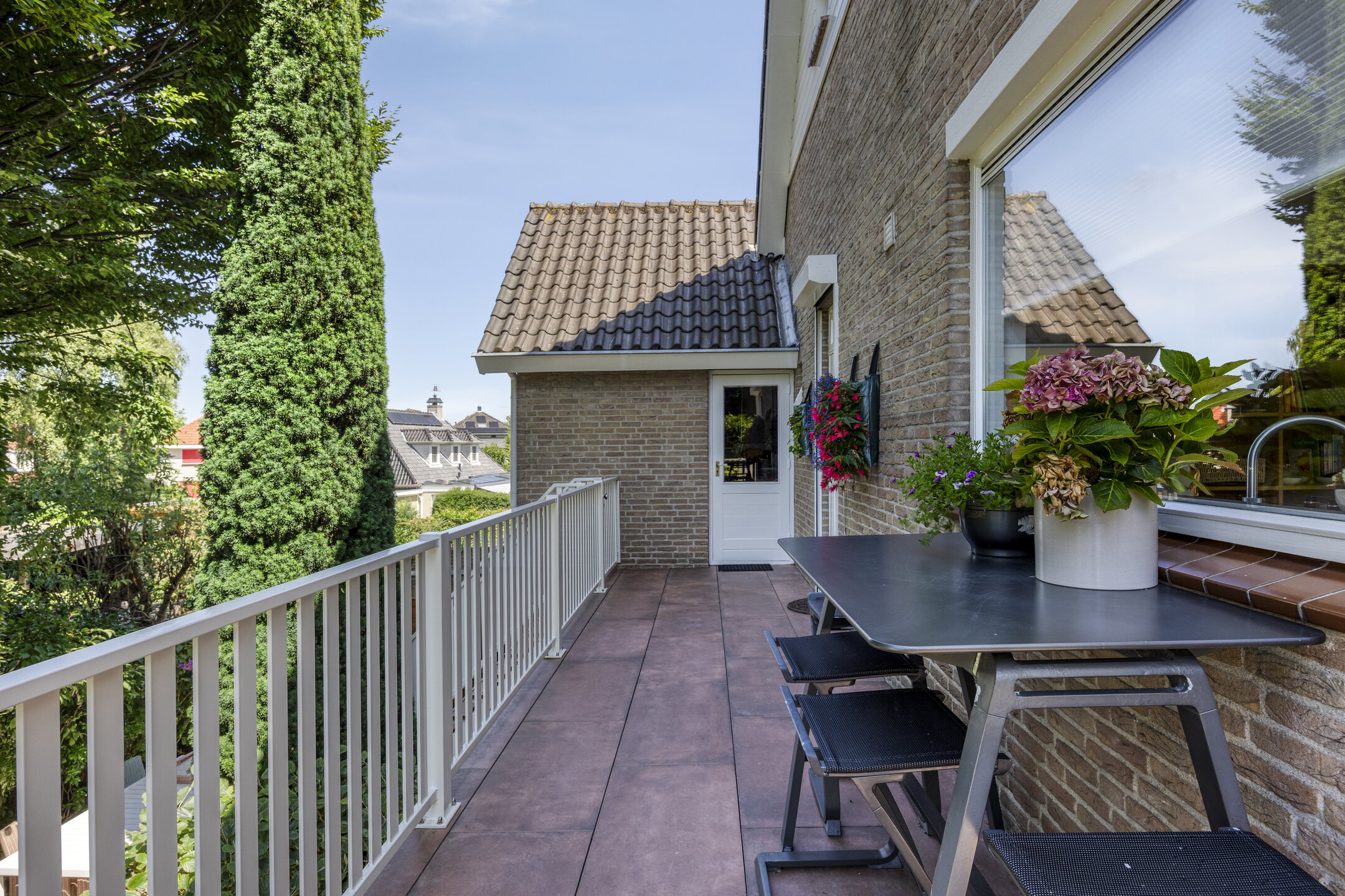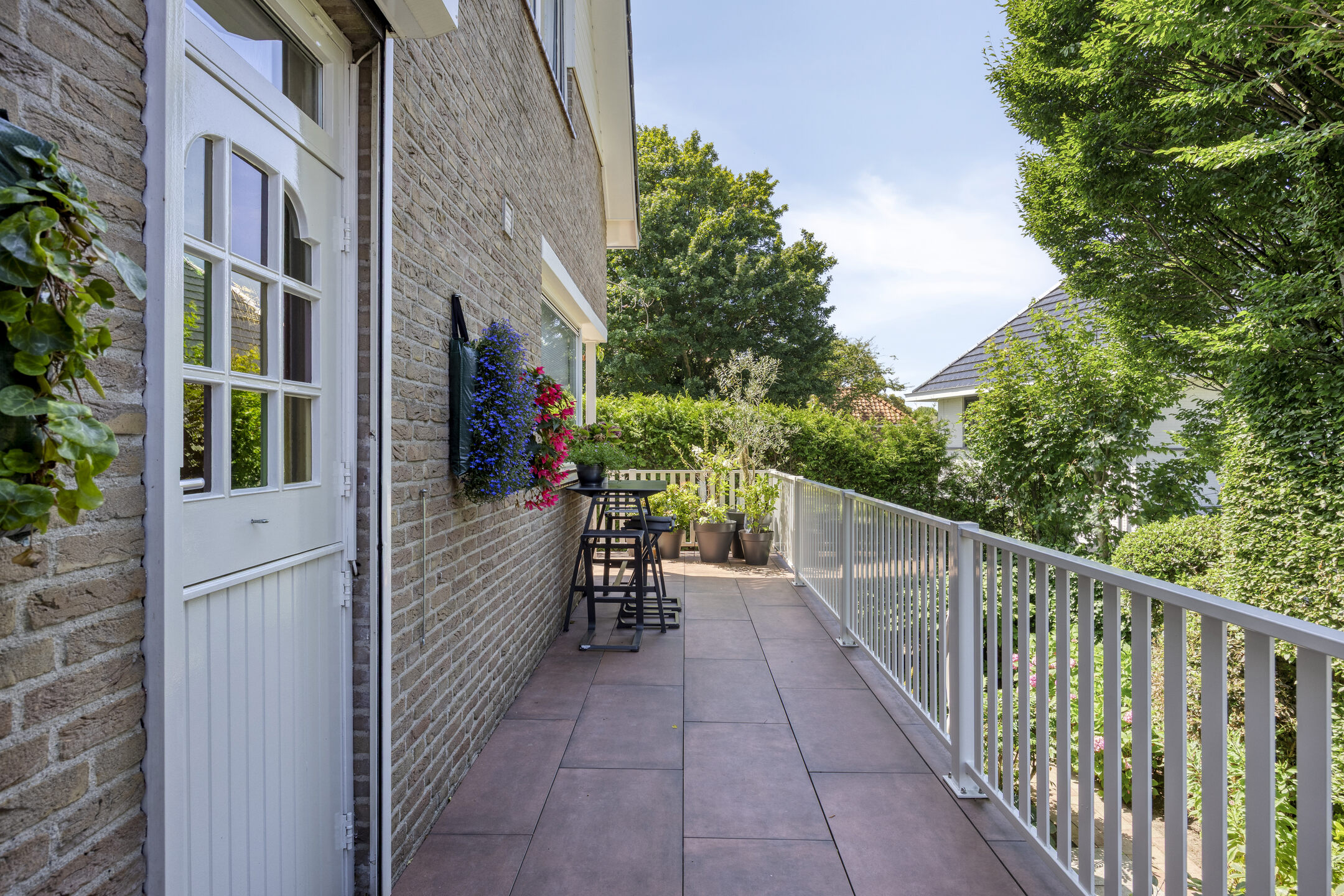 Vanuit de keuken stap je zo het brede, tuingerichte balkon op, dat zich uitstrekt over de volledige breedte van de woning.