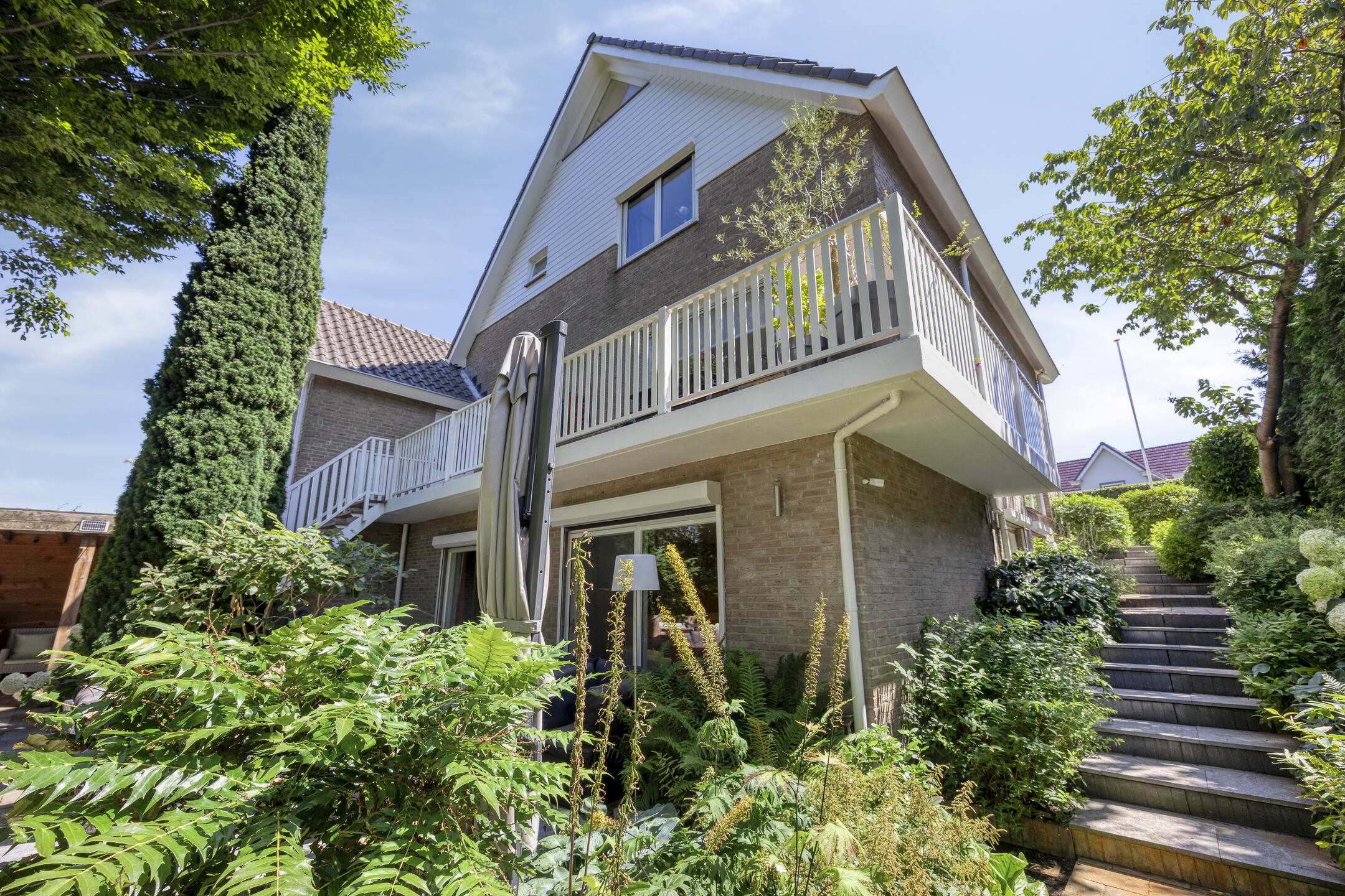 De fraai aangelegde achtertuin biedt veel privacy en een fijne combinatie van zon- en schaduwplekken. Hier geniet je op elk moment van de dag van het buitenleven. Ook de voortuin is een heerlijke plek om te verblijven: hier heb je in de ochtend en tot ver in de middag zon en kun je beschut zitten. De woning is bovendien voorzien van een zonnescherm.