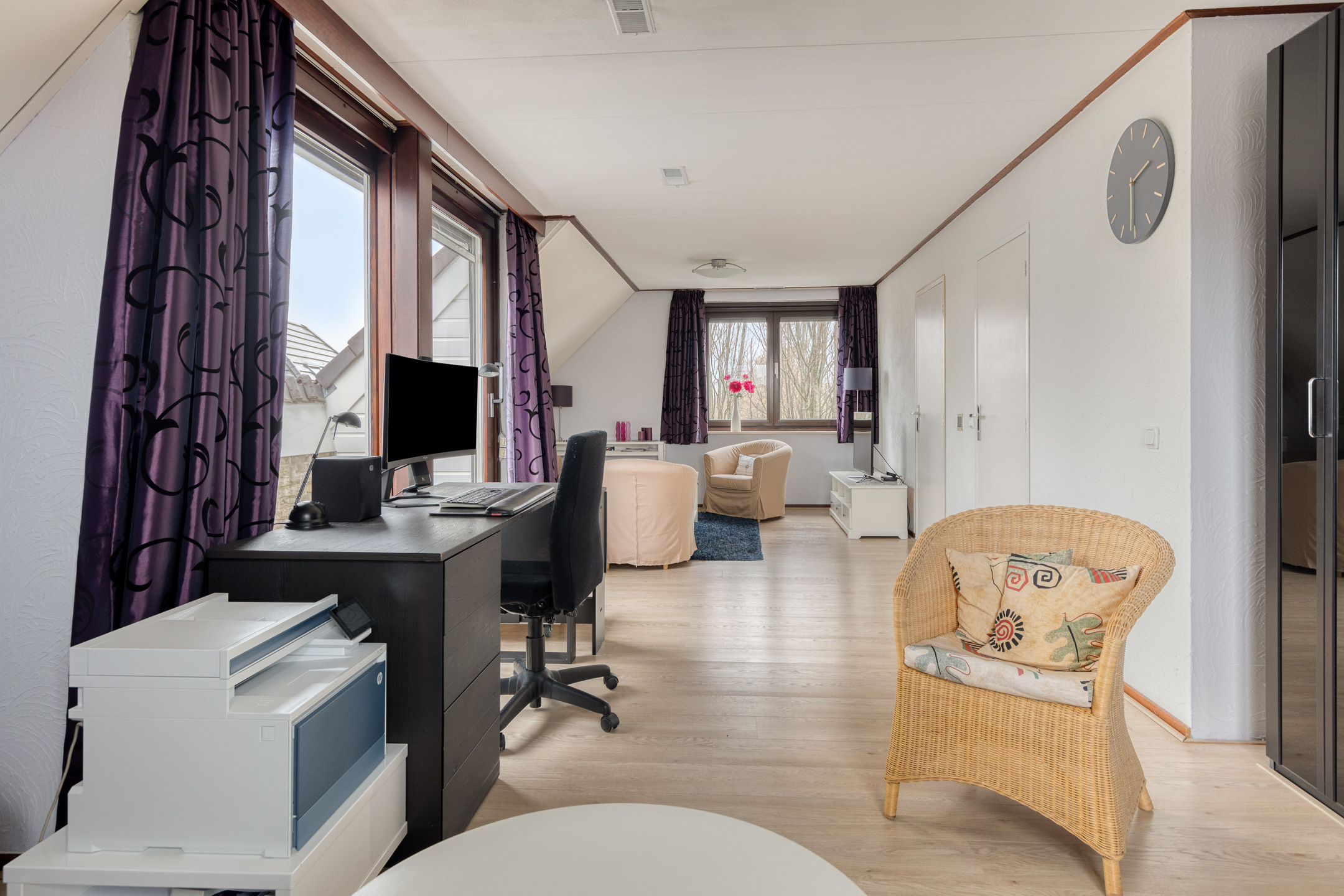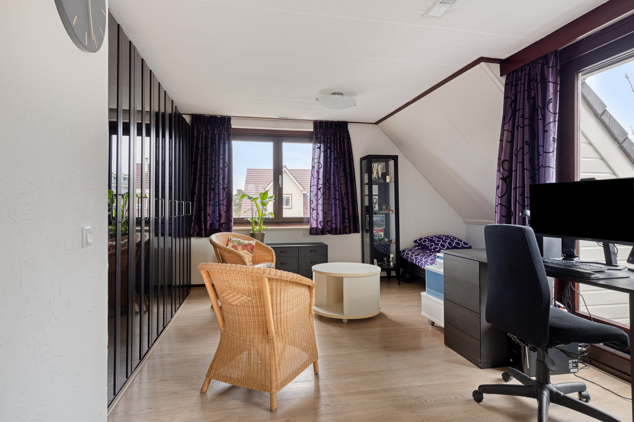Ruime en lichte zolderruimte met grote ramen, waardoor er veel natuurlijk daglicht binnenvalt. Deze verdieping biedt volop bergruimte en is dankzij de afmetingen en lichtinval zeer geschikt om, met het realiseren van een vaste trap, te worden ingericht als extra slaapkamer, werkruimte of volwaardige woonverdieping.