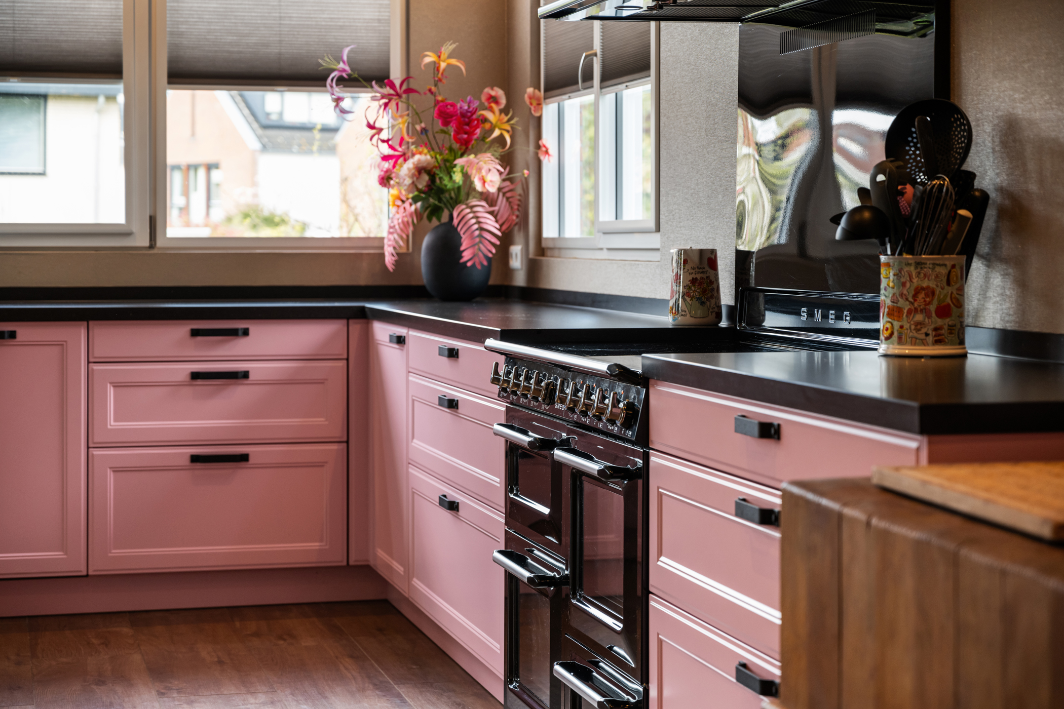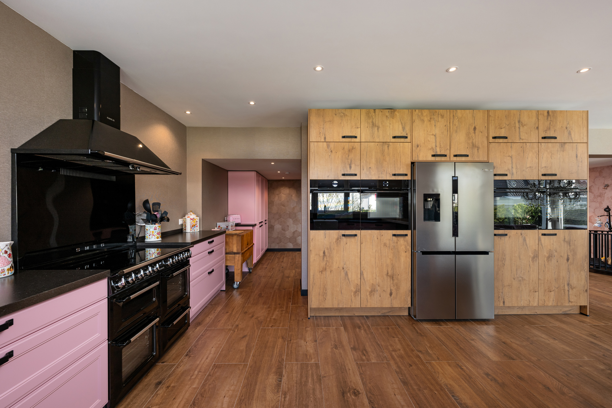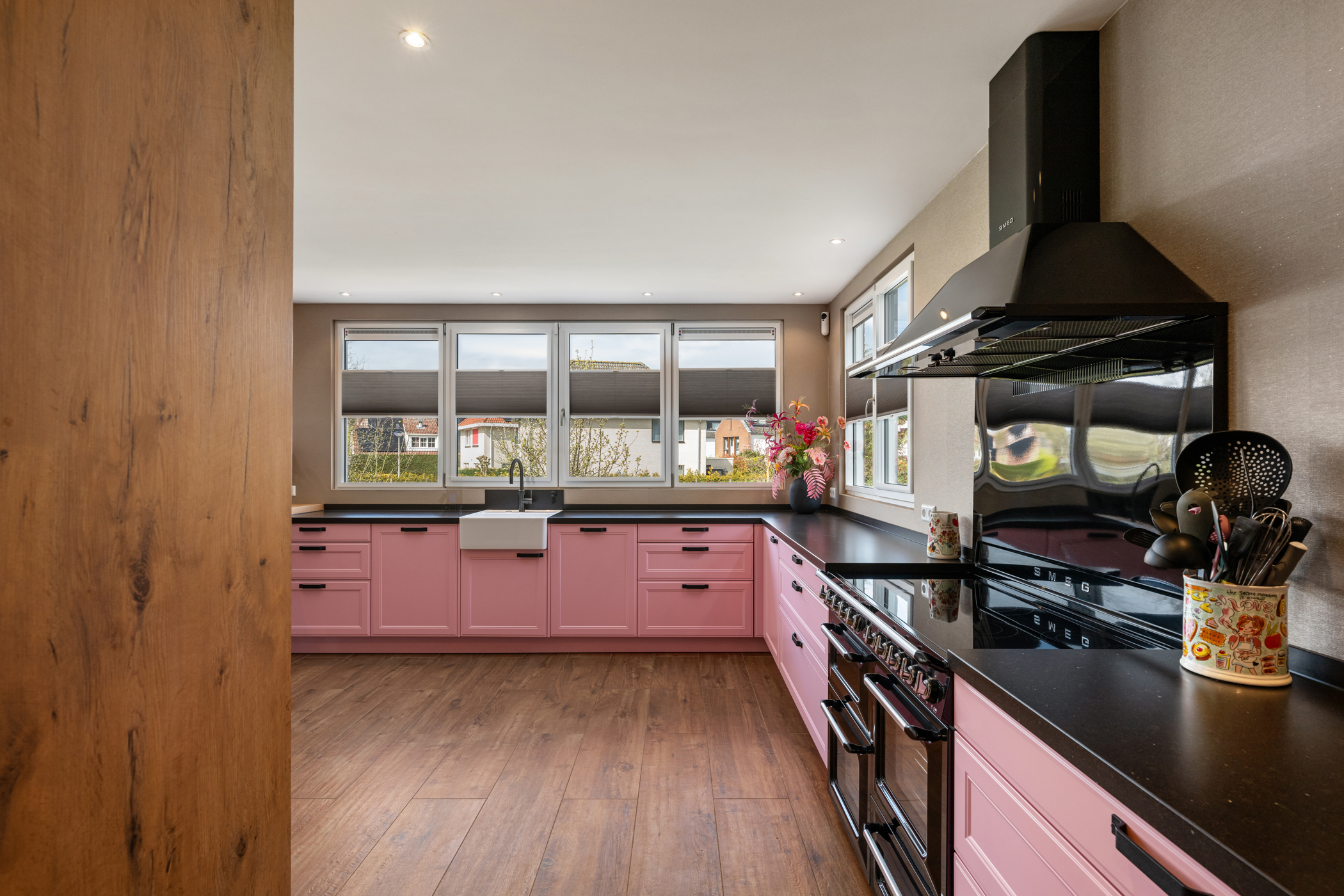 De royale woonkamer aan de voorzijde is ingedeeld in een sfeervolle zit- en eetkamer, met veel lichtinval en een warme uitstraling. Aan de achterzijde bevindt zich de zeer ruime woonkeuken, uitgevoerd met hoogwaardige inbouwapparatuur, waaronder een groot gasfornuis, twee koelkasten, twee vaatwassers, twee combi-ovens, twee stoomovens en een Quooker. Ideaal voor liefhebbers van koken en gastvrijheid.