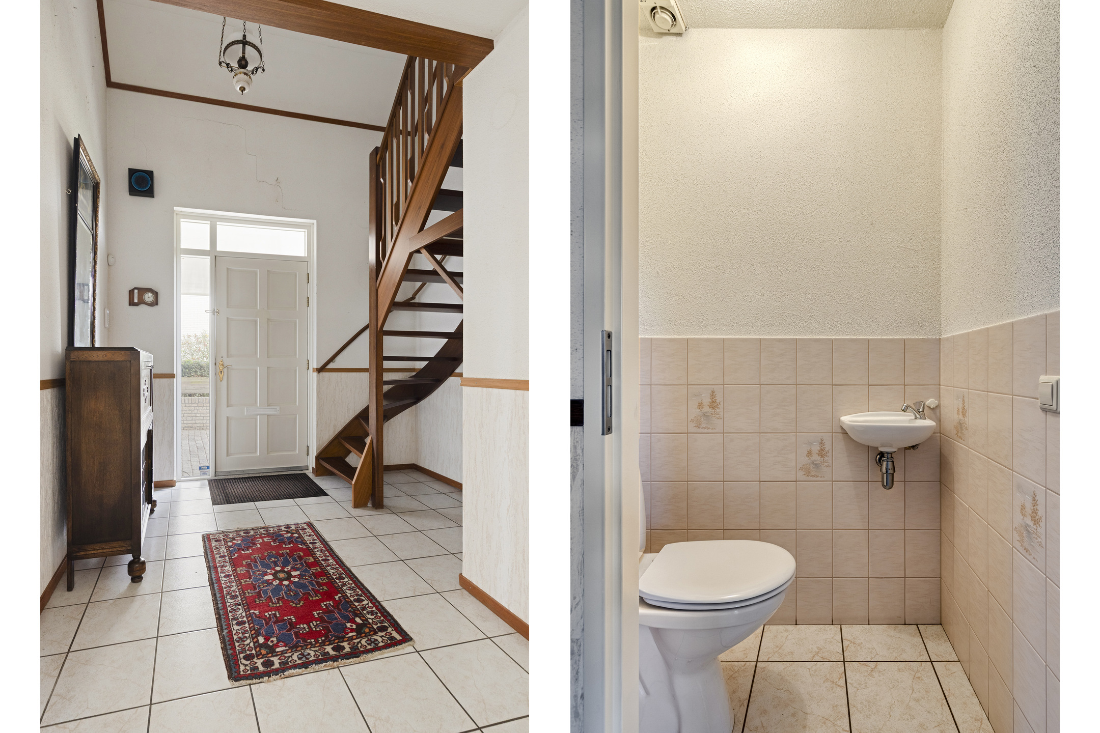 Entree, hal met toilet, trapopgang naar de eerste verdieping en toegang tot de woonkamer en keuken.