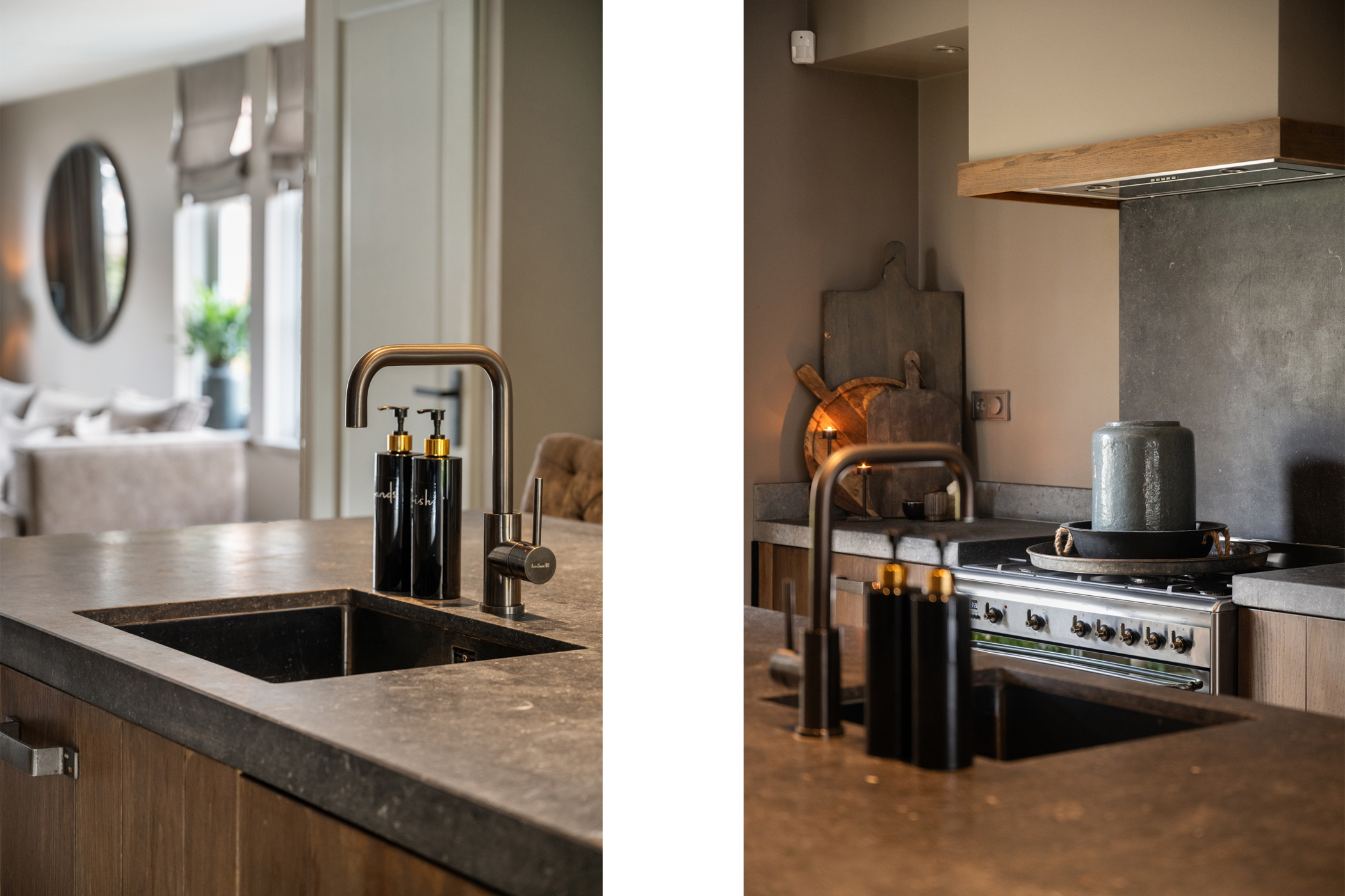 Aan de voorzijde van de woning bevindt zich de moderne keuken met groot kook- en spoeleiland, uitgerust met hoogwaardige inbouwapparatuur zoals een apothekerskast, spoelbak, gasfornuis, afzuigkap, heteluchtoven, koelkast en vaatwasser.