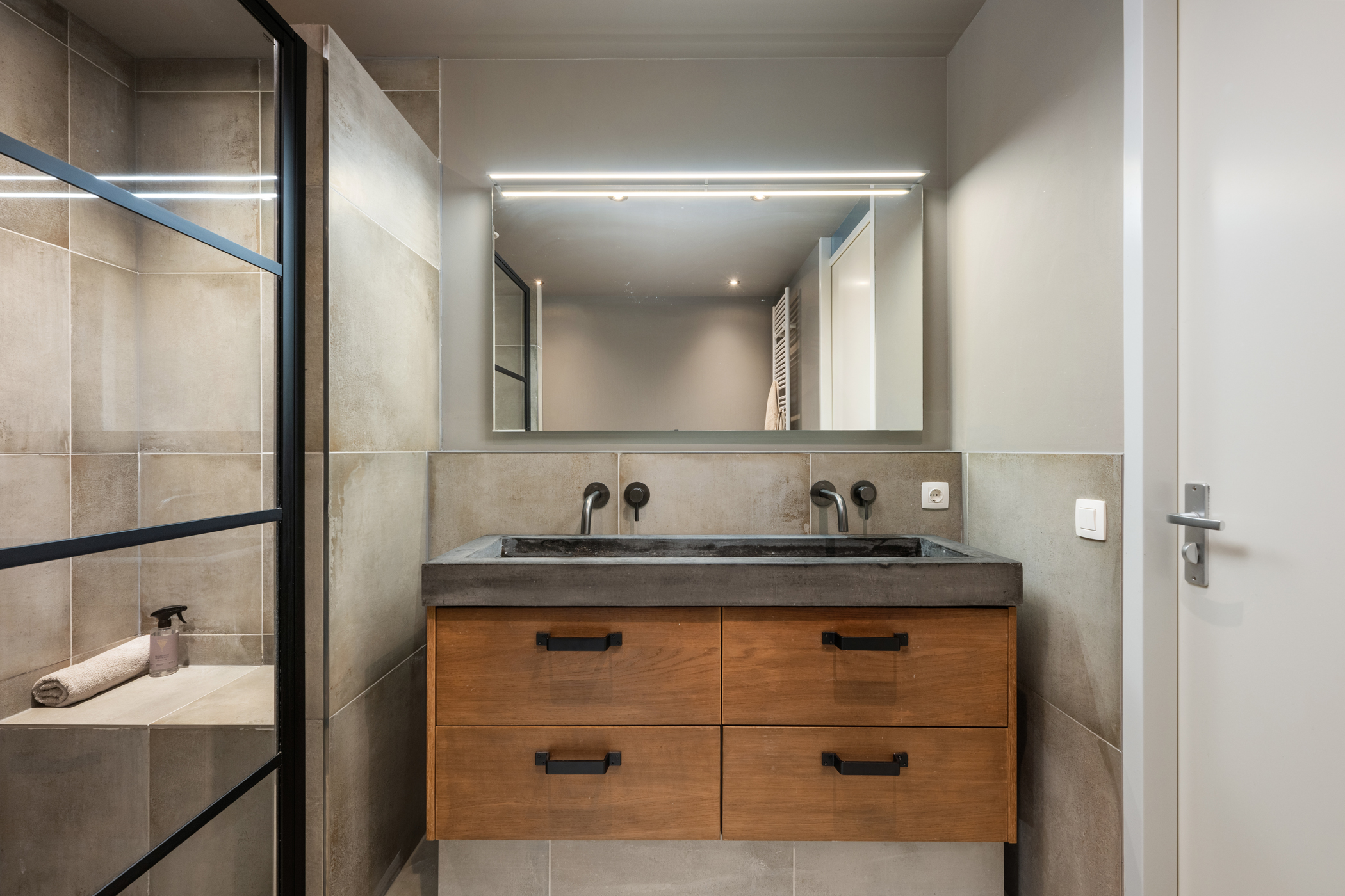 De overloop is voorzien van een houten vloer en geeft toegang tot een de toiletruimte. Aan de achterzijde van de woning bevinden zich twee slaapkamers, aan de voorzijde één slaapkamer. De volledig betegelde badkamer is luxe uitgevoerd met een inloopdouche, ligbad, badkamermeubel met dubbele wastafel, grote spiegel en handdoekradiator.