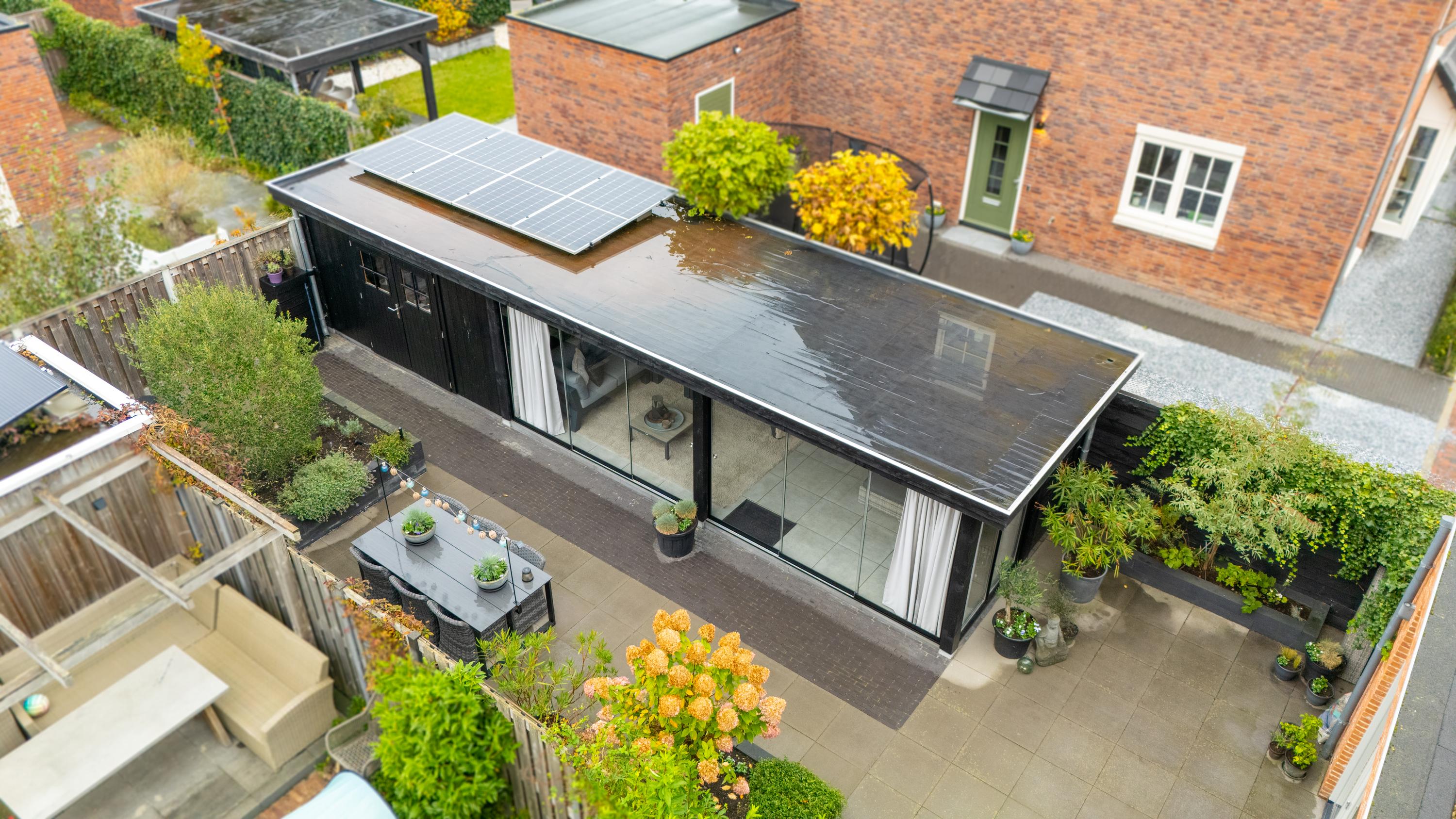 In deze zonnige tuin bevindt zich een sfeervolle overkapping met glazen pui, voorzien van stroom en internet. De ruimte is volledig geïsoleerd en uitgerust met plintverwarming, waardoor deze het hele jaar door comfortabel te gebruiken is. Bovendien zijn er vier zonnepanelen aanwezig, wat bijdraagt aan een energiezuinige en duurzame inrichting.