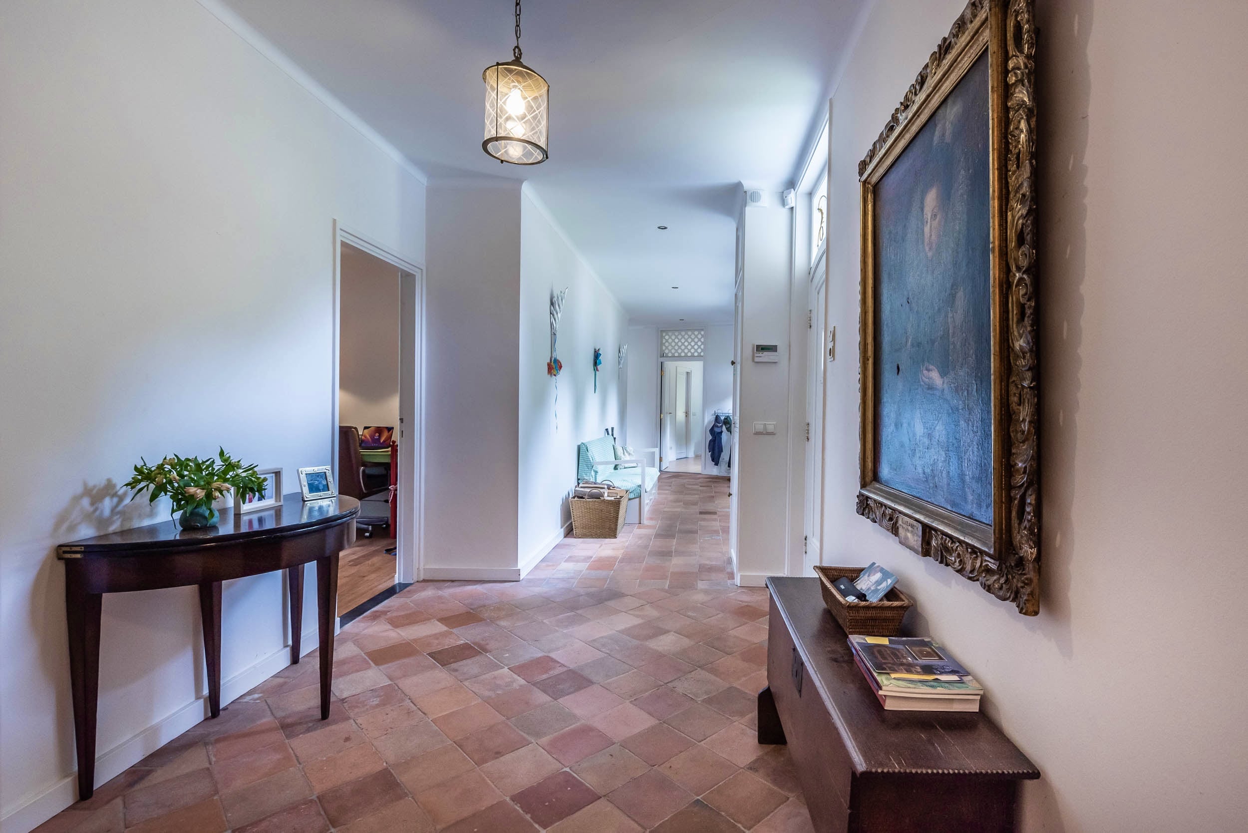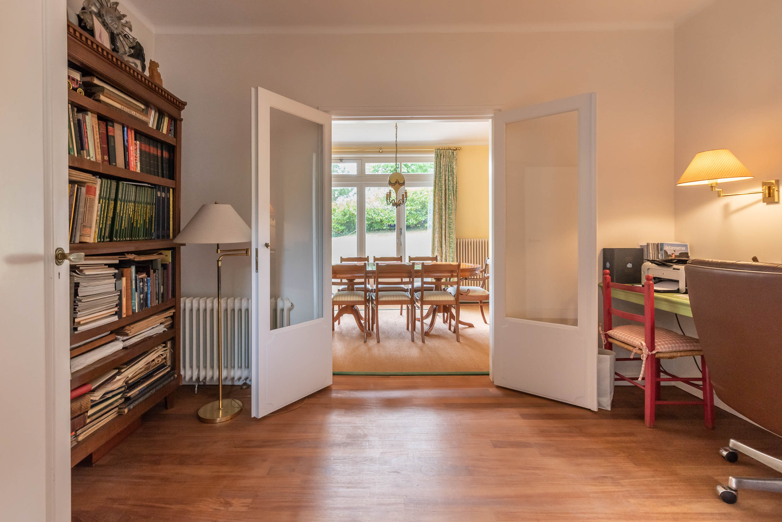 Oorspronkelijk gedeelte: entree, gezellige hal met tegelvloer van Piet Jonker, doorgang naar aparte garderobe en wc met fonteintje. Lichte woonkamer met zicht op de tuin, open haard, parketvloer, op maat gemaakte boekenkast en openslaande deuren naar de prachtige tuin. De woonkamer staat in open verbinding met de eetkamer en een werkkamer die daar weer op aansluit. De gang geeft toegang tot de trap naar de kelder en garage en tot drie slaapkamers en een tweede badkamer. De hoofdslaapkamer heeft een eigen badkamer met bad, dubbele wastafel (meubel) en vloerverwarming en een inloopgarderobe en openslaande deuren naar balkon en tuin.