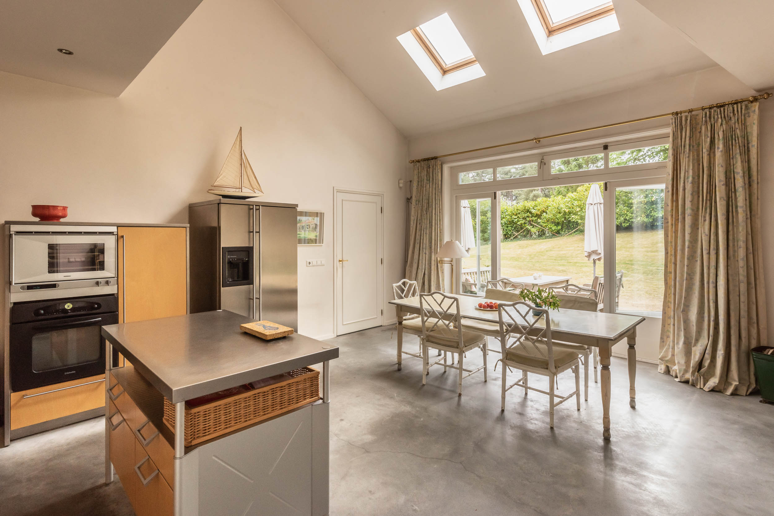Aanbouw 2001: gezellige ruime woonkeuken met hoog plafond, open haard, terrazzovloer met vloerverwarming, openslaande deuren naar het zonnige terras. De Bulthaup keuken met werkeiland is uitgerust met diverse apparatuur, w.o. Gaggenau stoomoven. Diepe voorraadkast/bijkeuken met uitstortgootsteen. Twee slaapkamers die beide aansluiten op de badkamer met wc, bad, inloopdouche en dubbele wastafel (meubel) en vloerverwarming.