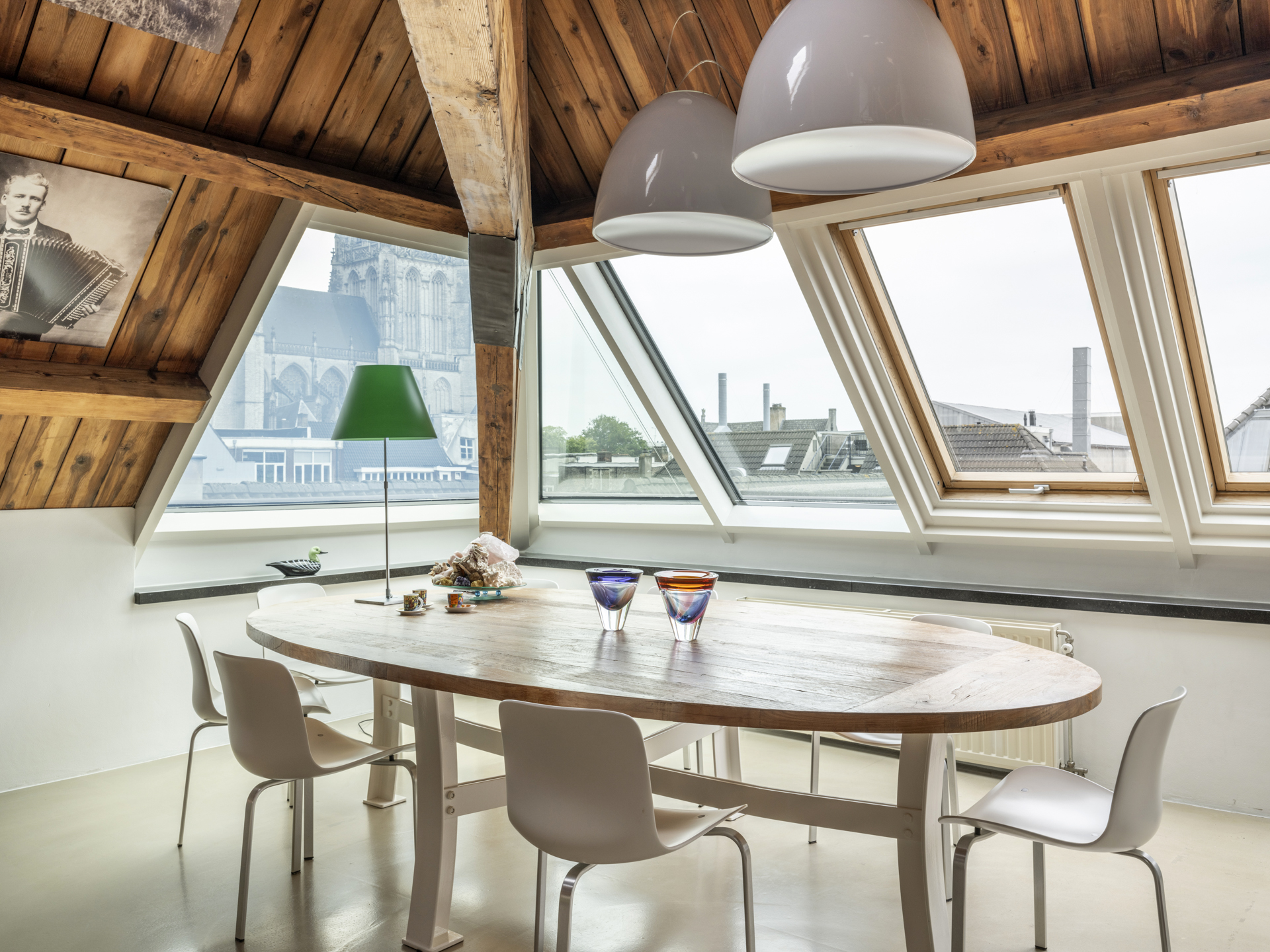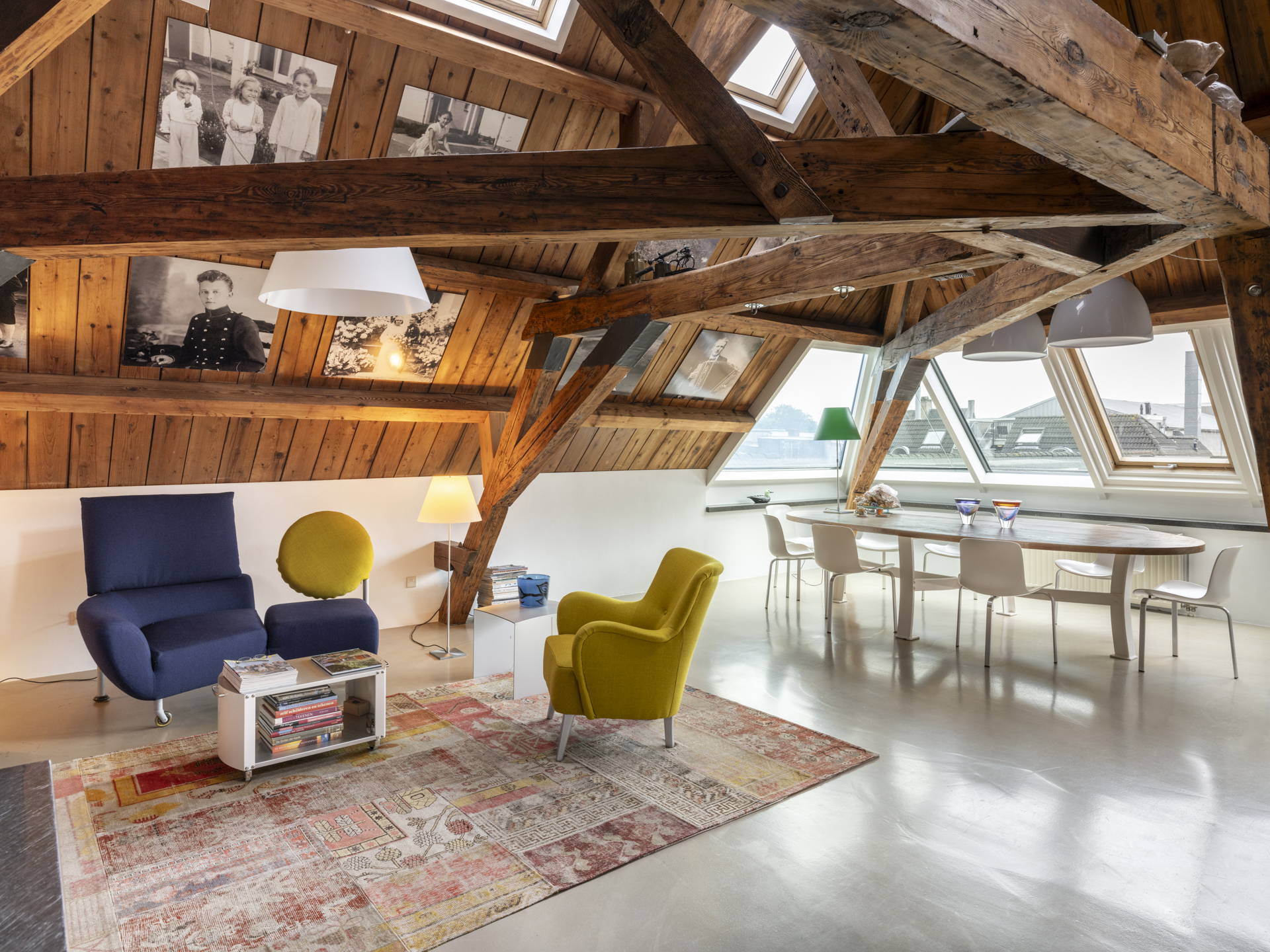 Het appartement onderscheidt zich door zijn bijzondere ligging onder de imposante monumentale kap. Hierdoor ontstaat een karaktervolle en sfeervolle woonruimte, waarbij de indrukwekkende kapconstructie in het gehele appartement zichtbaar is gebleven. De open indeling en de hoge plafonds zorgen bovendien voor een ongeëvenaard gevoel van ruimte en licht.