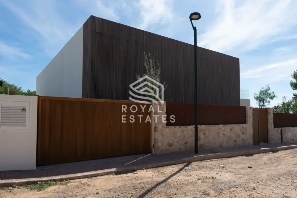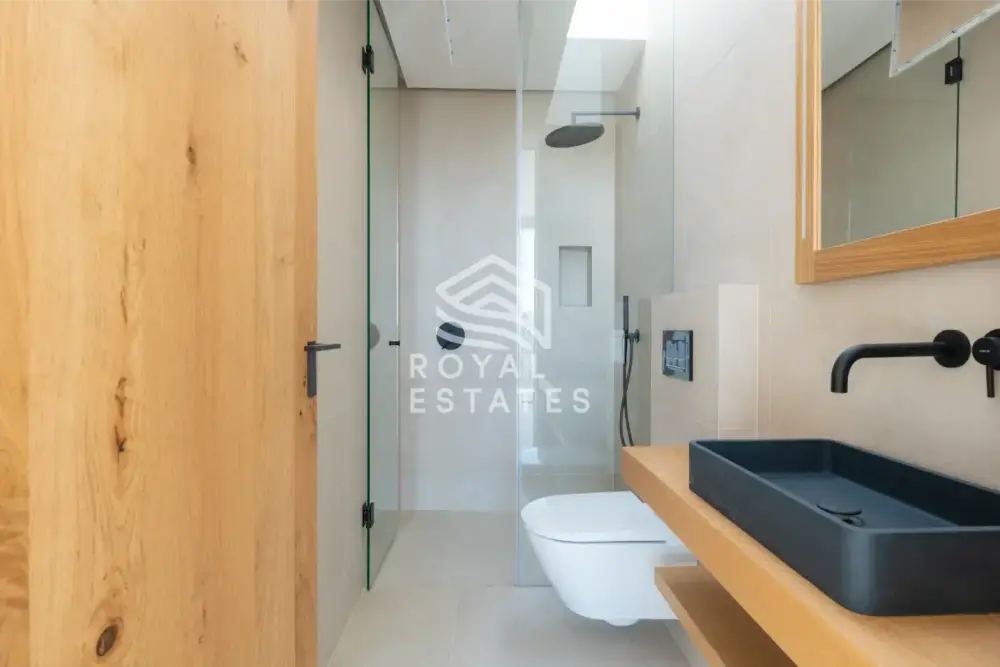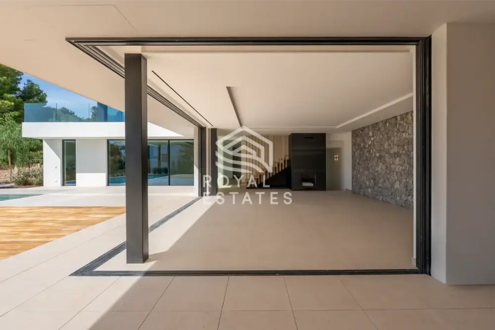De open begane grond beschikt over een riante woonkamer en keuken, direct grenzend aan de tuin en het zwembad. Op de bovenverdieping bevinden zich zes slaapkamers, elk met een eigen badkamer en ingebouwde garderobekasten, en allemaal met uitzicht op zee en Dalt Villa, waarmee de unieke ligging op Ibiza wordt onderstreept. Moderne afwerkingen omvatten vloerverwarming, centrale airconditioning en een indrukwekkend souterrain van 172,87 m², ideaal voor een thuisbioscoop, fitnessruimte of gastenappartement.