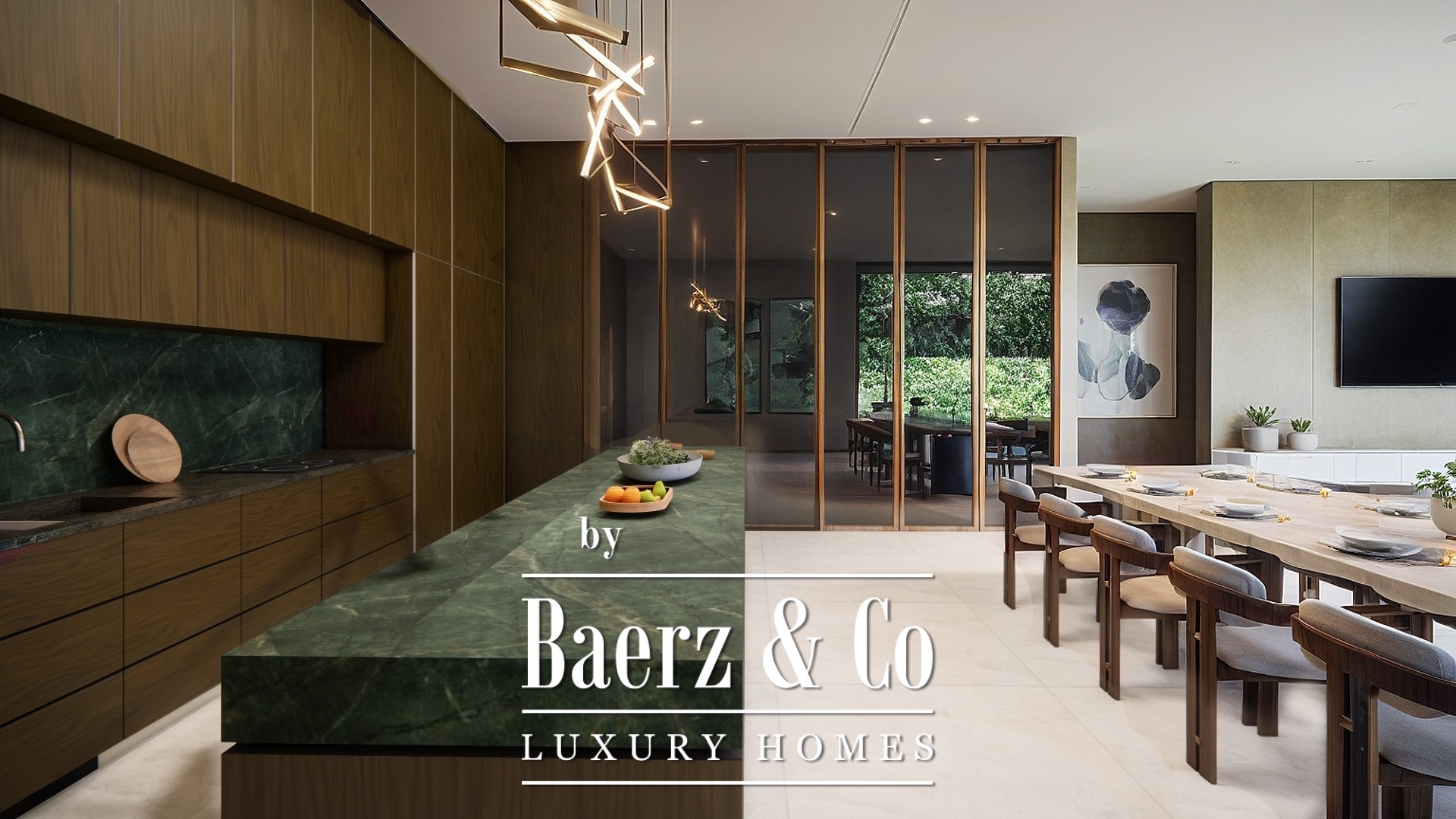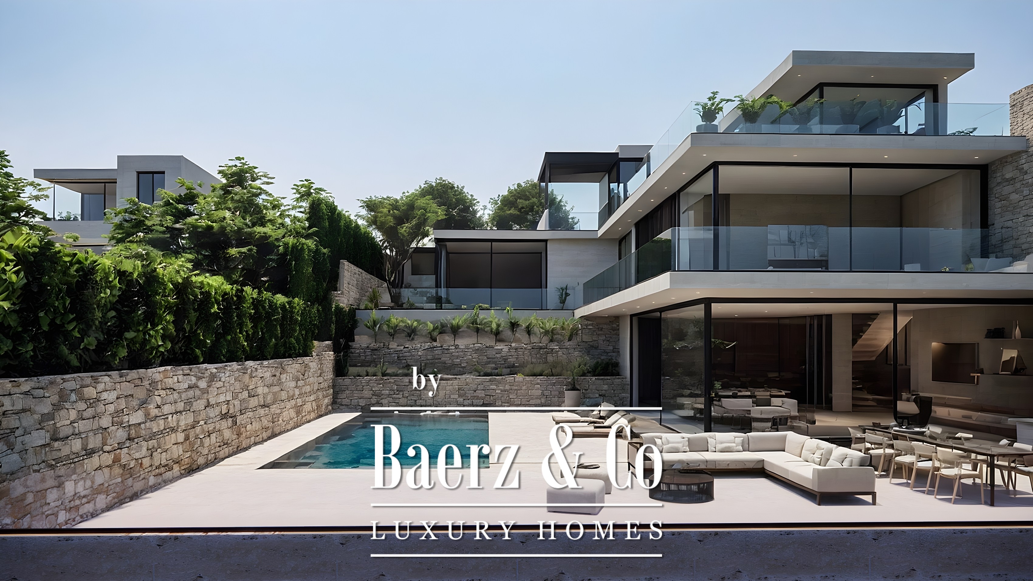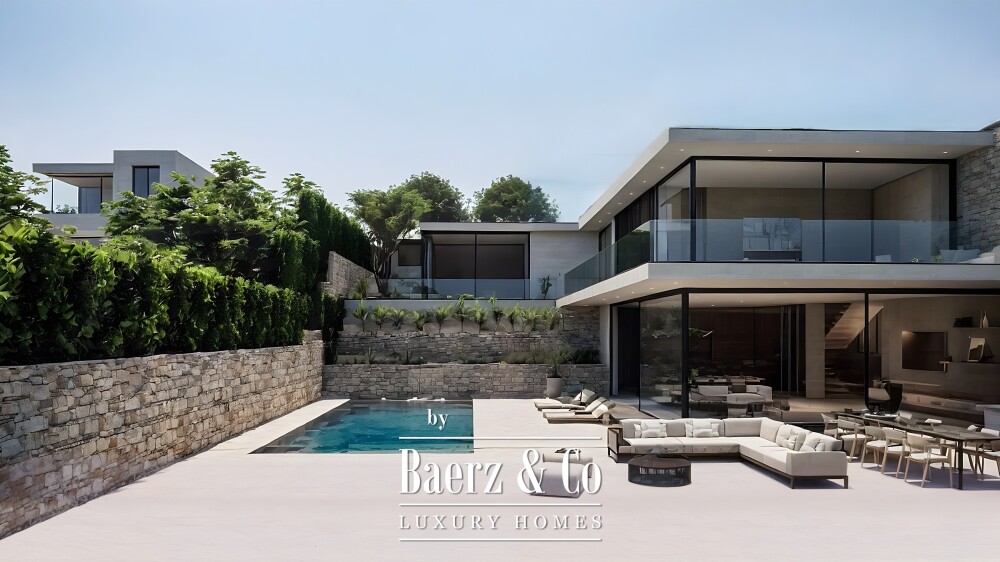 De villa strekt zich uit over vier verdiepingen. De garage van 120 m² biedt plaats aan zes auto’s en beschikt over een technische ruimte, met een lift die alle niveaus met elkaar verbindt. De begane grond verwelkomt u met een lichte woon- en eetkamer gericht op zee, een moderne open keuken, en een naadloze overgang naar een royale tuin met zwembad, ideaal voor ontspannen of stijlvol buitenleven. Een slaapkamer met dressing en privébadkamer plus een gastentoilet completeren deze verdieping.