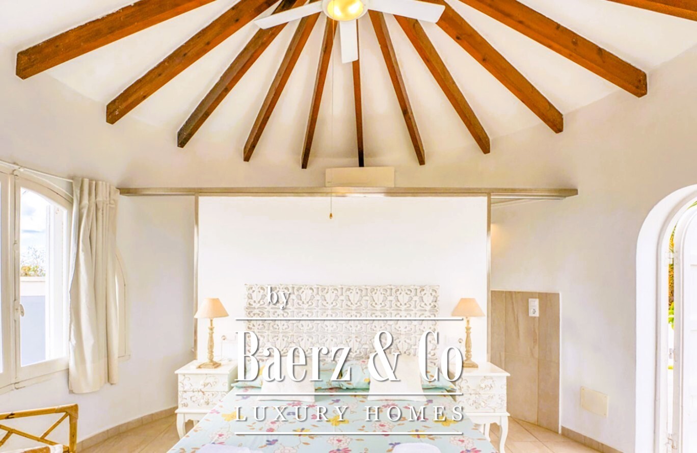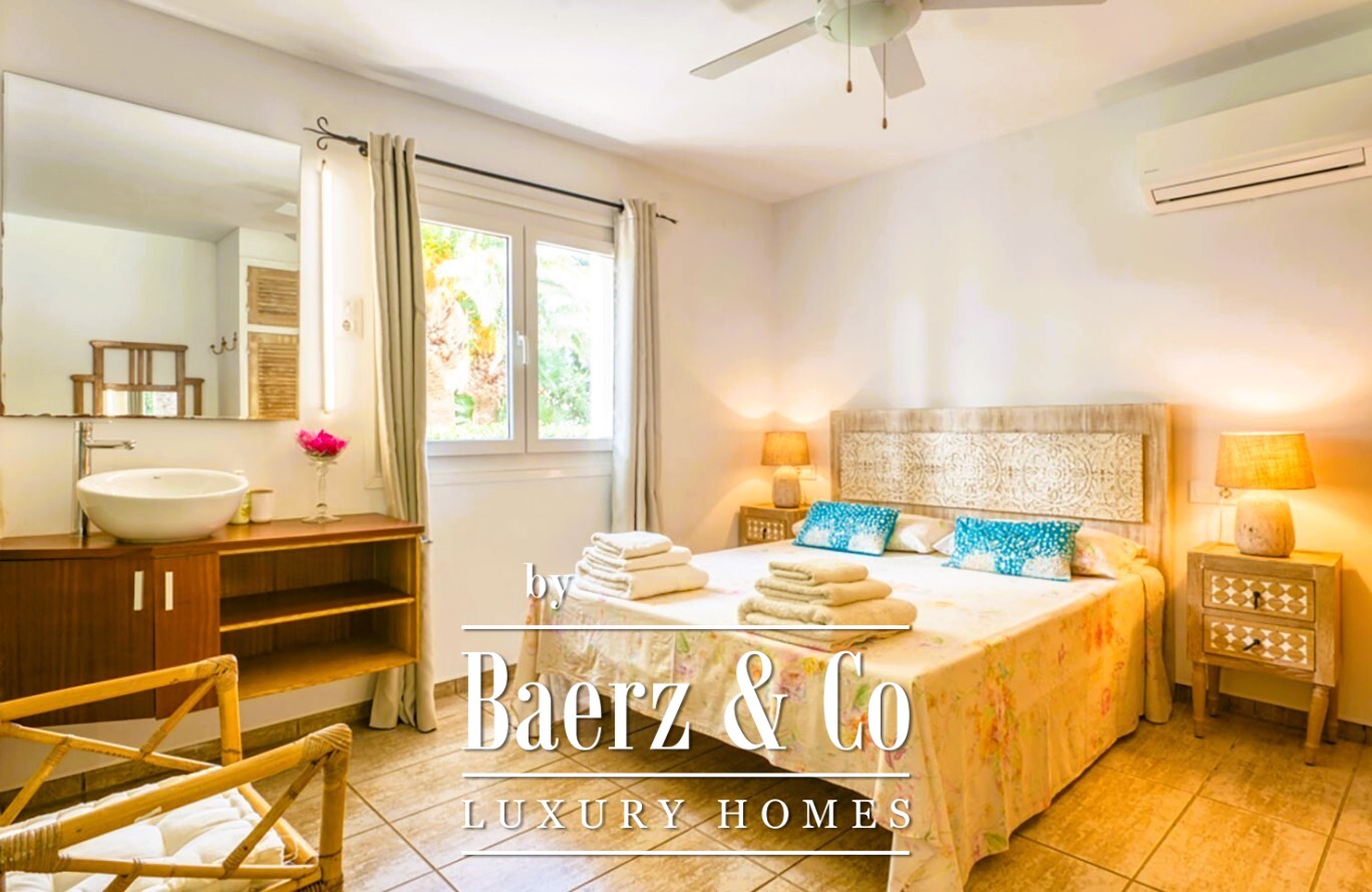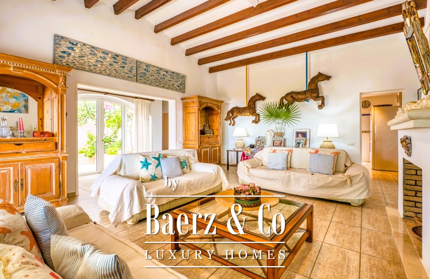 De hoofdwoonkamer van de villa omlijst een prachtig uitzicht op de tuin en wordt voorzien van zacht daglicht dankzij de binnenpatio. Koude avonden worden verwarmd door een grote open haard. Buiten is de aangelegde tuin zorgvuldig ingedeeld voor zowel samenzijn als rust. Er is een schaduwrijk solarium onder een royale pergola, een sfeervolle barbecueplek en een ontbijthoek die uitkijkt over de horizon en de zee.