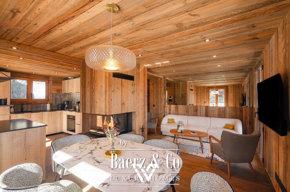 Chalet Combloux met uitzicht op de Mont Blanc is een uitzonderlijke residentie die met grote zorg en aandacht voor milieuvriendelijkheid opnieuw is vormgegeven. Dit volledig gerenoveerde chalet van 147 m² is gerealiseerd met hoogwaardige, milieuvriendelijke materialen en combineert verfijnde afwerking met voelbare warmte, gelegen op een perceel van 785 m² in deze befaamde alpine omgeving.