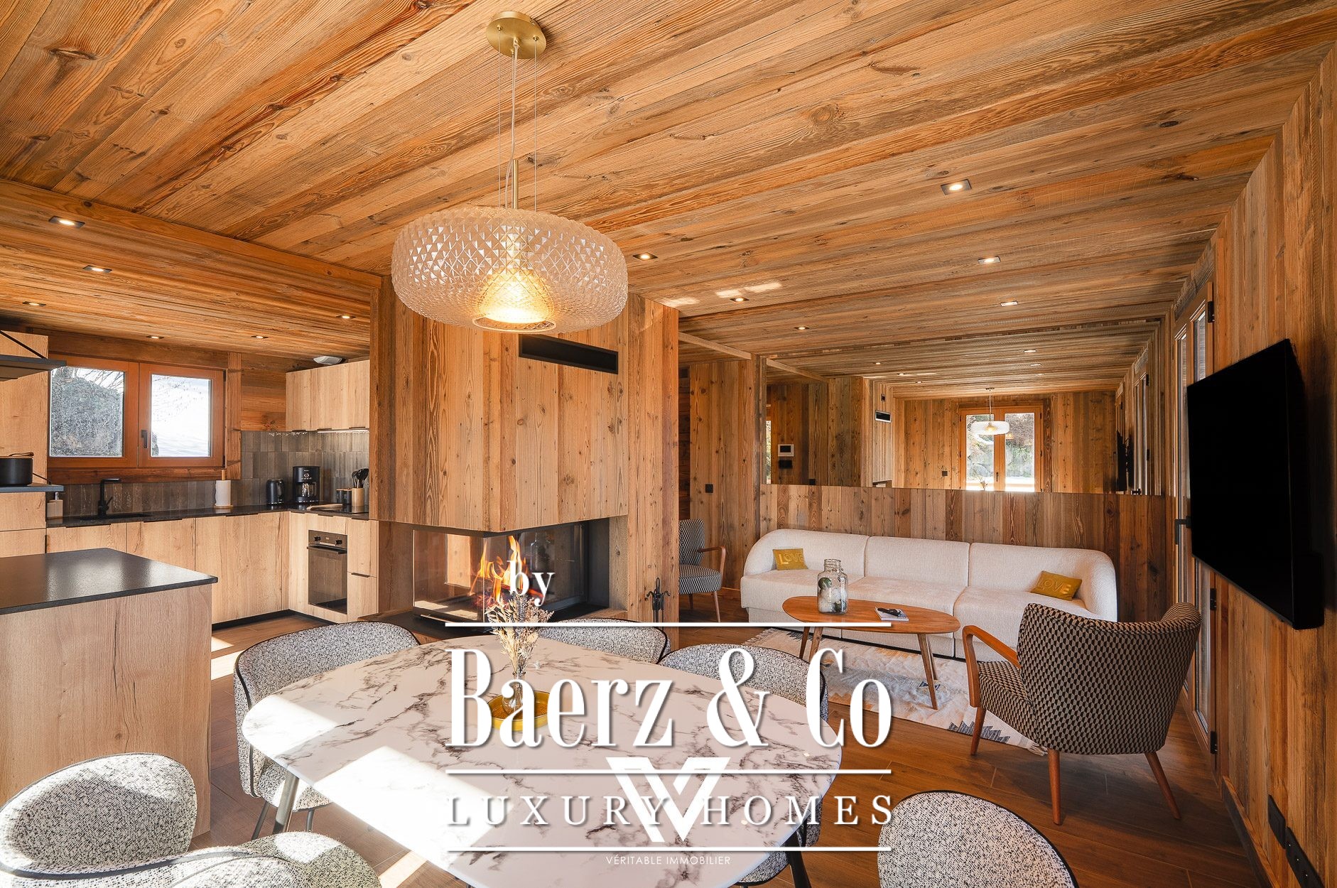 Het interieur is volledig samengesteld door een interieurontwerper, wat zorgt voor ingetogen luxe en een gastvrije sfeer. De indeling beschikt over een woonkamer met open haard, een volledig uitgeruste keuken en drie slaapkamers met elk een eigen badkamer, waarmee privacy en comfort gewaarborgd zijn. Buiten nodigen het terras, het balkon en de tuin uit tot ontspannen momenten met uitzicht op de Mont Blanc.