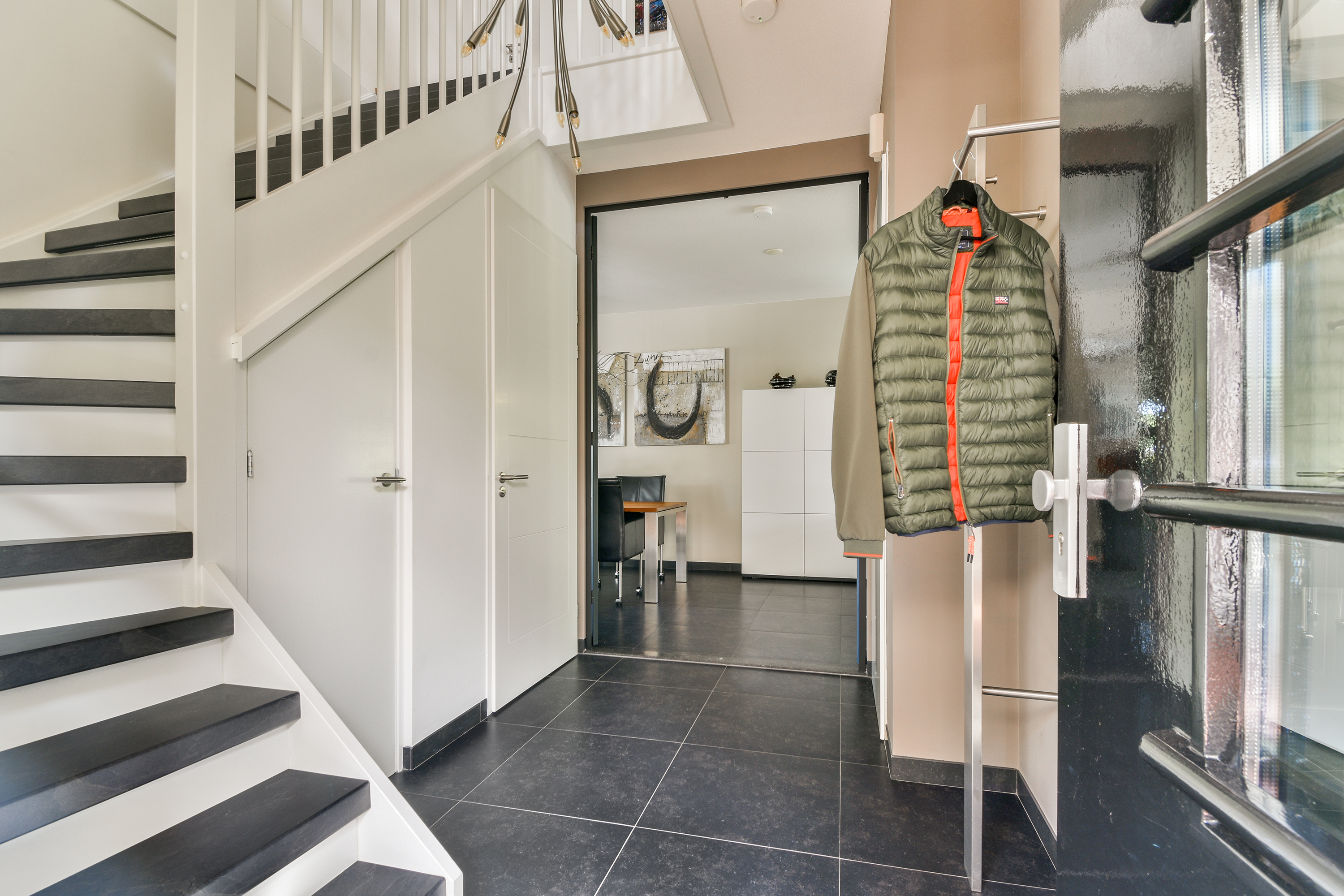 Via de stijlvolle entree met hoge raampartijen betreedt u de opvallend goed onderhouden woning. De ontvangsthal is ruim en licht en biedt toegang tot een luxe toiletruimte, een praktische garderobekast, de meterkast (met 14 groepen en 4 aardlekschakelaars) en een moderne trapopgang naar de verdiepingen.