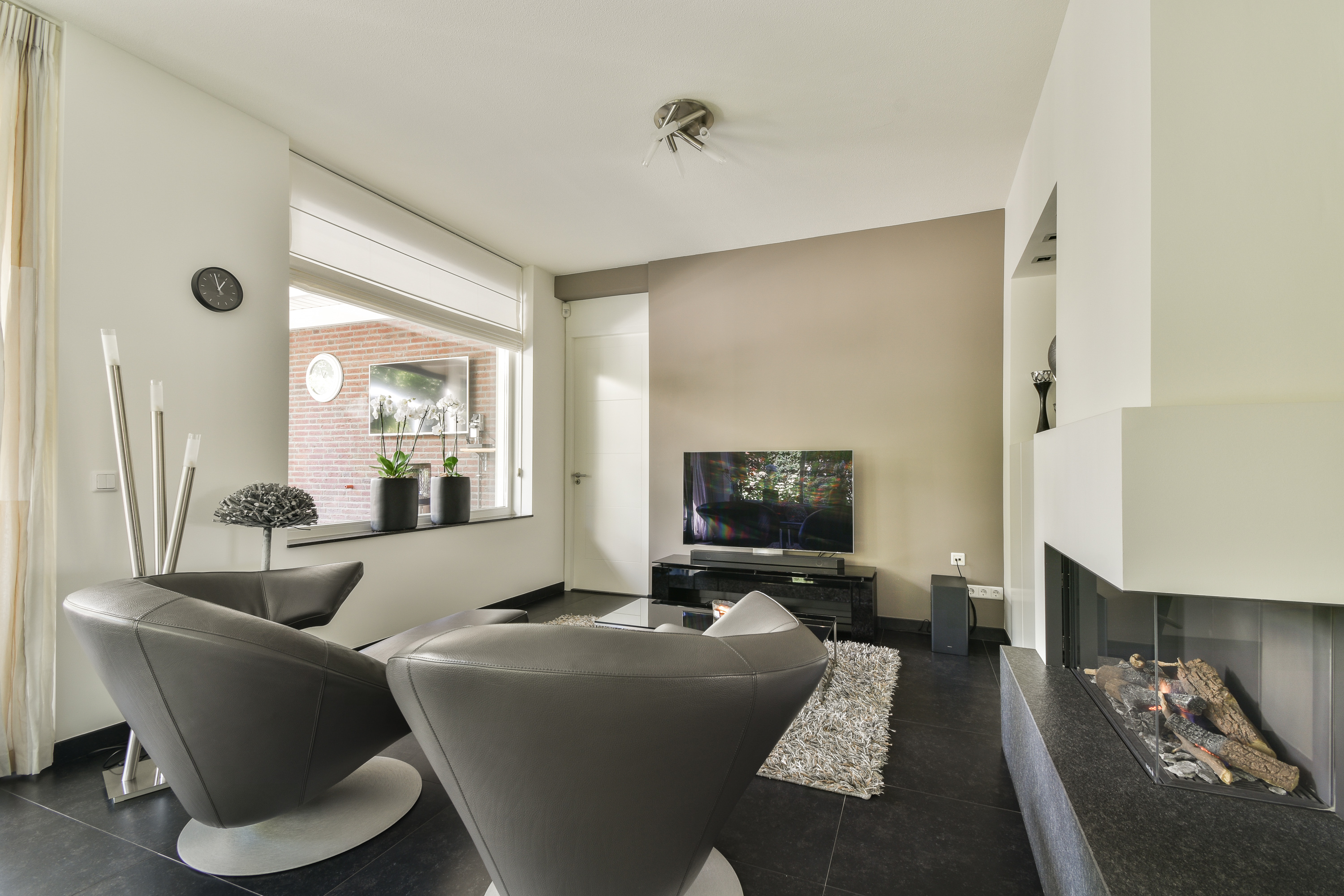 Via dubbele zwart stalen deuren komt u in de living, waar ruimte en sfeer naadloos samenkomen. De woonkamer is verdeeld in een eetgedeelte dat keuken met woonkamer verbindt en een zitgedeelte aan de achterzijde met sfeervolle haard, toegang tot de aanbouw en via dubbele deuren toegang tot de serre (ca. 3,41 x 6,25 m.) en tuin.