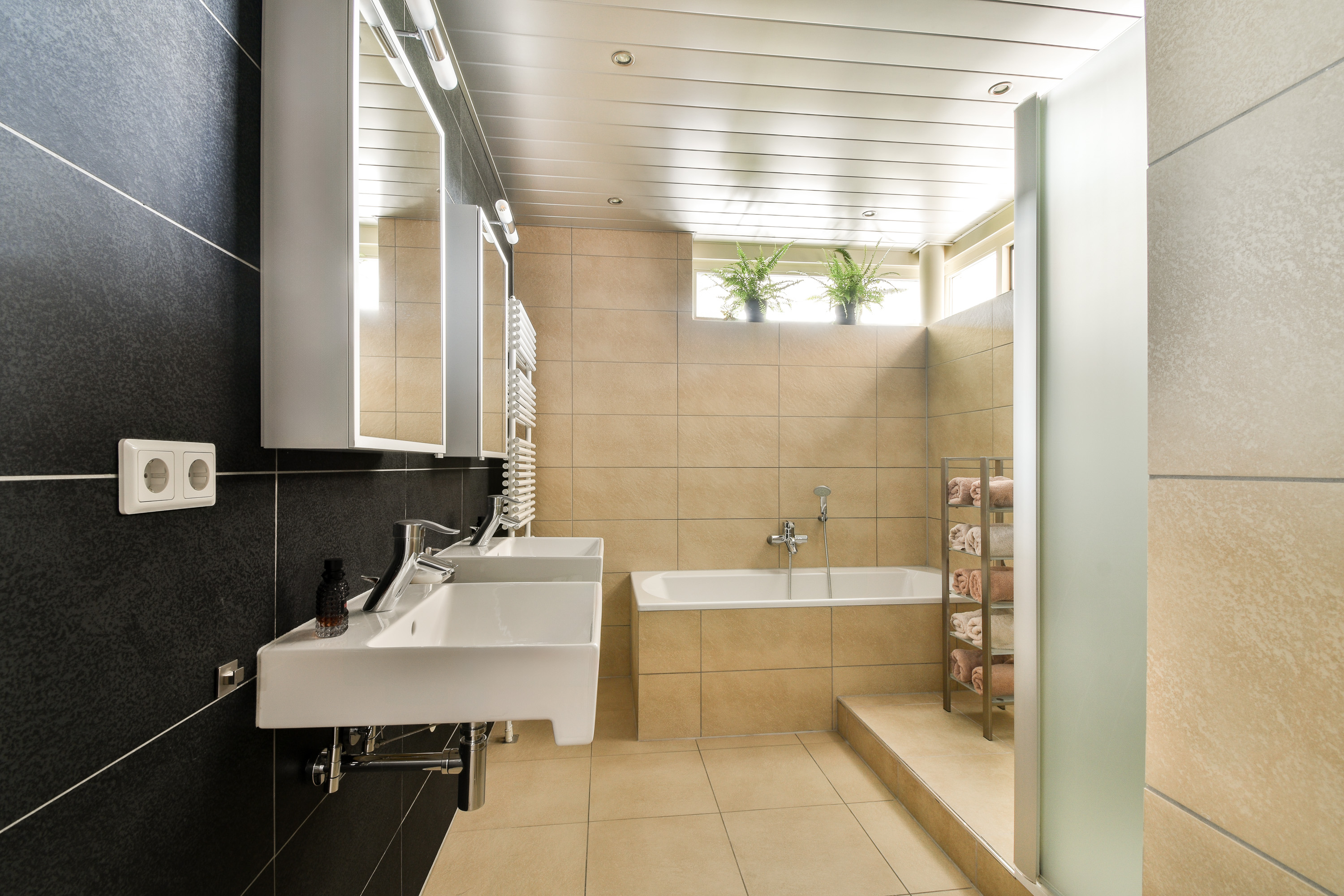 De badkamer is luxe uitgevoerd met fraai tegelwerk, te openen raam en kwalitatief hoogstaand sanitair (Villeroy & Boch), zoals een ligbad, een dubbele wastafel, een douchegelegenheid en een designradiator.