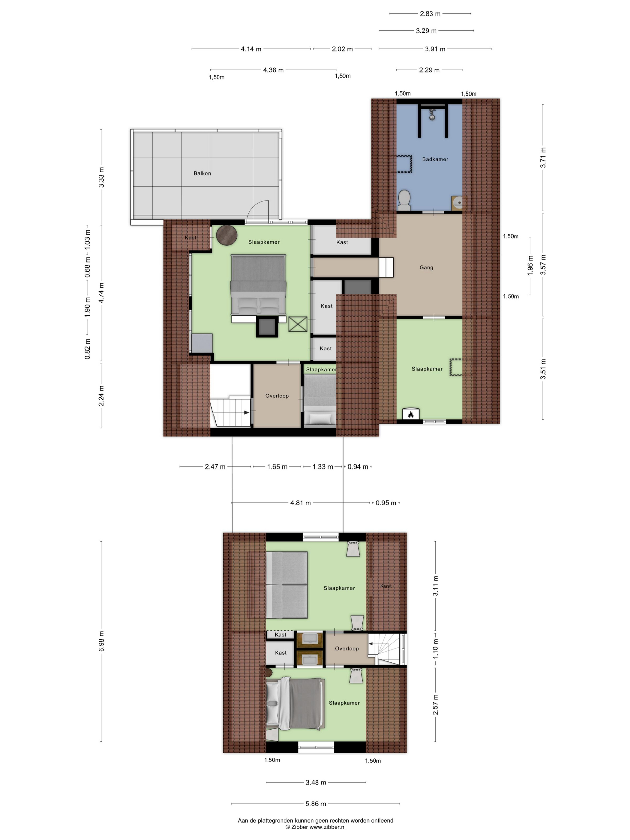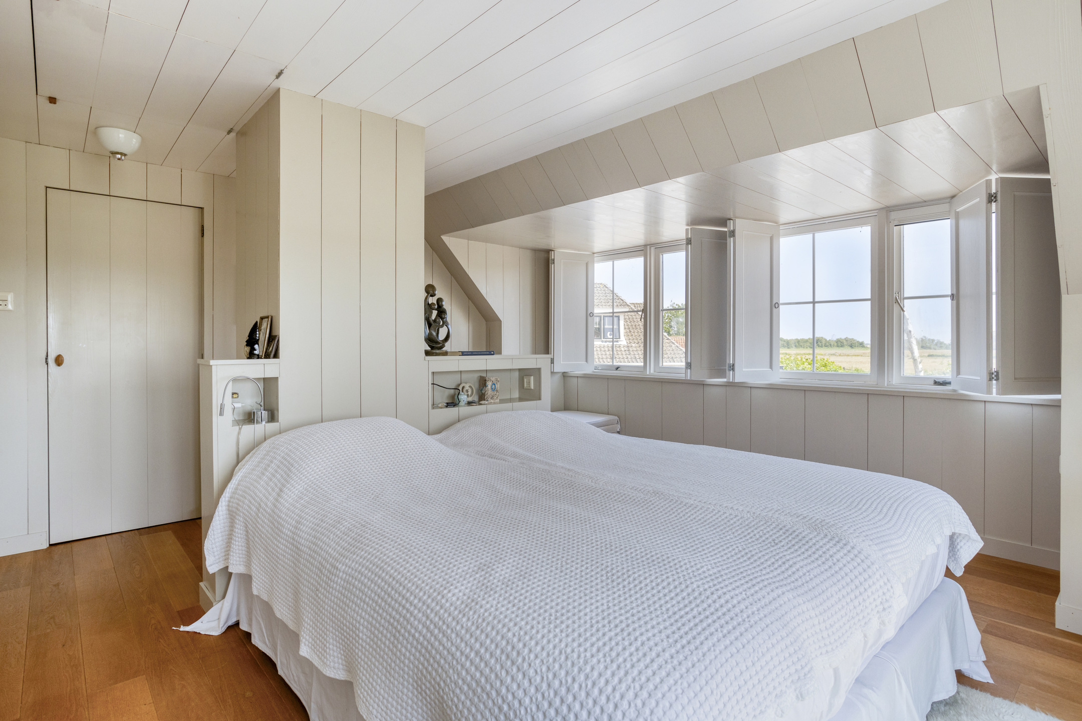 De eerste verdieping is verdeeld over het voorhuis en het achterhuis. In het voorhuis vind u twee ruime slaapkamers, elk voorzien van bergruimte achter de knieschotten. In het achterhuis leidt een brede trap naar een sfeervolle overloop, waar een charmante bedstee is ingebouwd, een unieke toevoeging dat kinderen zeker zal aanspreken. Vanuit hier bereikt u de royale master bedroom, voorzien van ingebouwde kastenwanden, een bergvliering en openslaande deuren naar een ruim dakterras met vrij uitzicht over het omringende landschap.