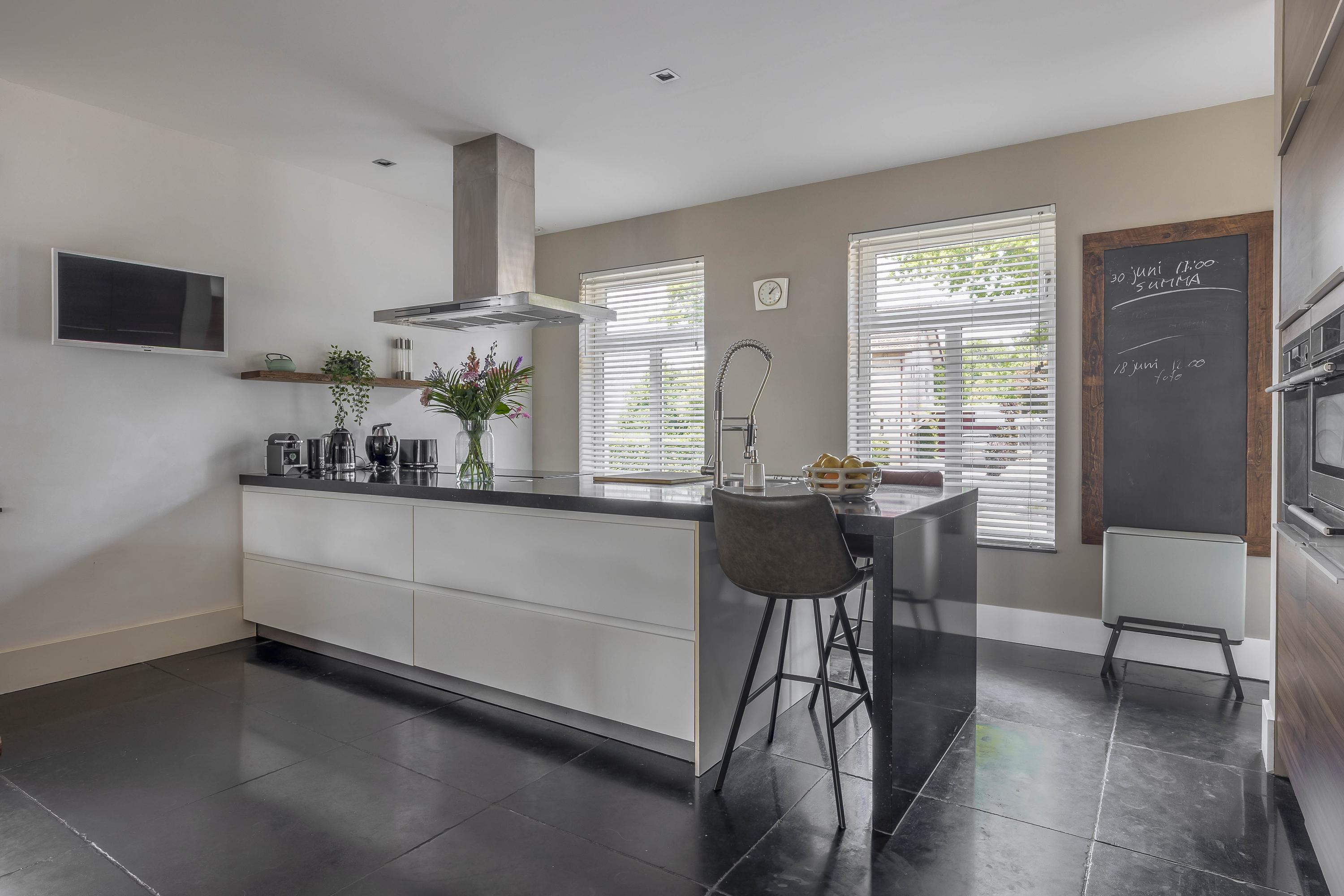 Via de ruime entree met fraaie tegelvloer, modern toilet en uitgebreide meterkast, kom je binnen in de leefkeuken aan de voorzijde van de woning. Deze stijlvolle en complete keuken is het hart van het huis en beschikt over een kookeiland, luxe apparatuur en veel werkruimte. Dankzij het verhoogde vloerniveau heb je een prachtig uitzicht over de straat.