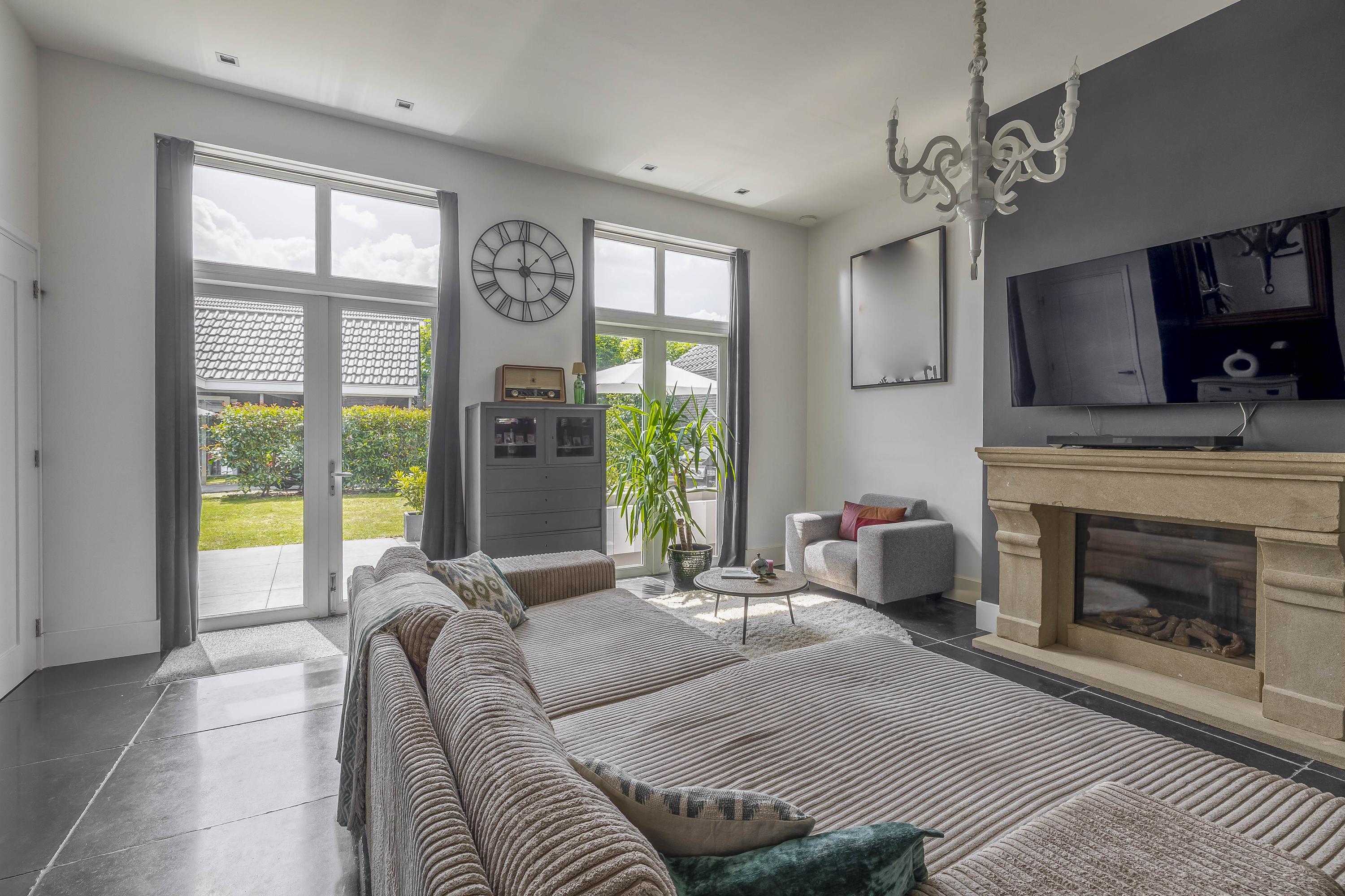 Een korte trap leidt naar de sfeervolle, royale woonkamer met indrukwekkende plafondhoogte van 3,5 meter. Grote ramen en dubbele tuindeuren zorgen hier voor een zee aan licht en directe verbinding met de tuin. Een zandstenen schouw met sierhaard maakt het plaatje compleet. Grenzend aan de woonkamer vind je een praktische speel- of werkkamer met ingebouwde kastenwand – ideaal voor kinderen of als thuiskantoor.
