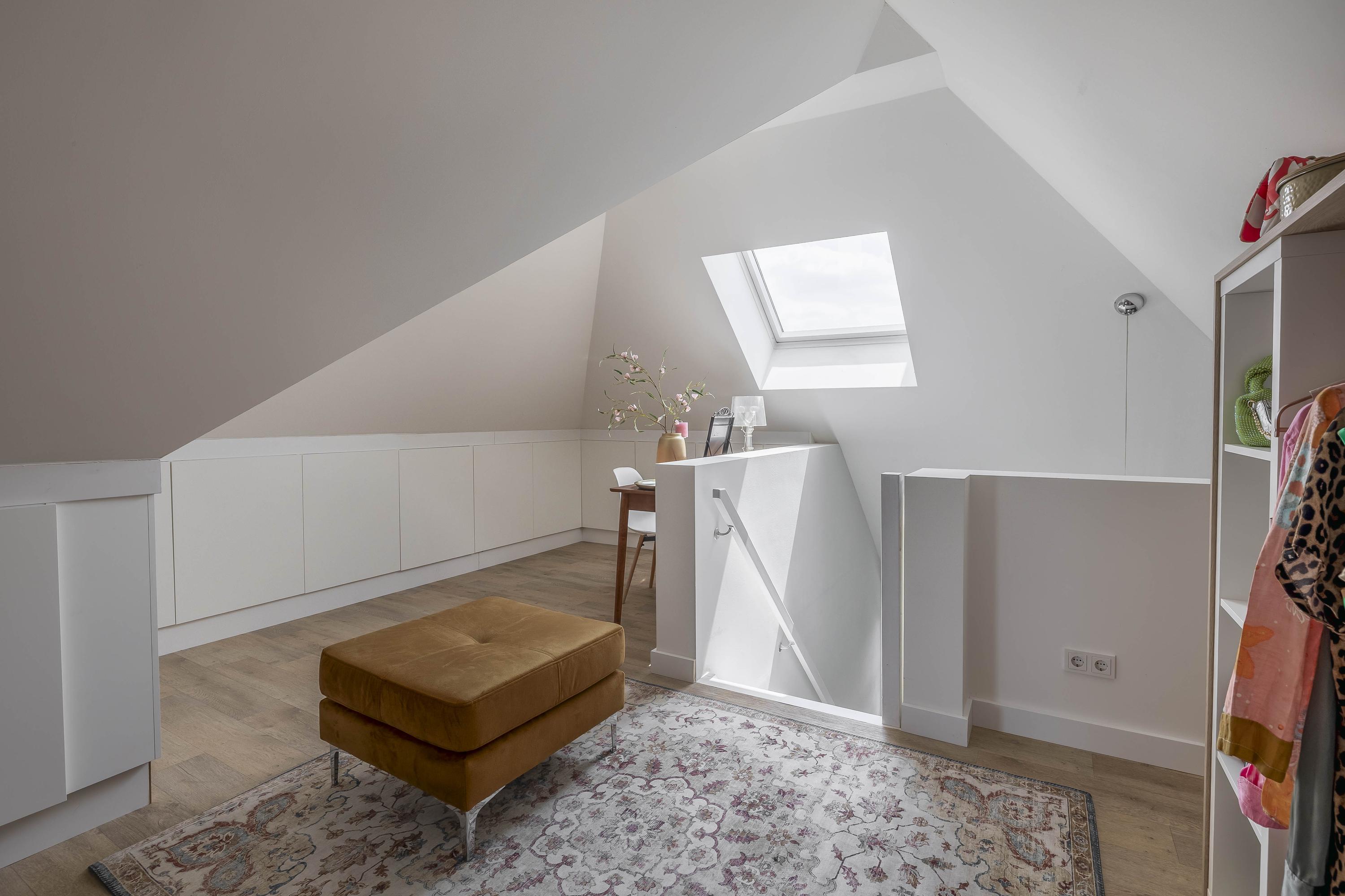 De zolderverdieping is zowel bereikbaar vanaf de overloop als vanuit de masterbedroom. De verdieping is voorzien van een vinylvloer, drie Velux dakvensters en bestaat uit twee ruime, multifunctionele gedeeltes met volop bergruimte onder de schuinte van het dak. Ideaal als kleedkamer, werk- of hobbyruimte.
