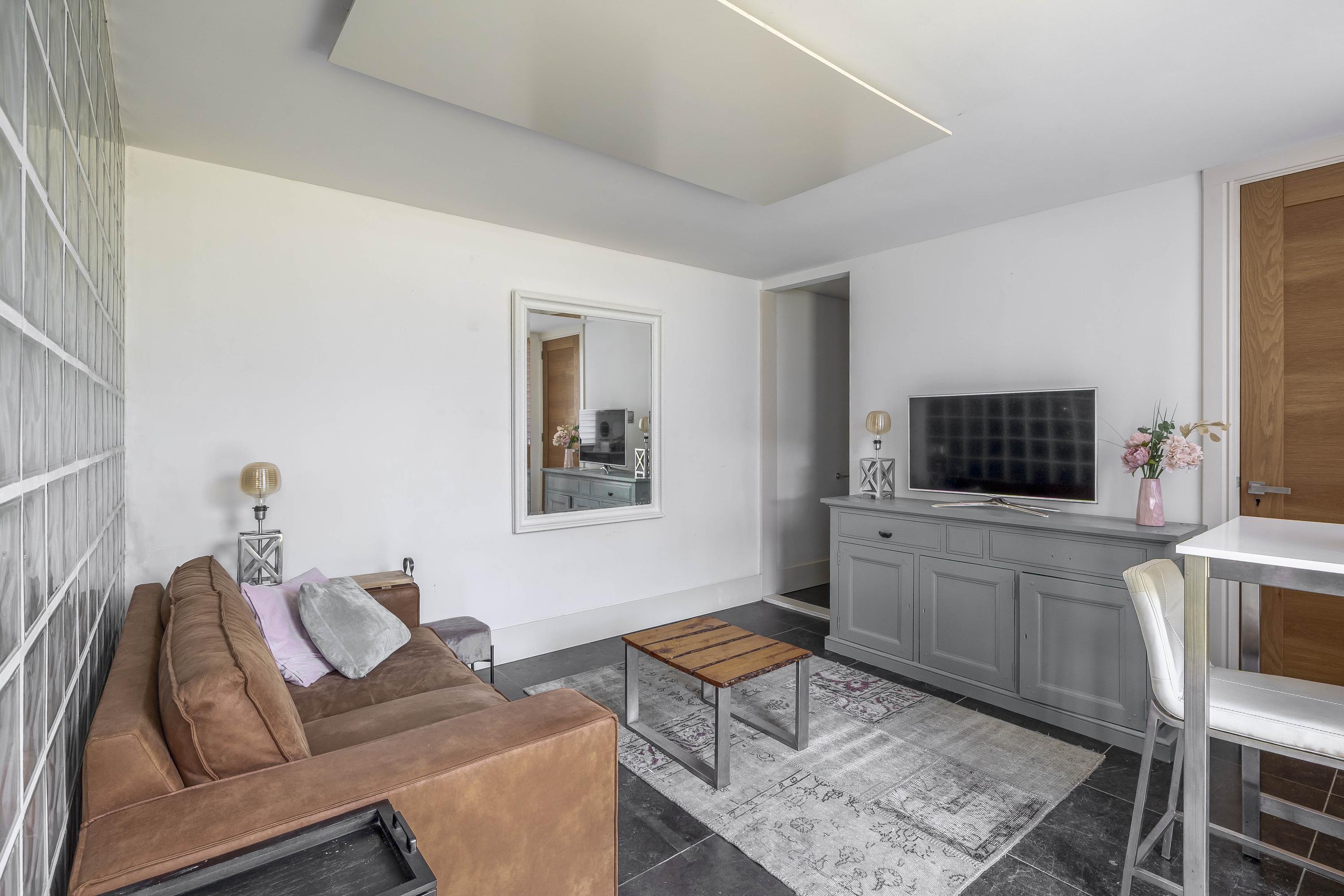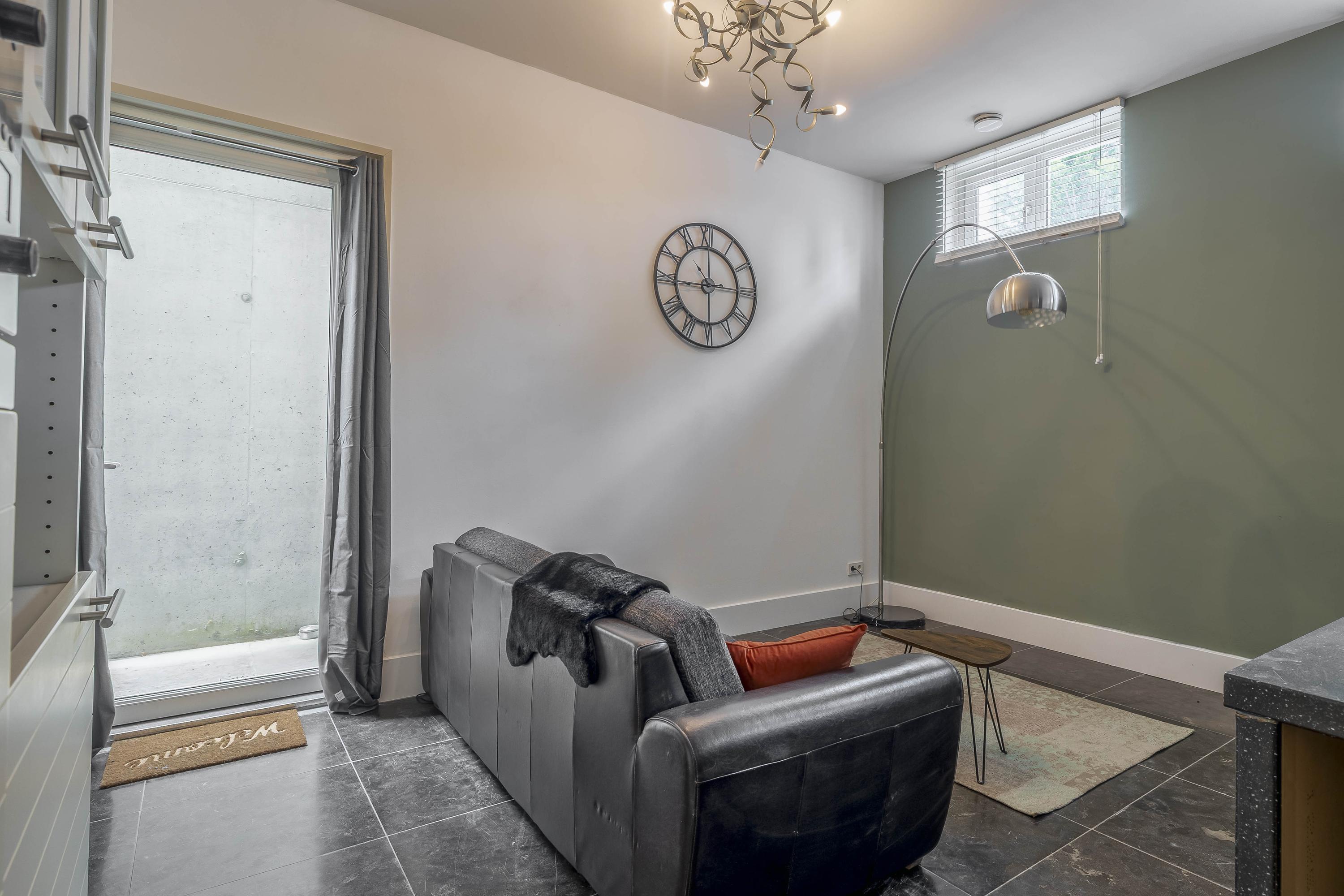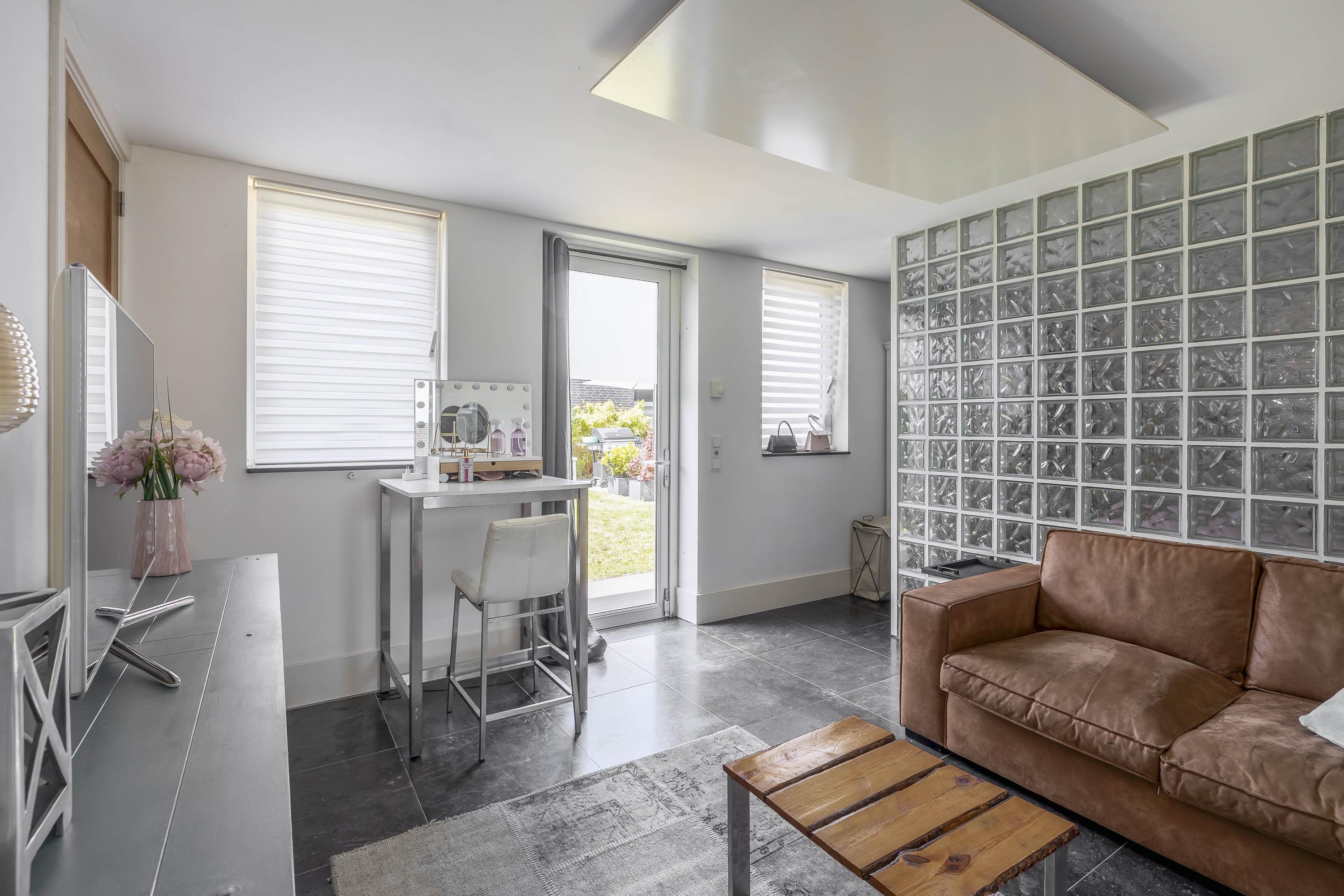 Een afsluitbare deur leidt naar het tweede gedeelte van het souterrain, dat tevens via een vaste trap aan de rechterzijde van de woning bereikbaar is. Dit verrassend ruime en fraai afgewerkte tweede woongedeelte is een volwaardige leefruimte met talloze gebruiksmogelijkheden.