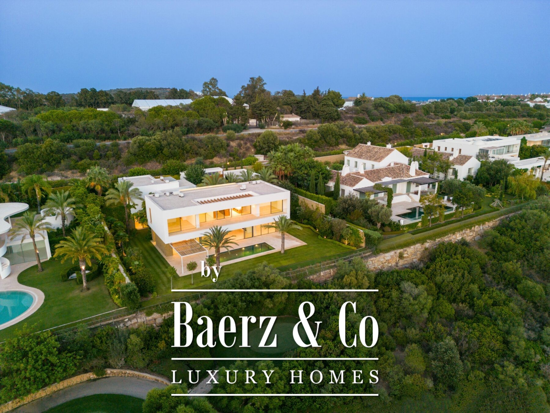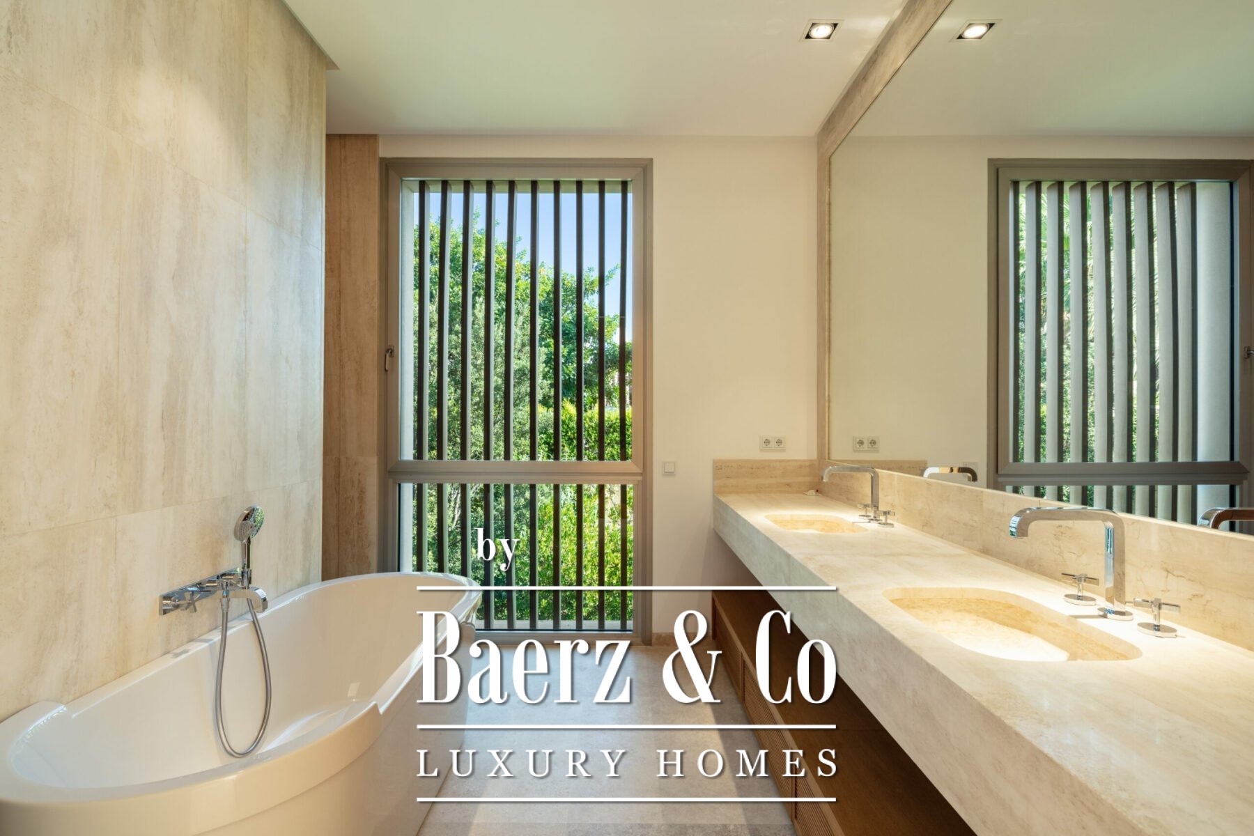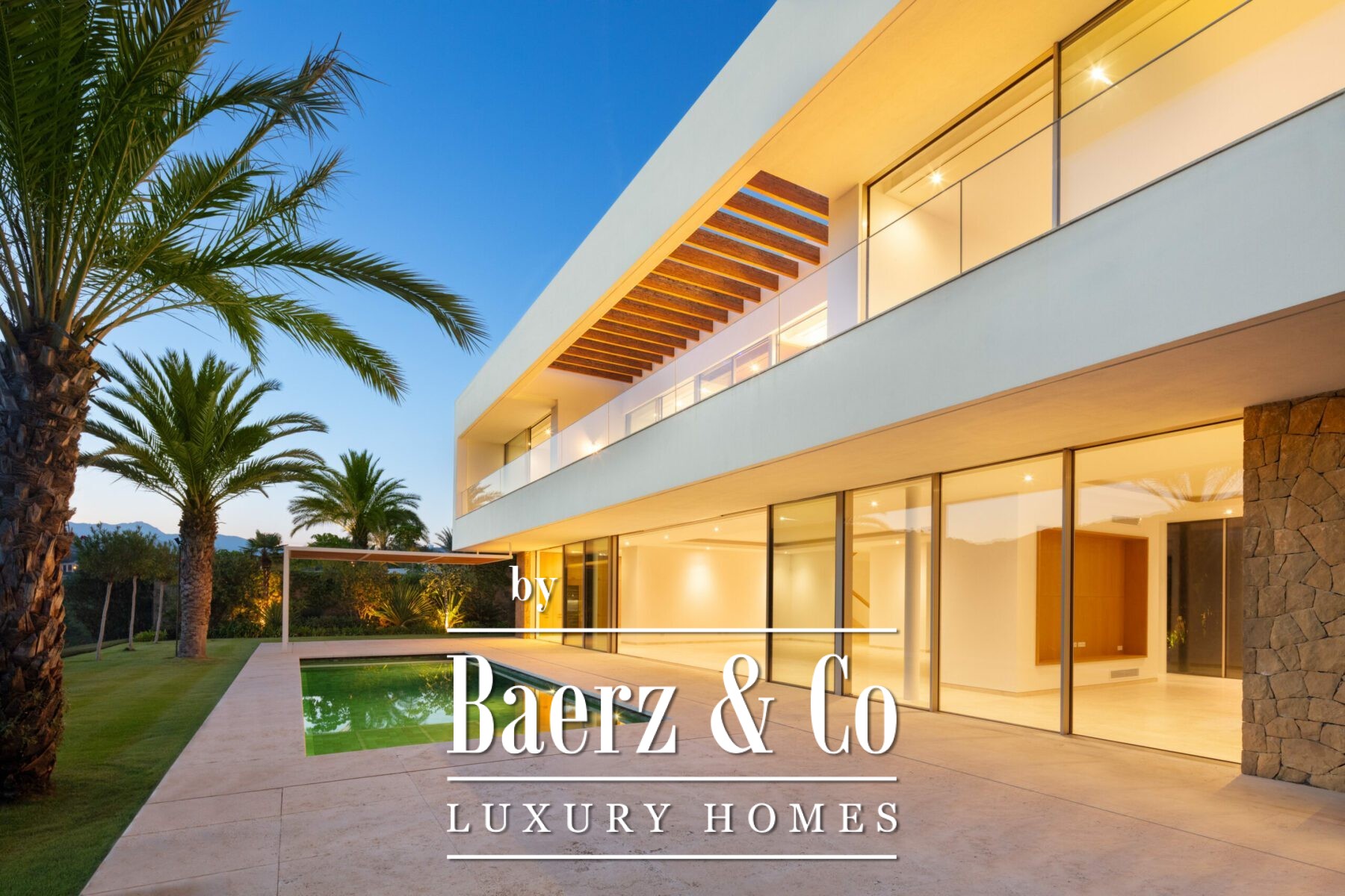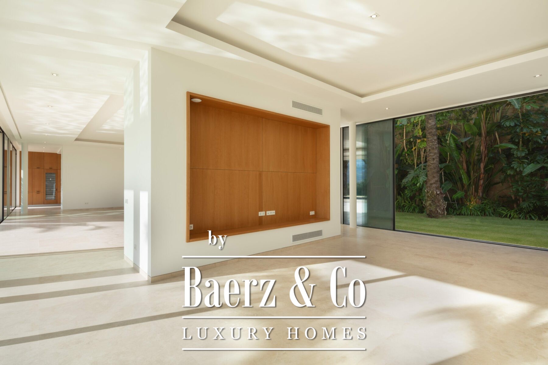 This exquisite villa, nestled beside the golf course, presents an extraordinary opportunity for residents to immerse themselves in the lavish Mediterranean lifestyle. Poised within the famous golf resort, this residence affords sweeping vistas of the lush fairways and the Mediterranean Sea. The architectural brilliance shines through, lending the home a modern allure that epitomises luxury. Set upon an expansive plot, the villa welcomes guests with a captivating entrance adorned with a picturesque lake and meticulously landscaped gardens. Spanning two levels, the four bedrooms are located on the upper floor, while an additional fifth bedroom is conveniently located on the ground level. Inside, the interiors exude elegance with their soft neutral tones and tasteful wooden accents, creating
