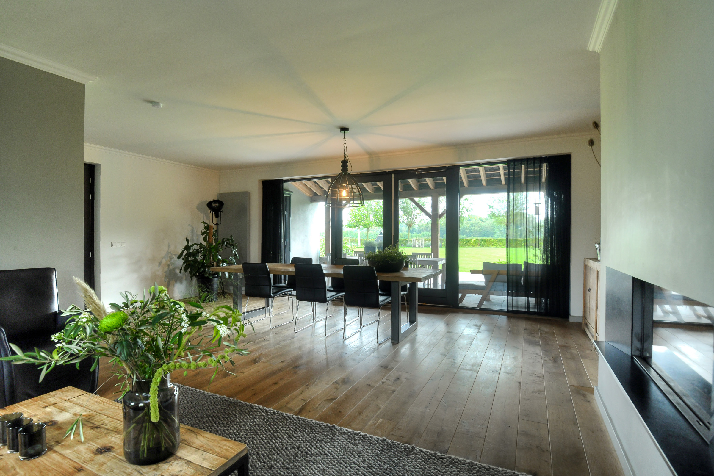 Ruime L-vormige woonkamer (ca. 47 m²) met moderne schouw met inzethaard. De woonkamer is voorzien van eiken vloerdelen.
