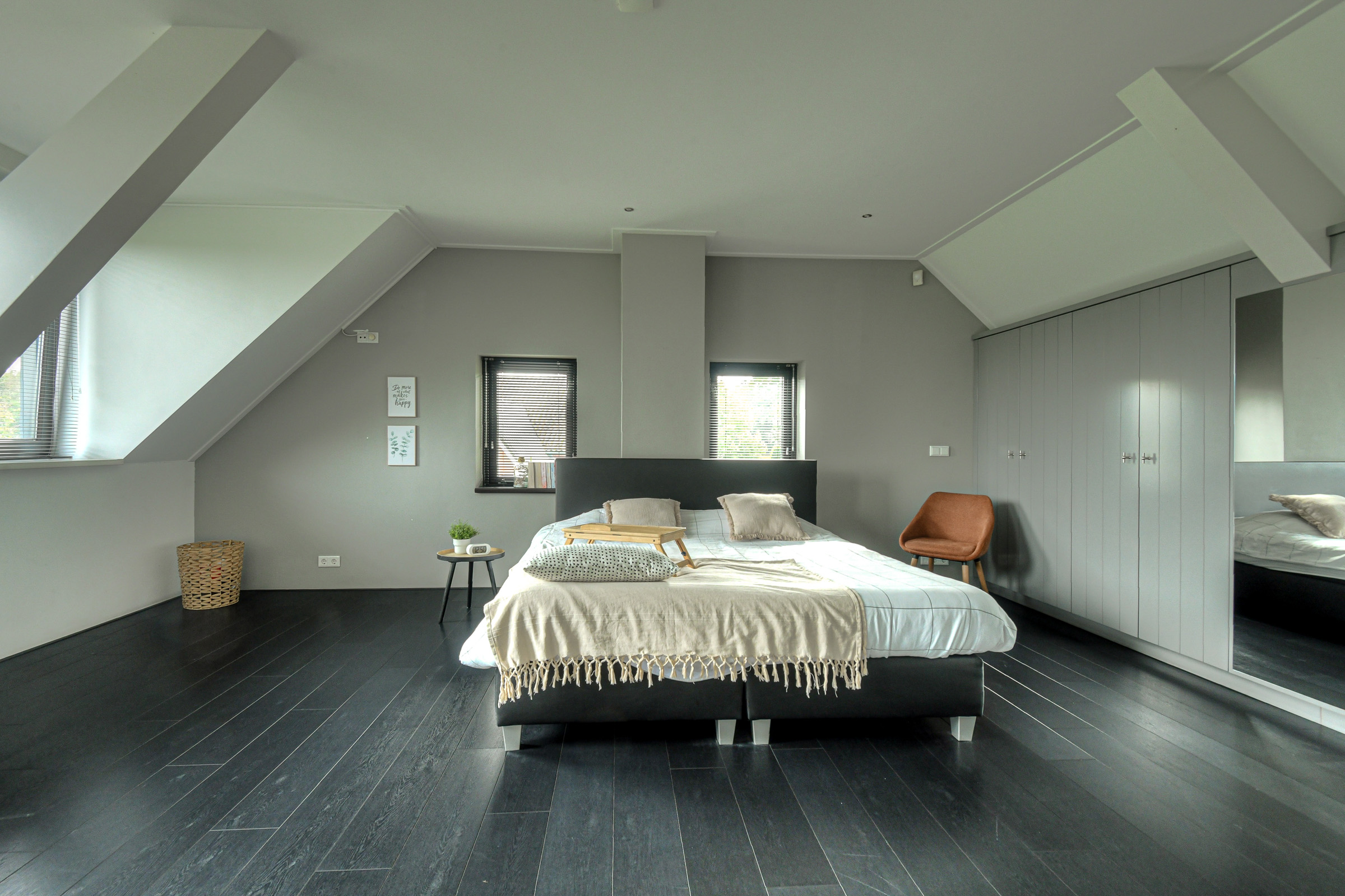 Ouderslaapkamer (ca. 4.55 x 3.00 m) met grote garderobekast, in deze ruimte bevindt zich ook de meterkast (8 groepen + krachtstroom + aardlekschakelaar). De vloer is voorzien van sfeervol donker laminaat.