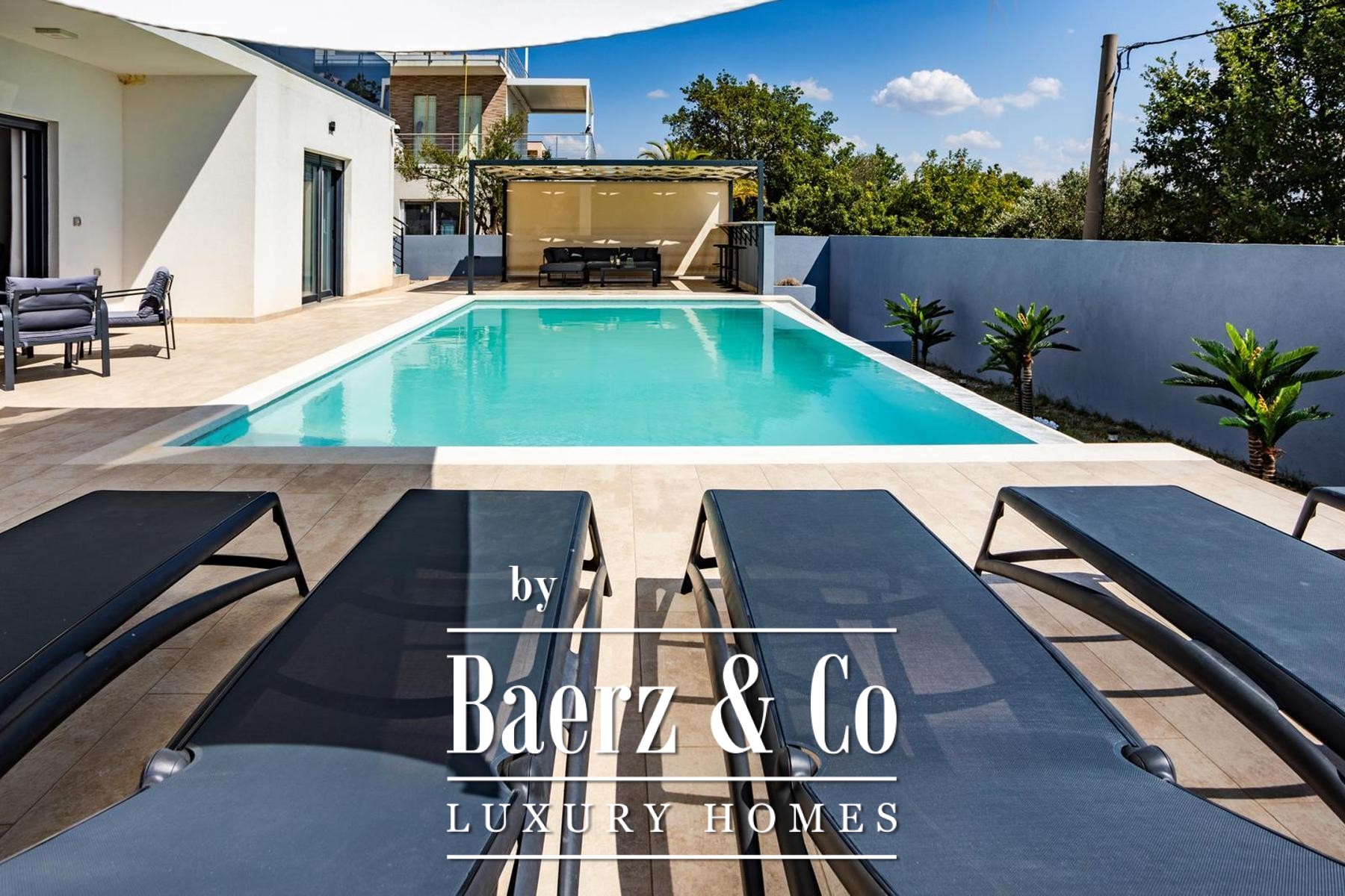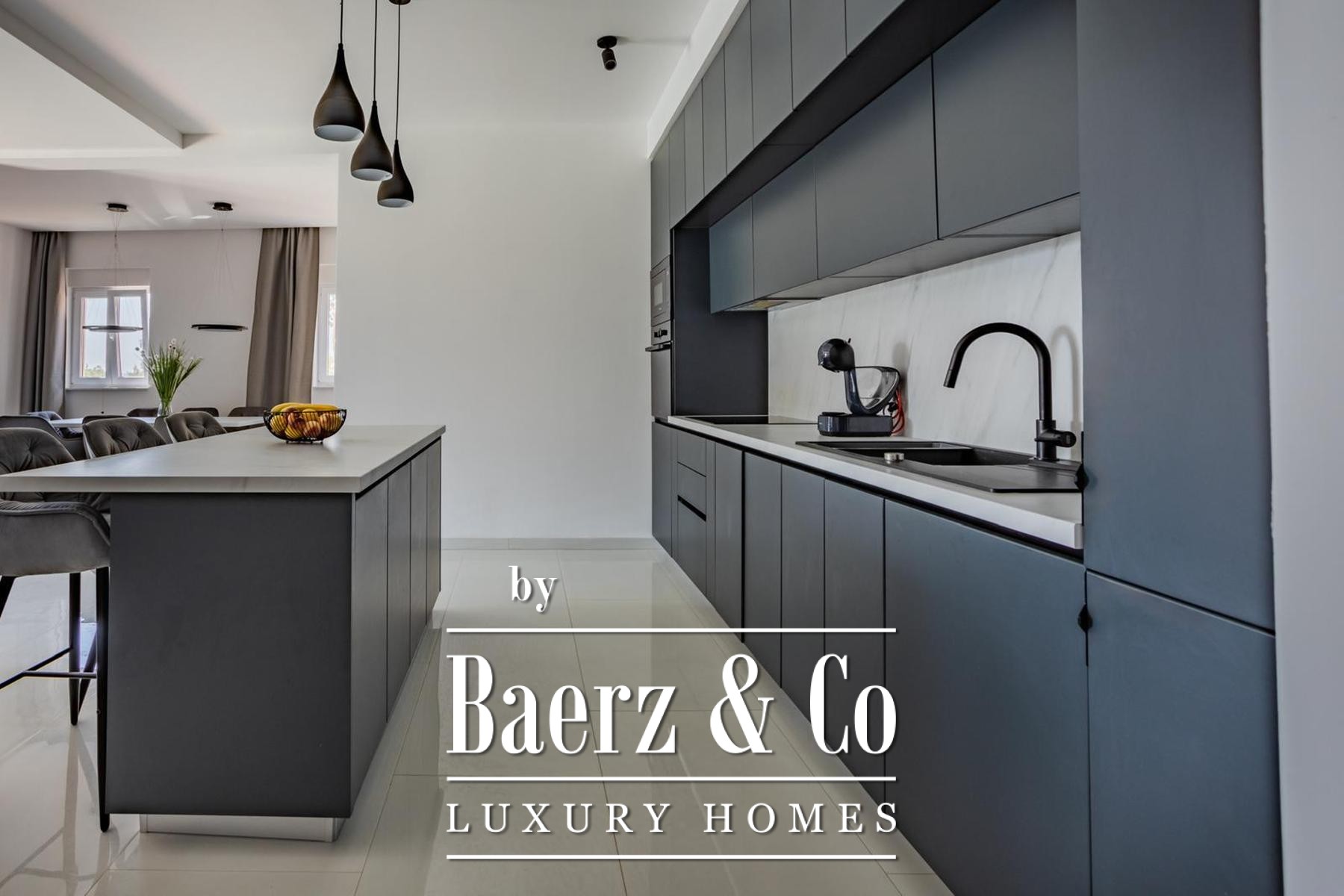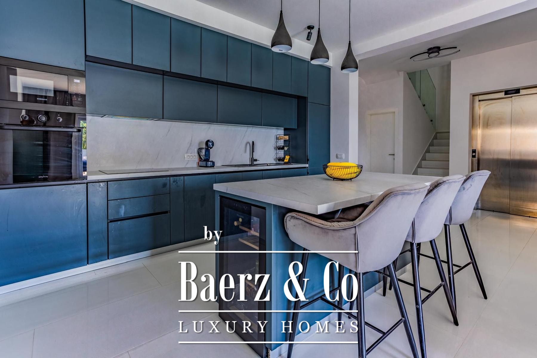 Op een perceel van 531 m² strekt de villa zich uit over drie verdiepingen, verbonden door een interne trap en lift, met circa 250 m² verfijnde leefruimte. De begane grond biedt een kinderkamer, een badkamer en een master suite met en suite badkamer, rondom een open keuken, eetruimte en royale woonkamer. De woonkamer grenst aan een aangelegde terrasvormige tuin, ingericht voor ontspanning en entertainment, compleet met zwembad, zonneterras met ligstoelen, overdekte lounge, bar, barbecue en een kinderspeelplaats.