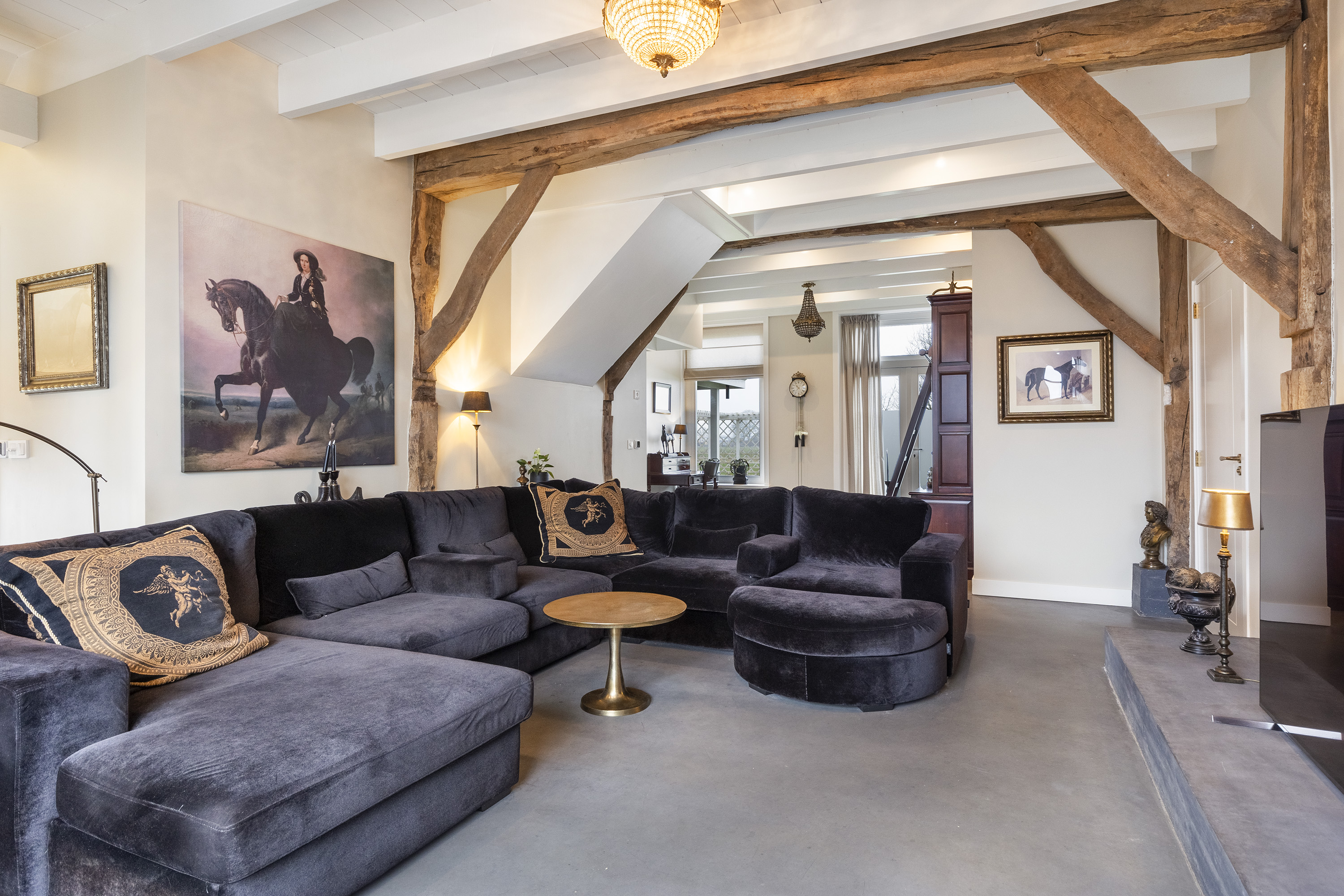 De woonkamer is eveneens royaal opgezet en kenmerkt zich door een prachtige combinatie van witte houten plafondbalken, robuuste draagbalken en een gevlinderde betonvloer. De houthaard en openslaande deuren naar de tuin zorgen voor een natuurlijke verbinding tussen binnen en buiten. De ruimte leent zich uitstekend voor meerdere zitgedeeltes, waardoor een comfortabele en sfeervolle indeling eenvoudig te realiseren is.