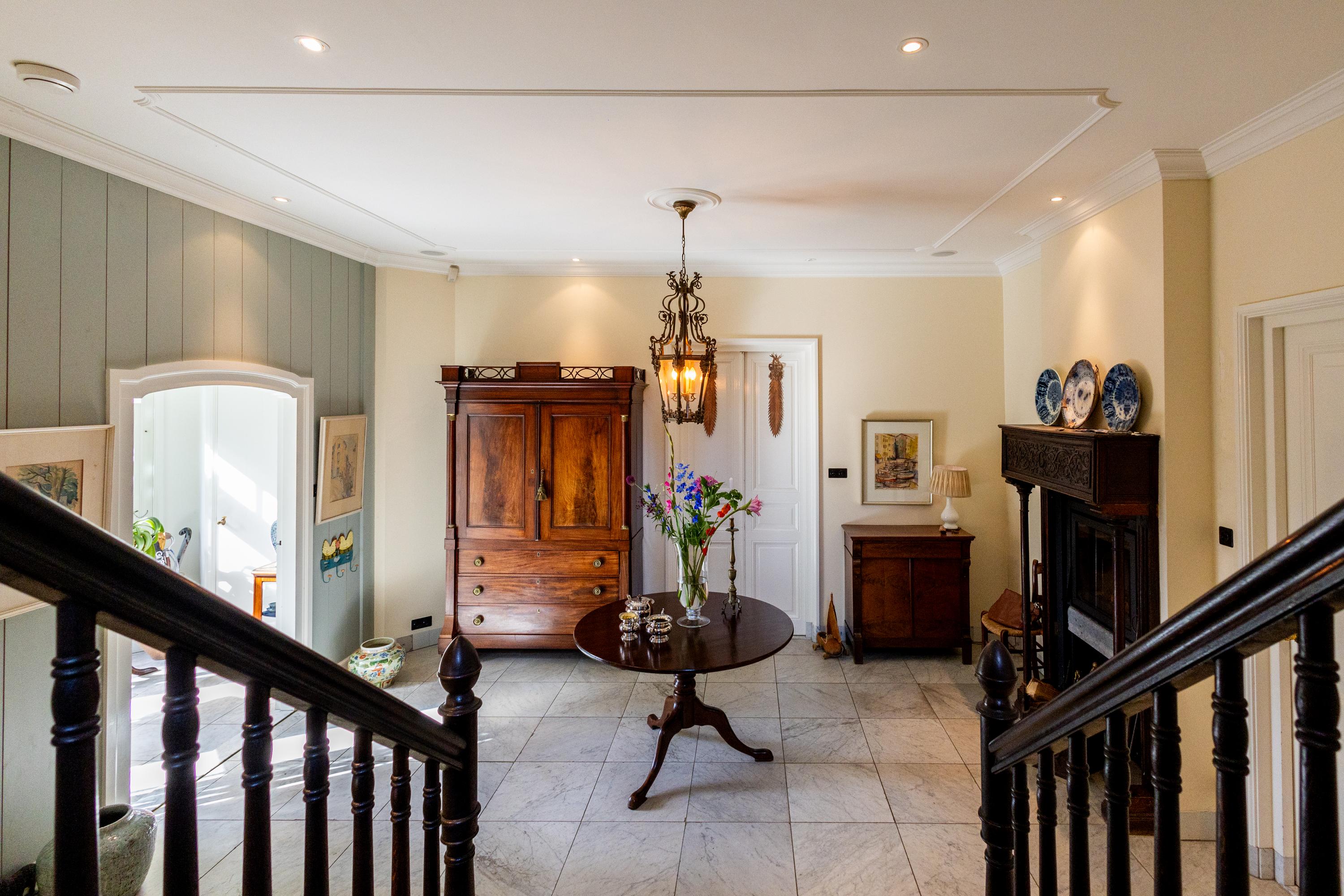 Binnen is de villa even verrassend als betoverend. Met een woonoppervlak van circa 350 m² en nog eens 150 m² in het souterrain biedt het huis een overvloed aan ruimte. De plafonds op de begane grond zijn bijna drie meter hoog, waardoor elke kamer een ademende ruimtelijkheid heeft. De statige hal met open haard en bordestrap voelt als een belofte van wat komen gaat.