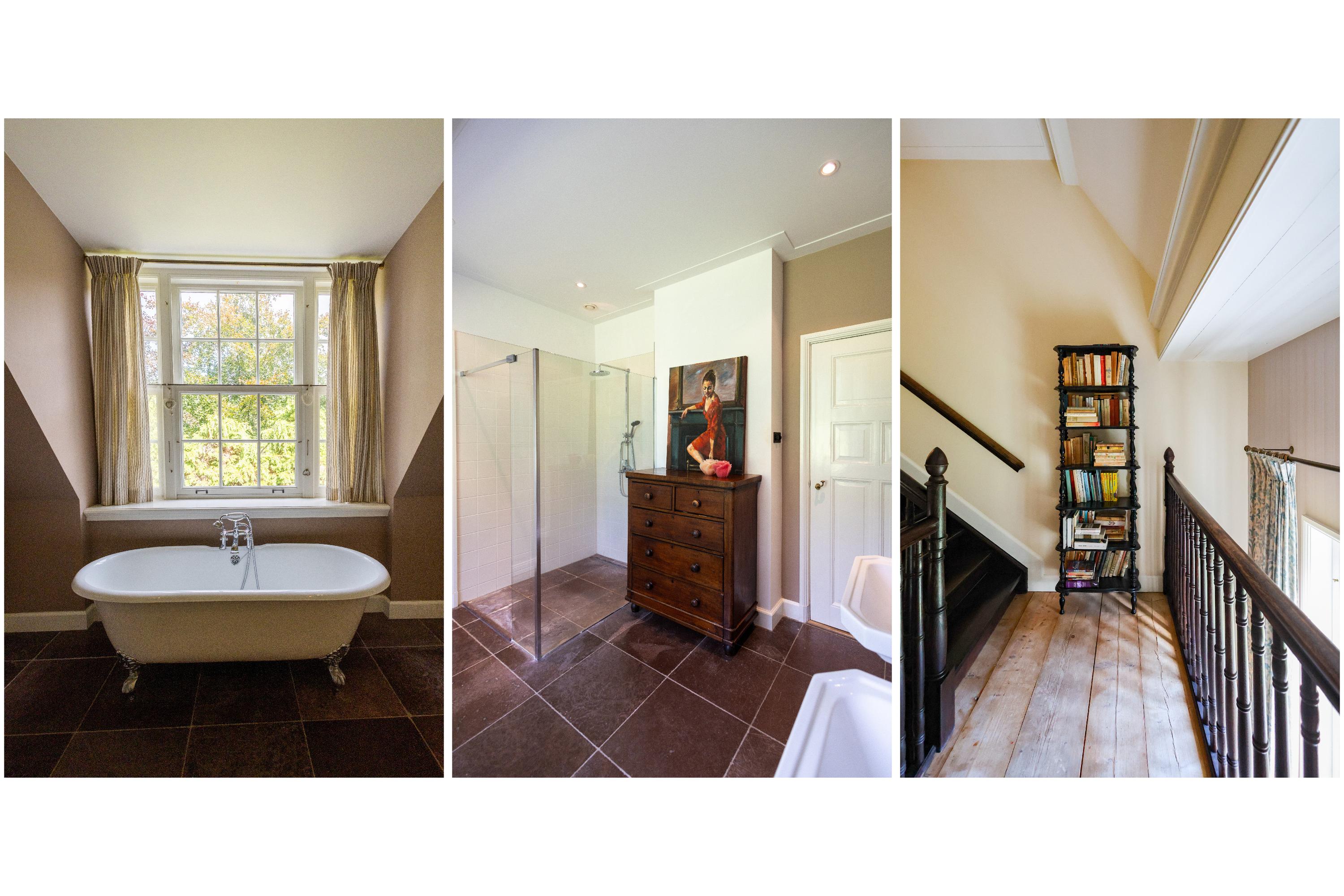 De bordestrap leidt naar de eerste verdieping, waar de ouderverdieping zich uitstrekt als een privé-suite: een royale slaapkamer met uitzicht over de tuin, een luxe badkamer, een kleedkamer en directe toegang tot de wasruimte. Daarnaast zijn er nog twee slaapkamers met een eigen badkamer en een apart toilet.