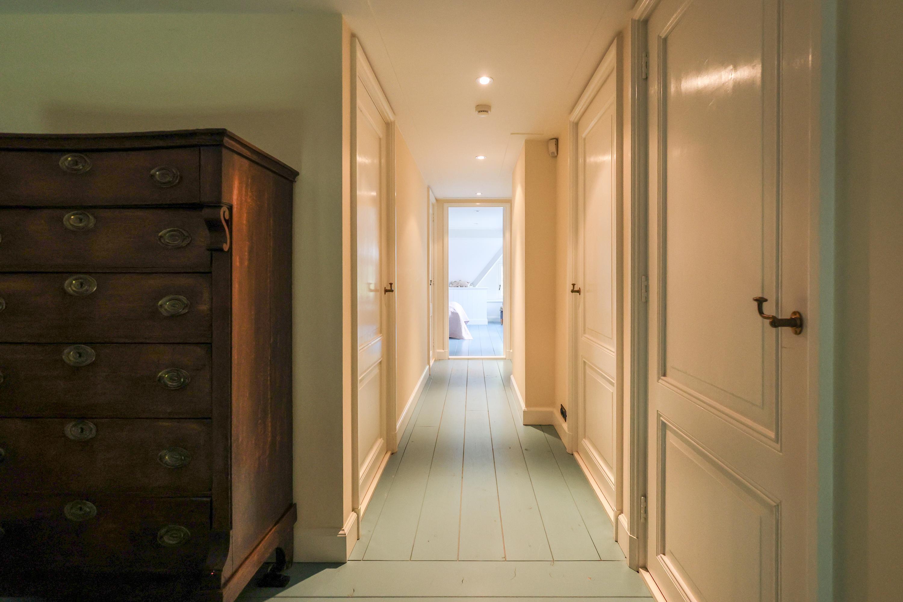Wat dit huis echt onderscheidt, is de ziel waarmee het gebouwd is. In 2012 tekende architect Van Asbeck voor het ontwerp, maar het zijn de oude, zorgvuldig verzamelde materialen die het karakter geven. Vloeren van parket die eerder in historische panden lagen, stokoude kinderspeltegels verwerkt in de plinten en bij het fornuis, deuren met een verleden, dakpannen die ooit een Utrechtse kazerne bedekten en zelfs oude kaasplanken die een nieuwe bestemming vonden. En in de keuken staat een kast uit een Amsterdams grachtenpand, die hier naadloos aansluit bij de sfeer. Elk detail ademt historie en authenticiteit, en samen geven ze de woning een bezieling die je zelden tegenkomt.