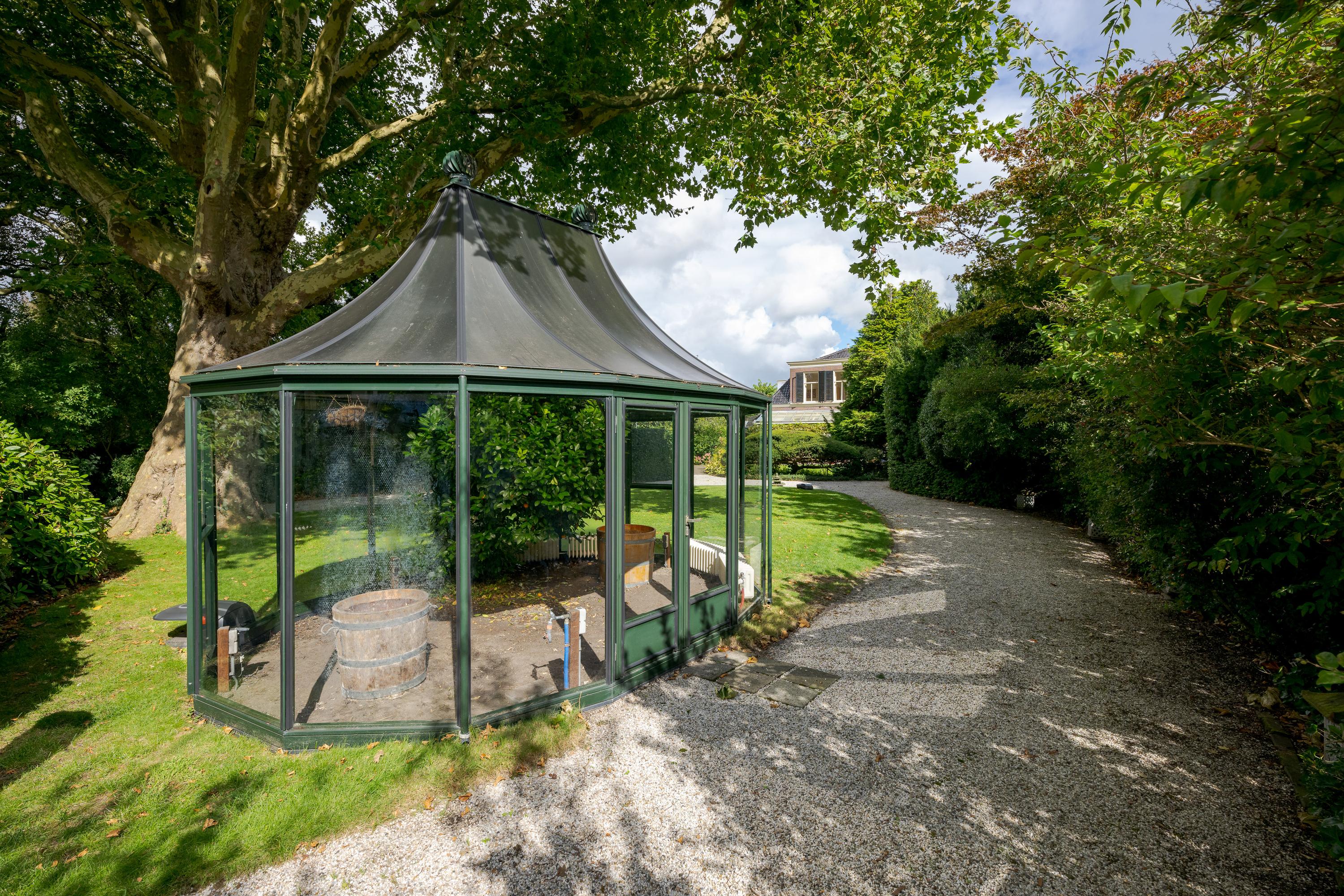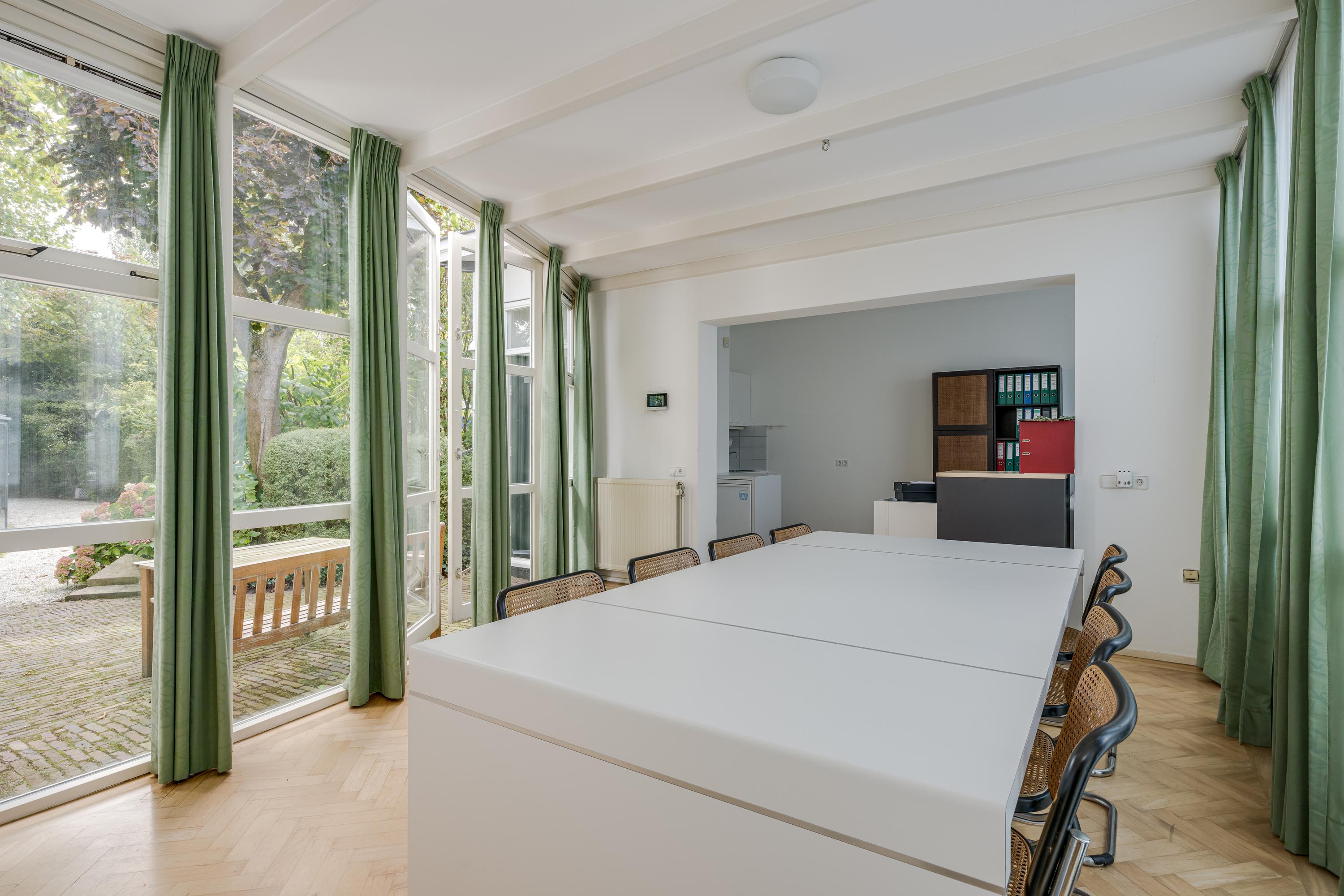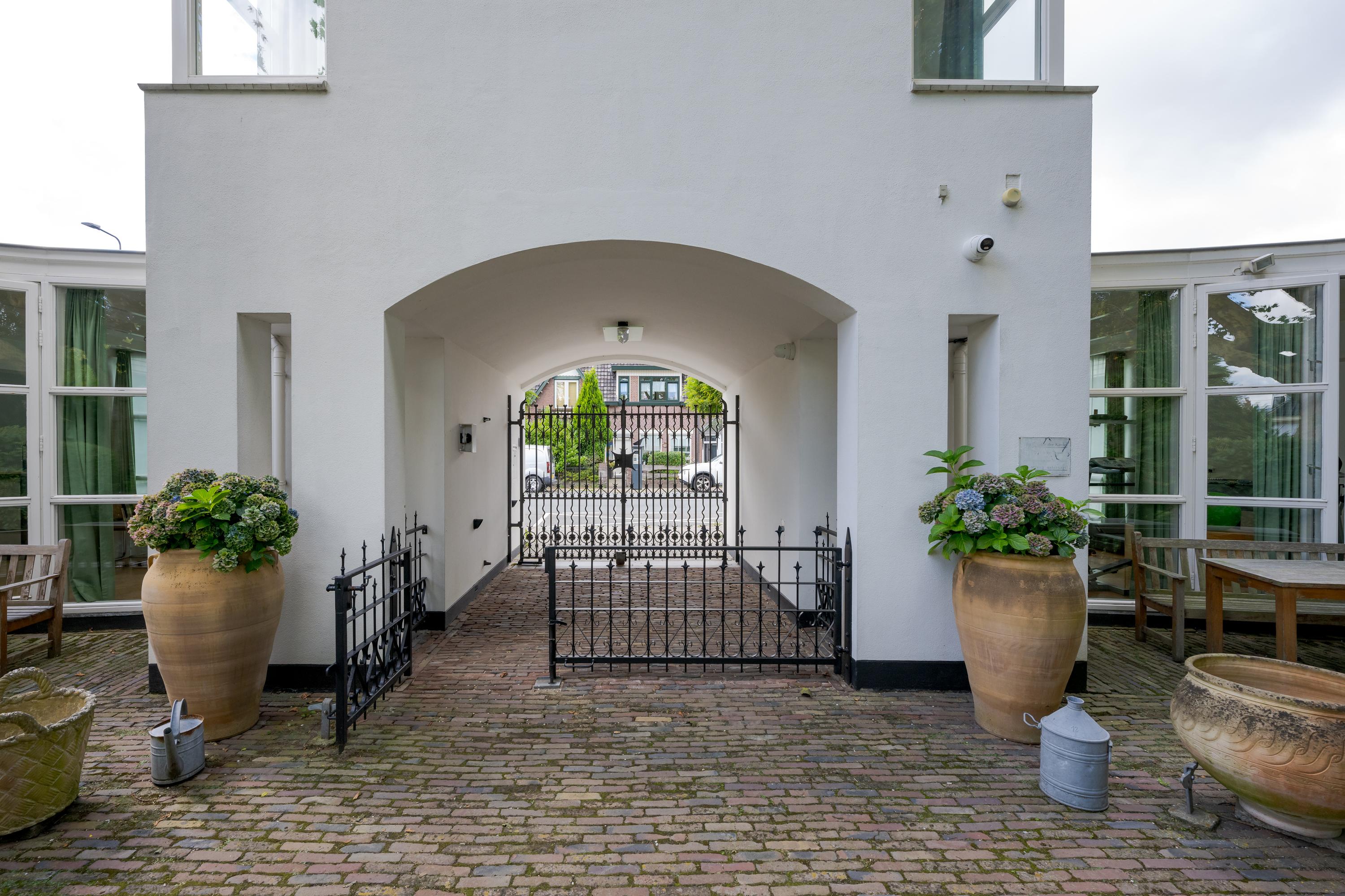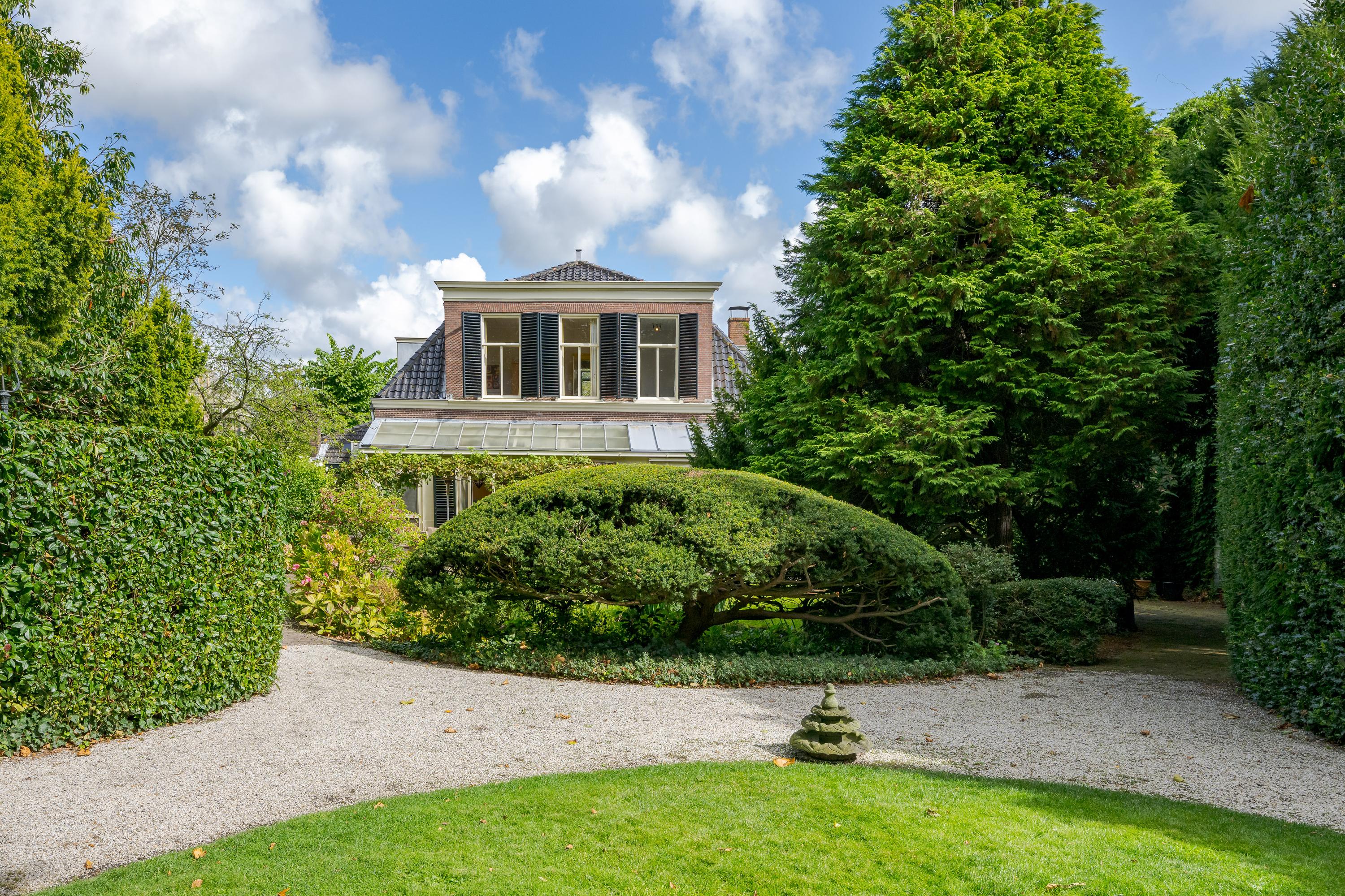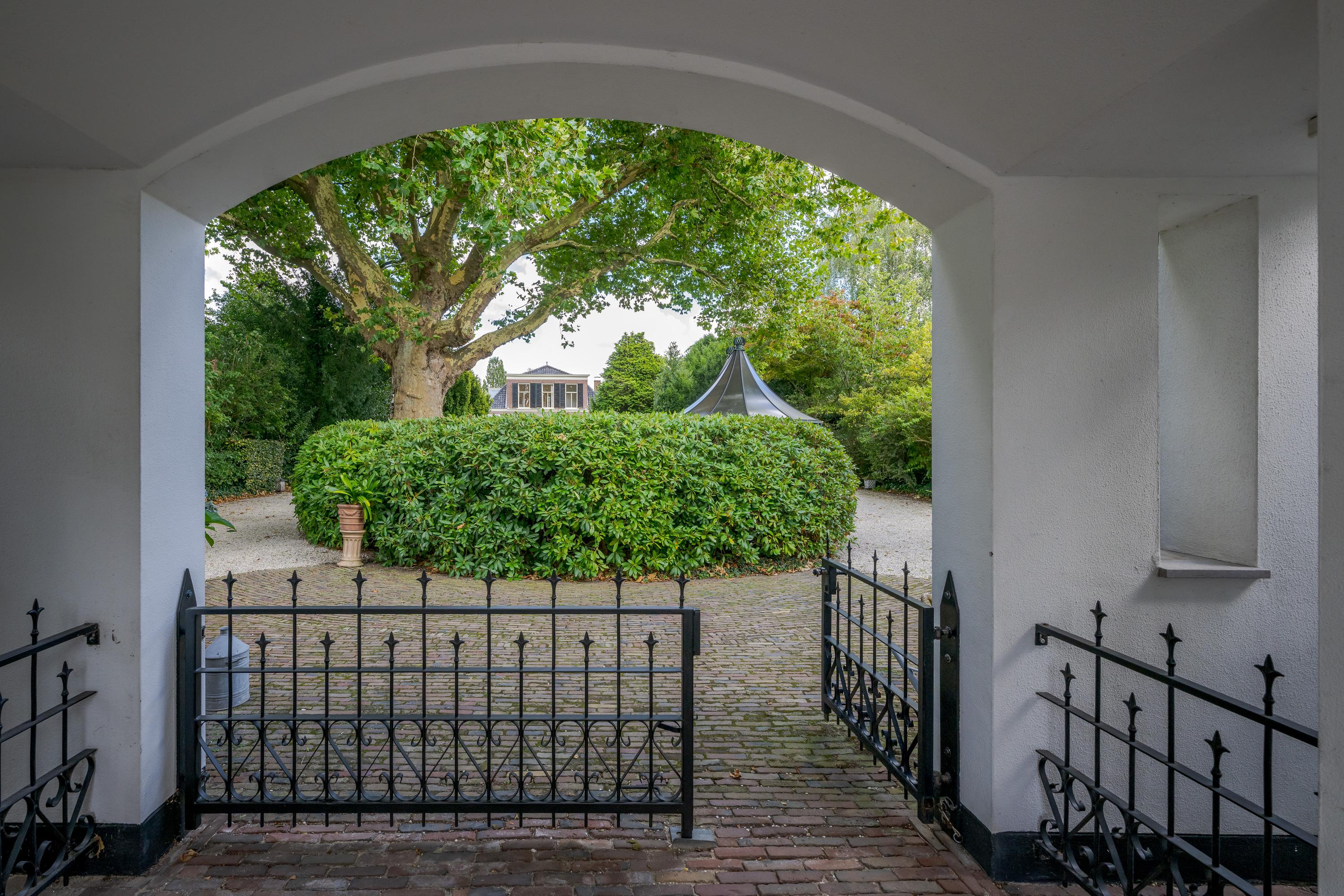 Nadat je het elektrische hek van het poortgebouw achter je hebt gesloten waan je je direct in een andere omgeving en komt de rust over je heen. Een centraal gazon met eeuwenoude plataan (1820) vormt het hart van de binnentuin. Bijzonder is de kas met mandarijnenboom naast de boom, waar je op een zonnige dag in hartje winter nog heerlijk kunt zitten. Zowel links als rechts van het gazon loopt een grindpad, waar je eventueel met de auto direct voor het huis kunt komen. Nu zijn er enkele hoekjes en zitjes waar je op verschillende momenten van de dag kan genieten van zon of schaduw. Iets verderop ligt een vijver die van een waterleidingsysteem met Rijnwater is voorzien, met daarachter de entree van de woning, links geflankeerd door een veranda en rechts een zonrijke serre. Ook hier zijn het alle jaargetijden genieten van deze grote tuin.