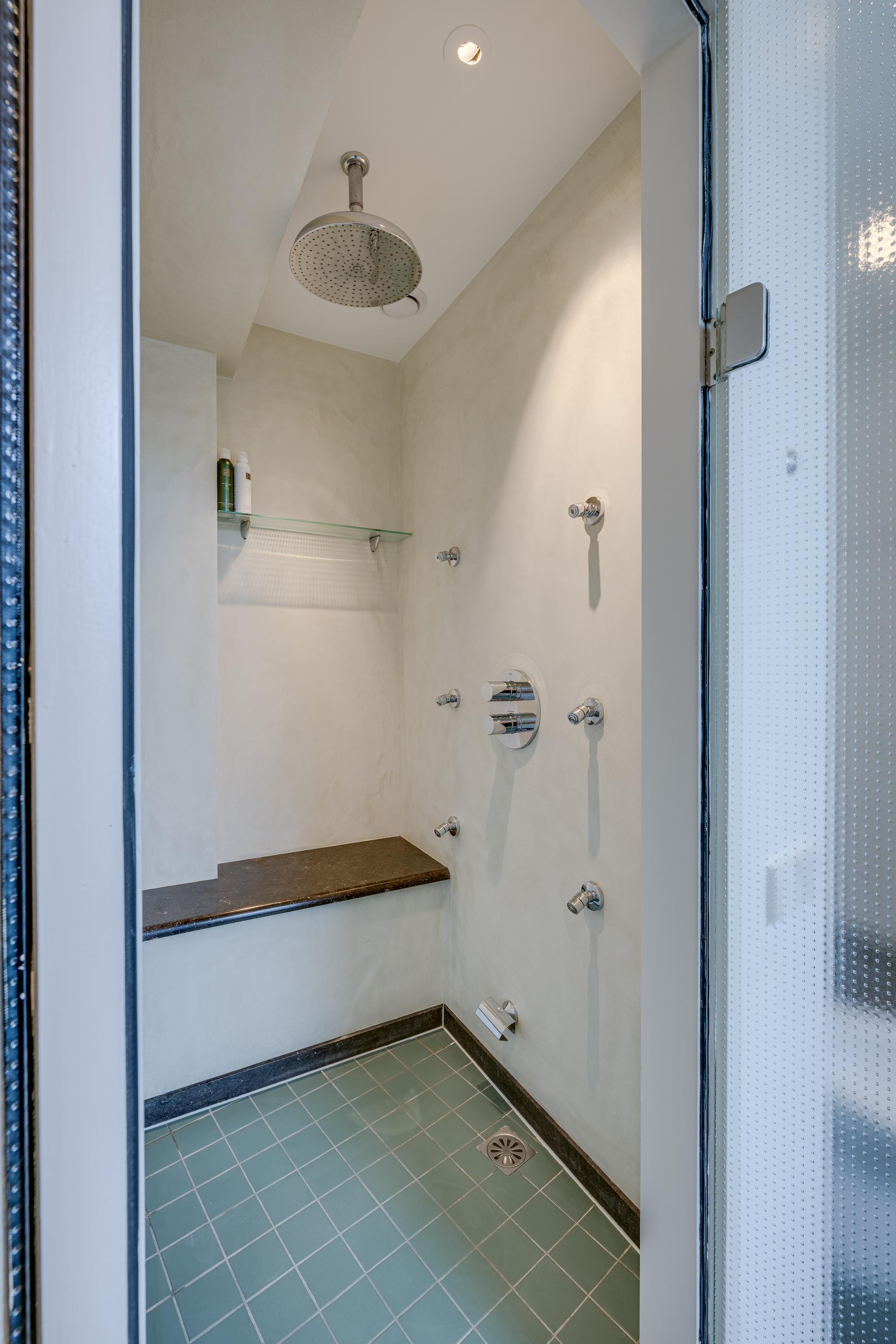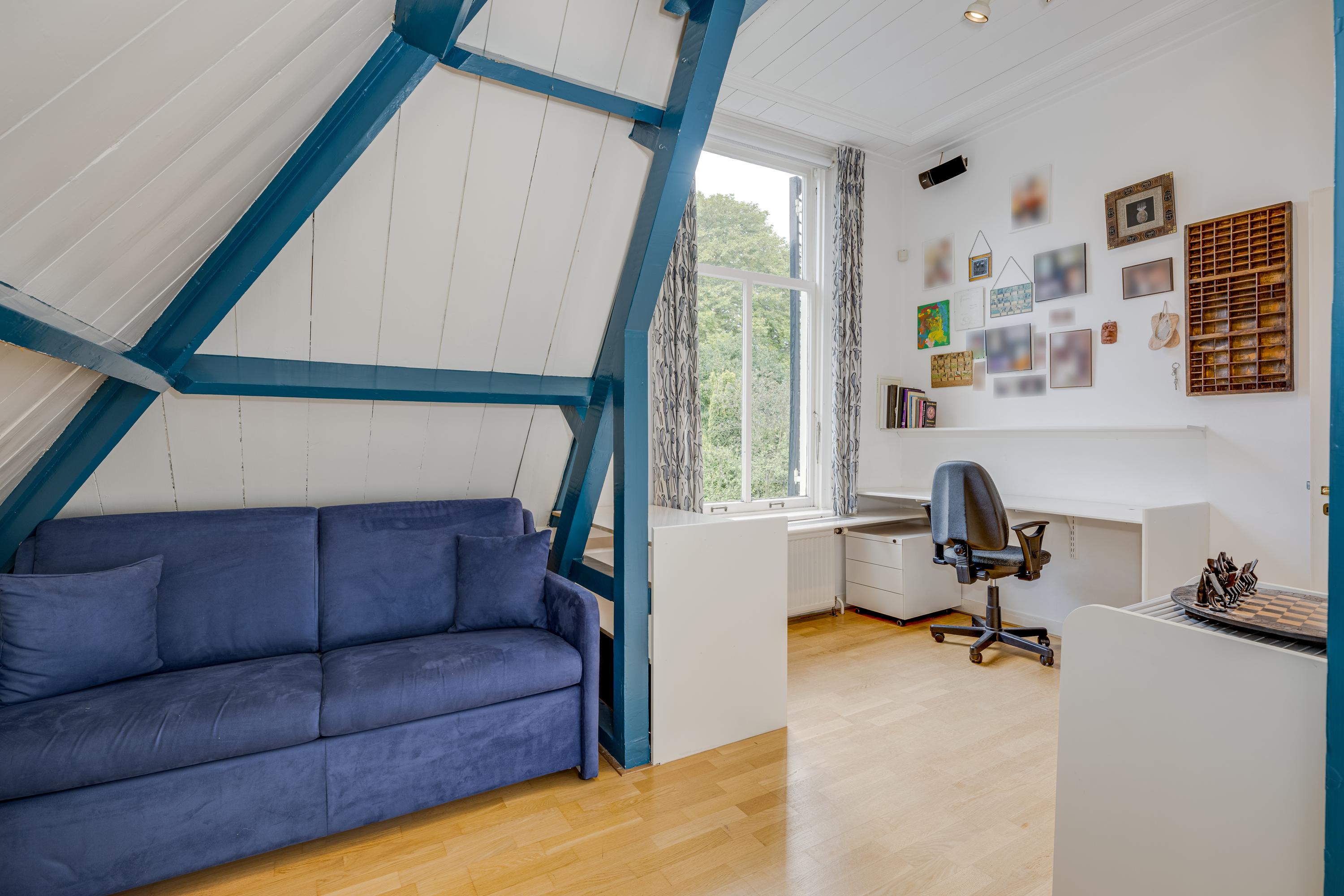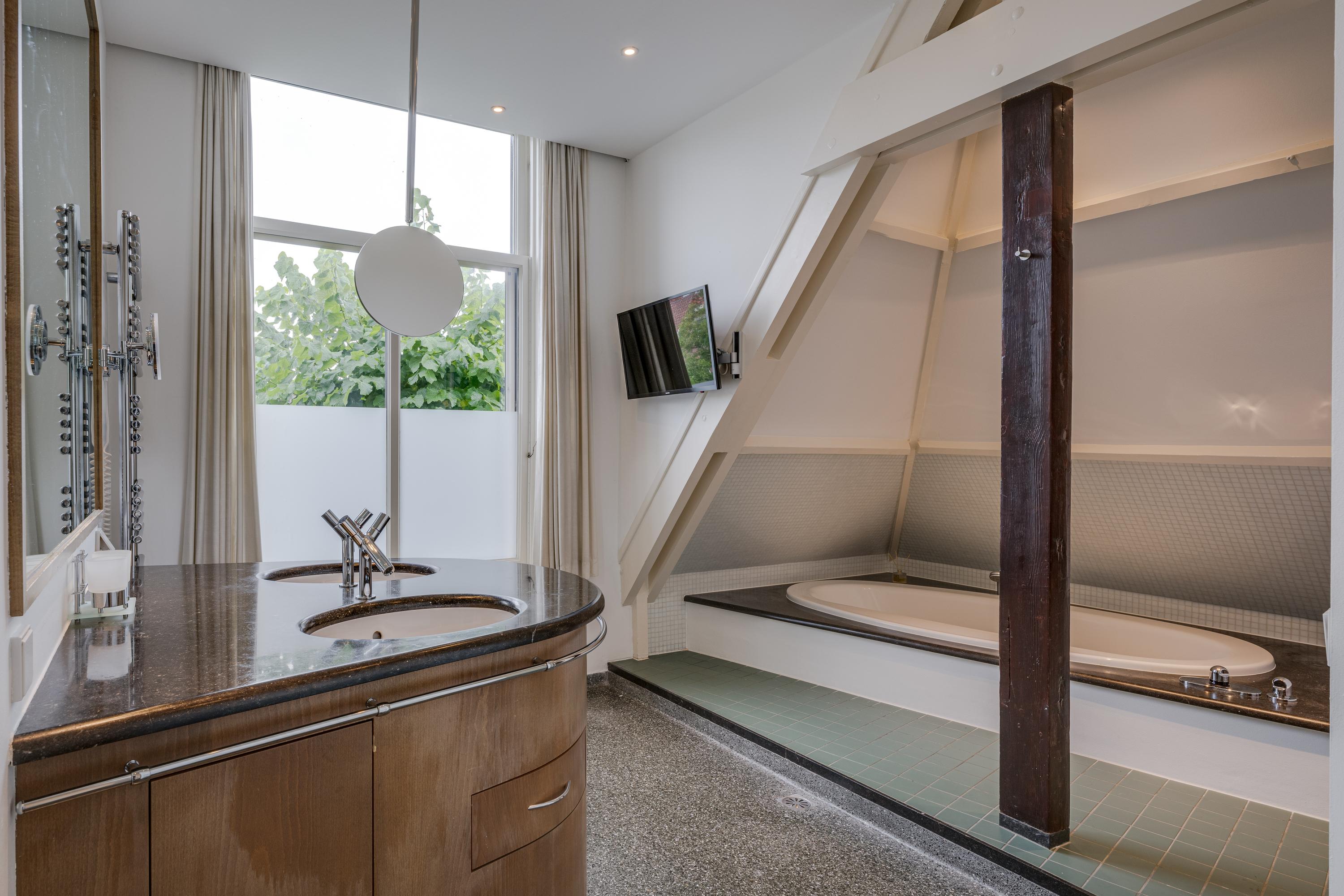 De bordestrap vormt het hart van het huis en de verbinding, met een toegang tot een ruime toiletruimte met wandcloset en fontein, naar de slaapverdieping. Hier zijn drie ruime slaapkamers met de master bedroom aan de waterzijde en inloopkast. De slaapkamers typeren zich door de hoge plafonds en het uitzicht op de tuin en het water, waarbij de master bedroom eruit springt door het formaat. De badkamer is voorzien van alle luxe met een granito-vloer, vloerverwarming en 2 in natuursteen ingebouwde wastafels. Niet alleen de hygiëne, maar ook ontspanning: naast een verzonken duo-bad, een doucheruimte met stortdouche en “Turks bad”, sauna, een wandbidet en een wandcloset.