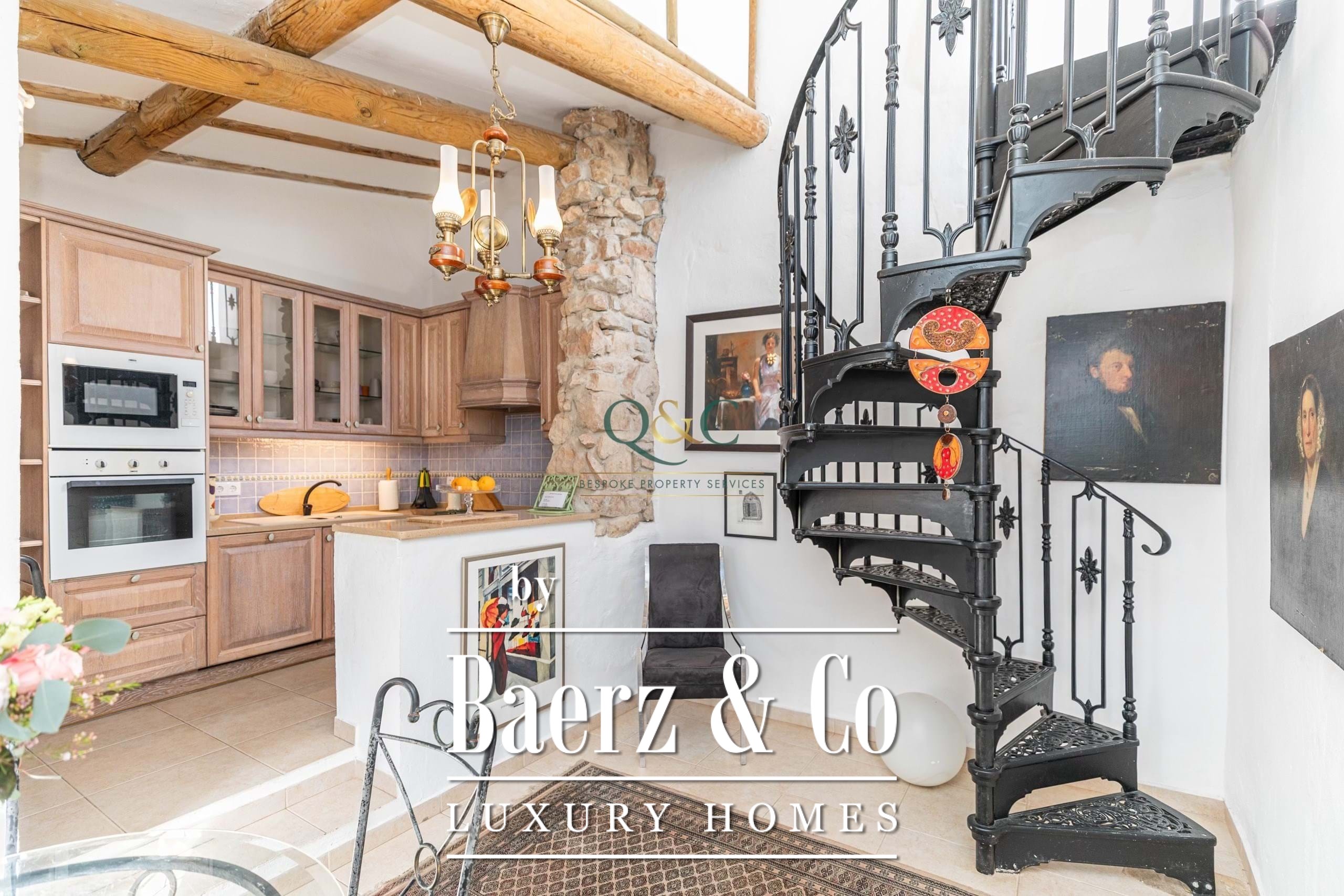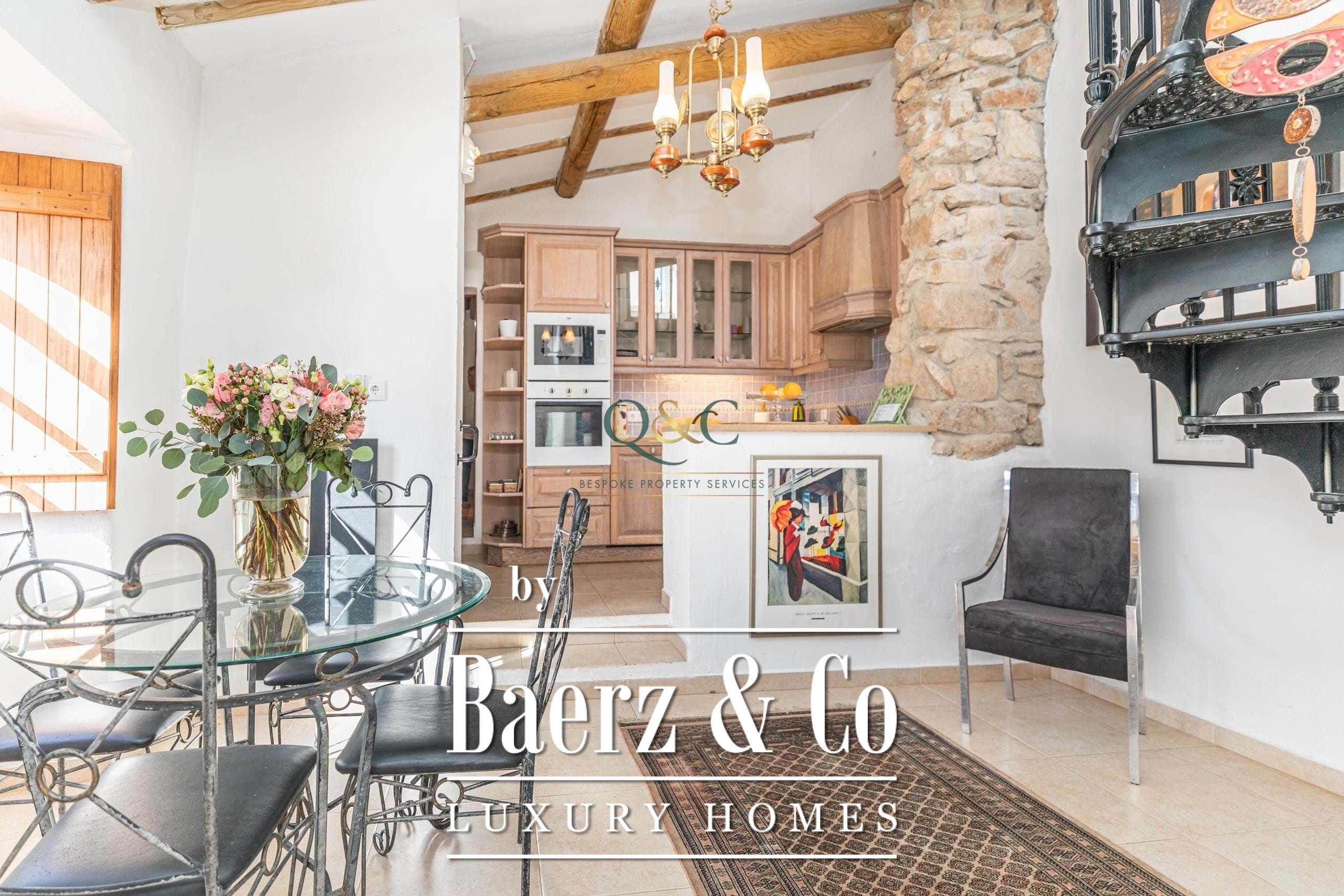 Een smeedijzeren wenteltrap leidt naar het dakterras, waar panoramisch uitzicht op bergen en omringend landschap een serene sfeer creëert. Buitenruimtes nodigen uit tot slow living met een zwembad, douche, BBQ, eet- en zithoeken, alles omgeven door volgroeide tuinen en de beslotenheid van oude bomen. Privéparkeergelegenheid is aanwezig bij de entree en praktische voorzieningen zoals een voorraadkamer, geboorde waterput, septic tank en waterreservoir vergroten de zekerheid en zelfstandigheid.
