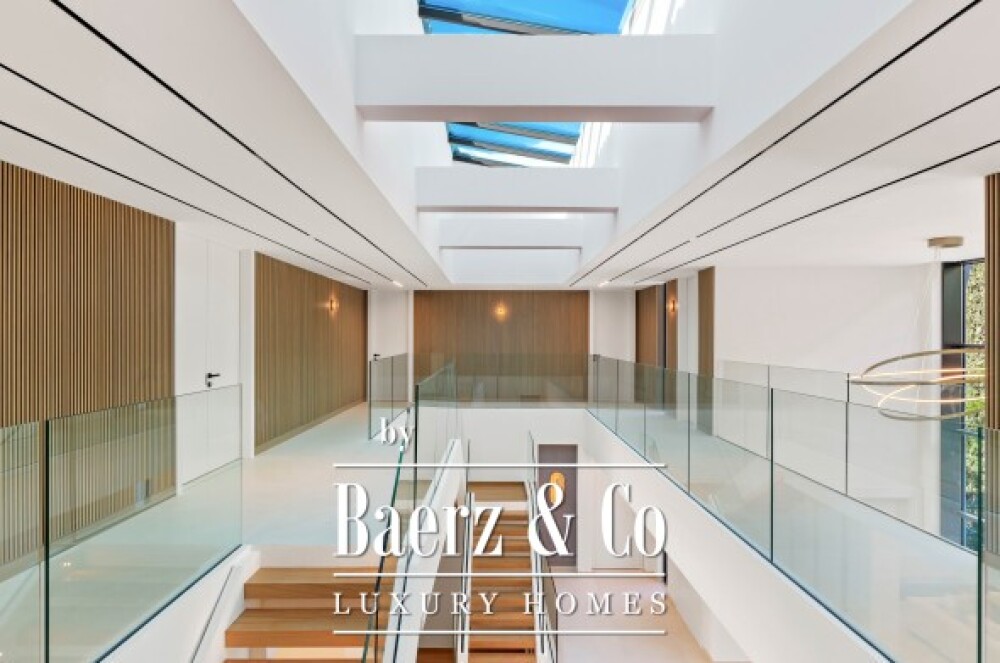 Bij binnenkomst valt meteen de royale entreehal op met dubbele plafondhoogte, waar een sfeervol dakraam het interieur vult met natuurlijk licht. Het uitzicht opent direct naar panoramische zeezichten, optimaal benut door de slimme zuidgerichte positie. De hoofdverdieping ademt een open en vloeiende inrichting, waarbij haarden zorgen voor warmte en verbonden ruimtes uitnodigen tot ontspanning, dineren en vermaak. De chef-keuken, aangevuld met een aparte butlerkamer, is naadloos verbonden met de eetkamer en familielounge, ideaal voor zowel intieme als grote gezelschappen. Een eigen kantoor en gastensuite met privétoegang completeren deze etage.