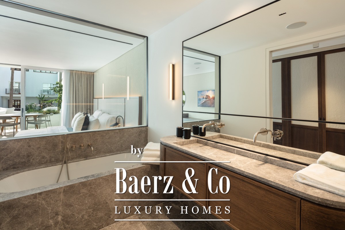 De keuken is afgewerkt met marmer en voorzien van verborgen inbouwapparatuur, ideaal voor zowel stijlvol entertainment als moeiteloos dagelijks wonen. Het overdekte, royale terras verlengt de leefruimte naar buiten voor diners en ontspanning in de frisse lucht, met directe toegang vanaf de master suite en de woonkamer. Elk van de drie slaapkamers beschikt over een eigen en-suite badkamer, afgewerkt met de mooiste materialen. De master suite, voorzien van een privacy glaswand en dubbele wastafel van grijs steen, biedt een discrete plek om te ontspannen.