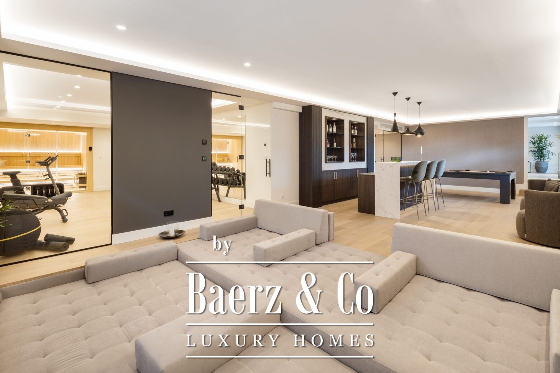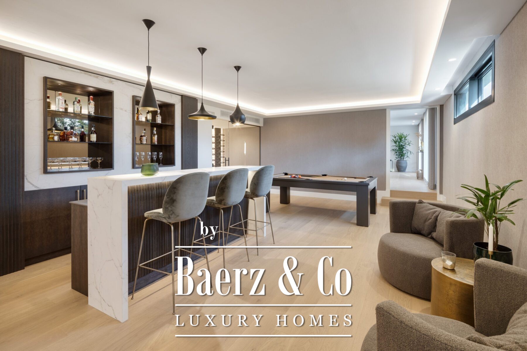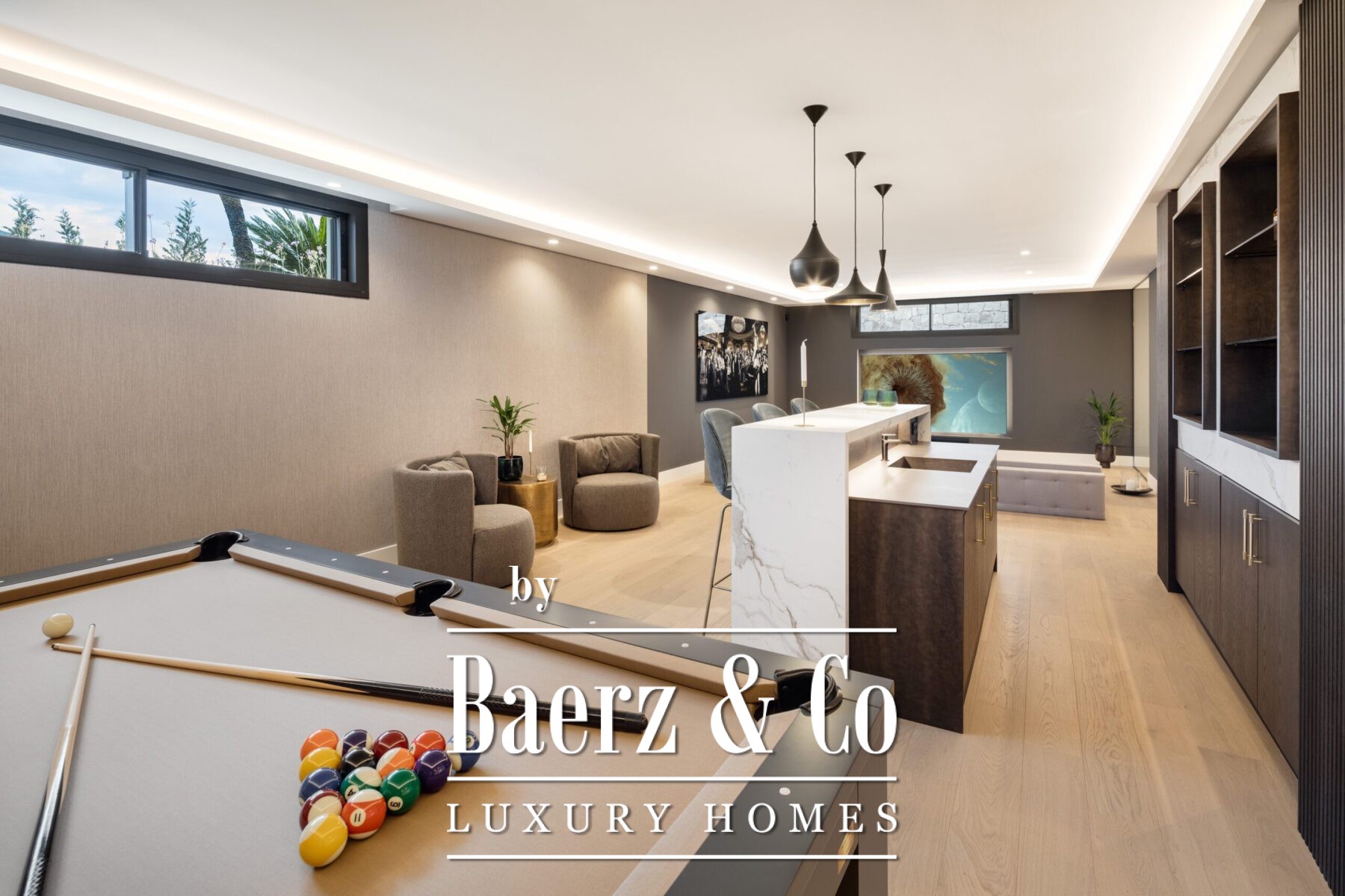 Half a level down, two additional bedrooms, each with en-suite bathrooms, provide ample space for family and guests. Entertainment and relaxation are at the heart. The basement hosts a vibrant social area featuring a bar, cinema, pool table, and wine bodega, complemented by a gym and sauna for wellness activities. This level also includes a beautifully appointed guest suite, enhancing the villa’s capacity to host friends and family in sublime comfort.