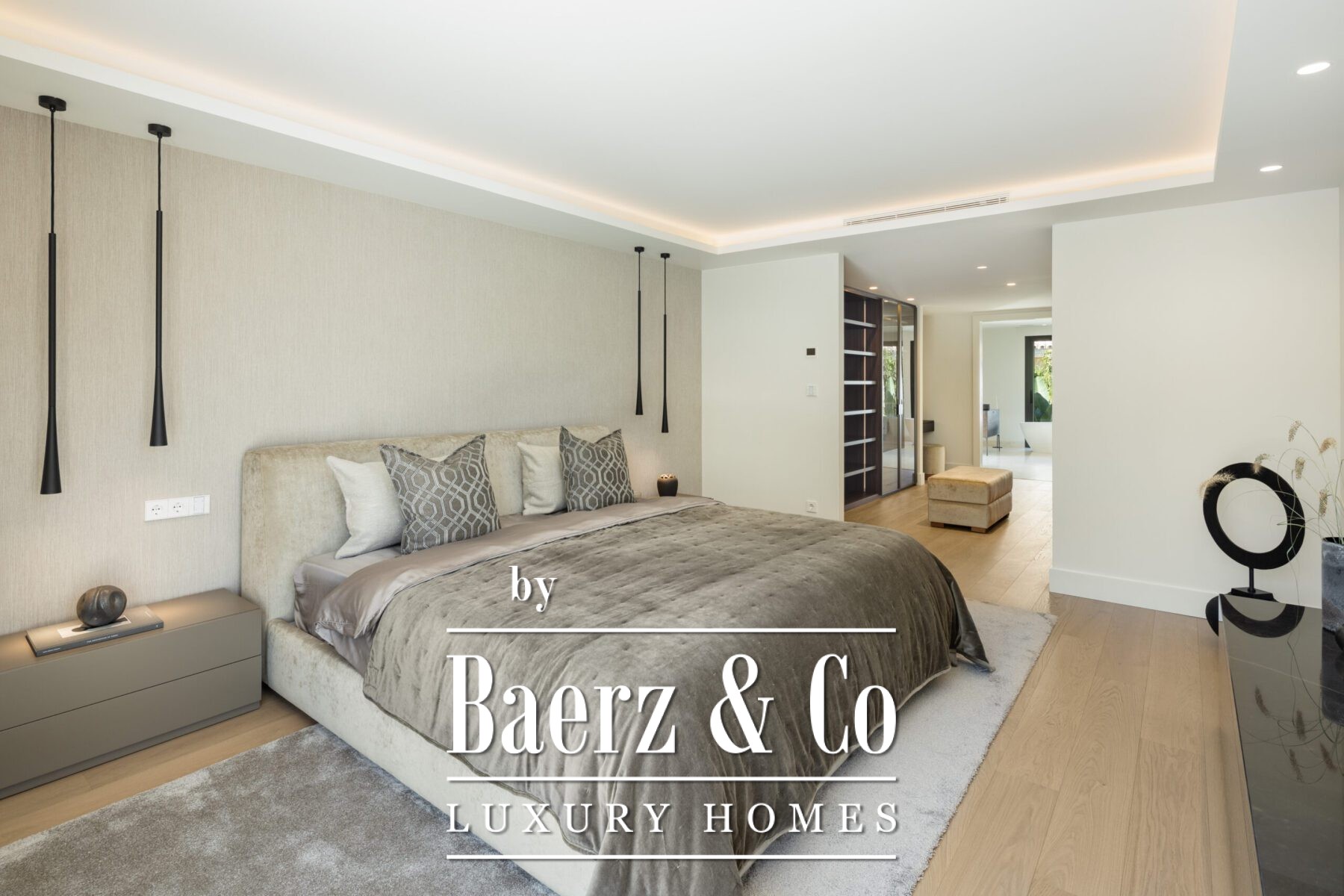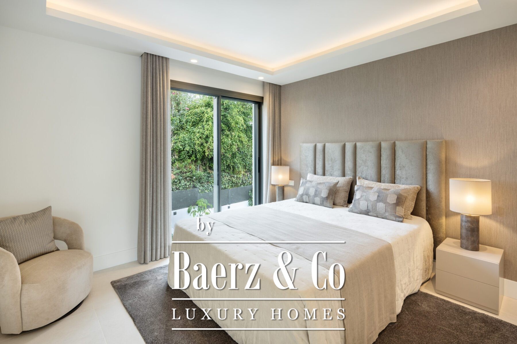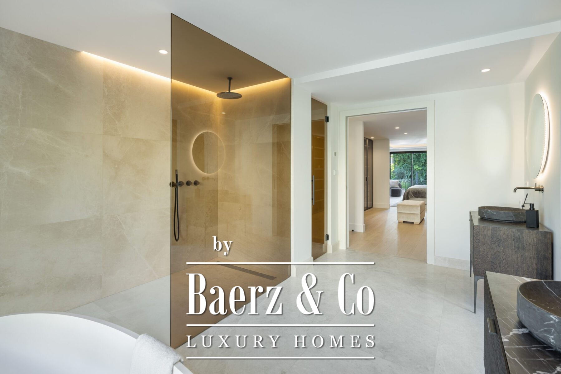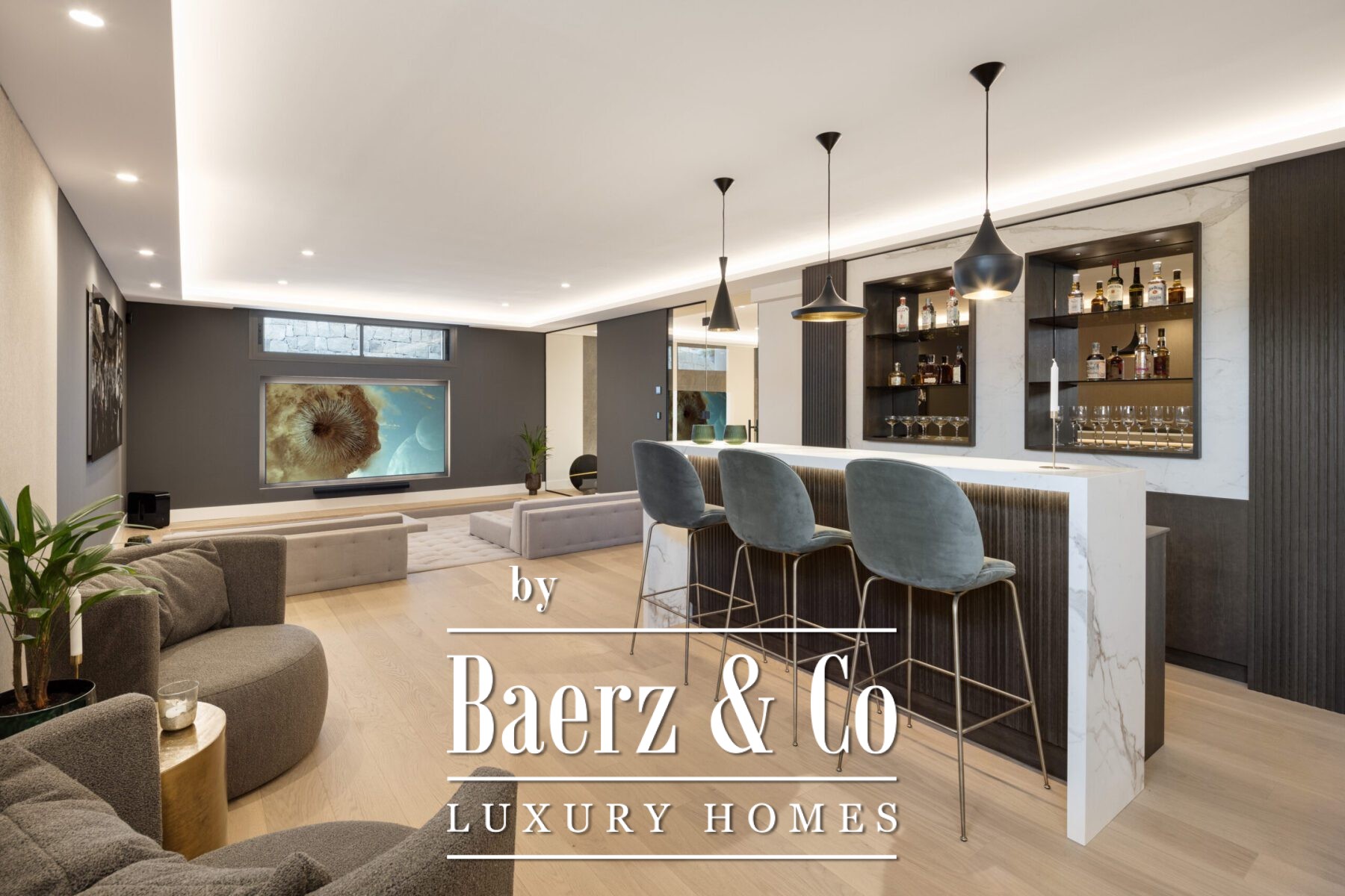 Half a level down, two additional bedrooms, each with en-suite bathrooms, provide ample space for family and guests. Entertainment and relaxation are at the heart. The basement hosts a vibrant social area featuring a bar, cinema, pool table, and wine bodega, complemented by a gym and sauna for wellness activities. This level also includes a beautifully appointed guest suite, enhancing the villa’s capacity to host friends and family in sublime comfort.