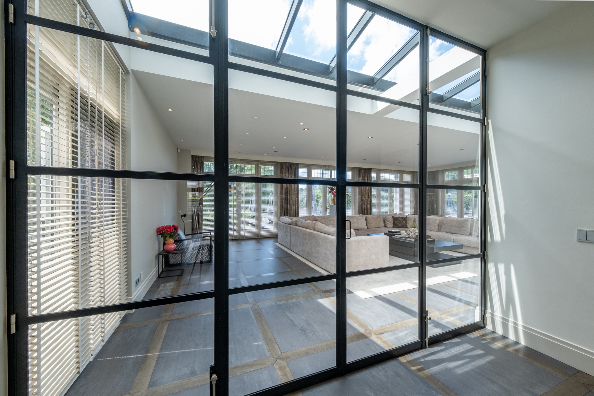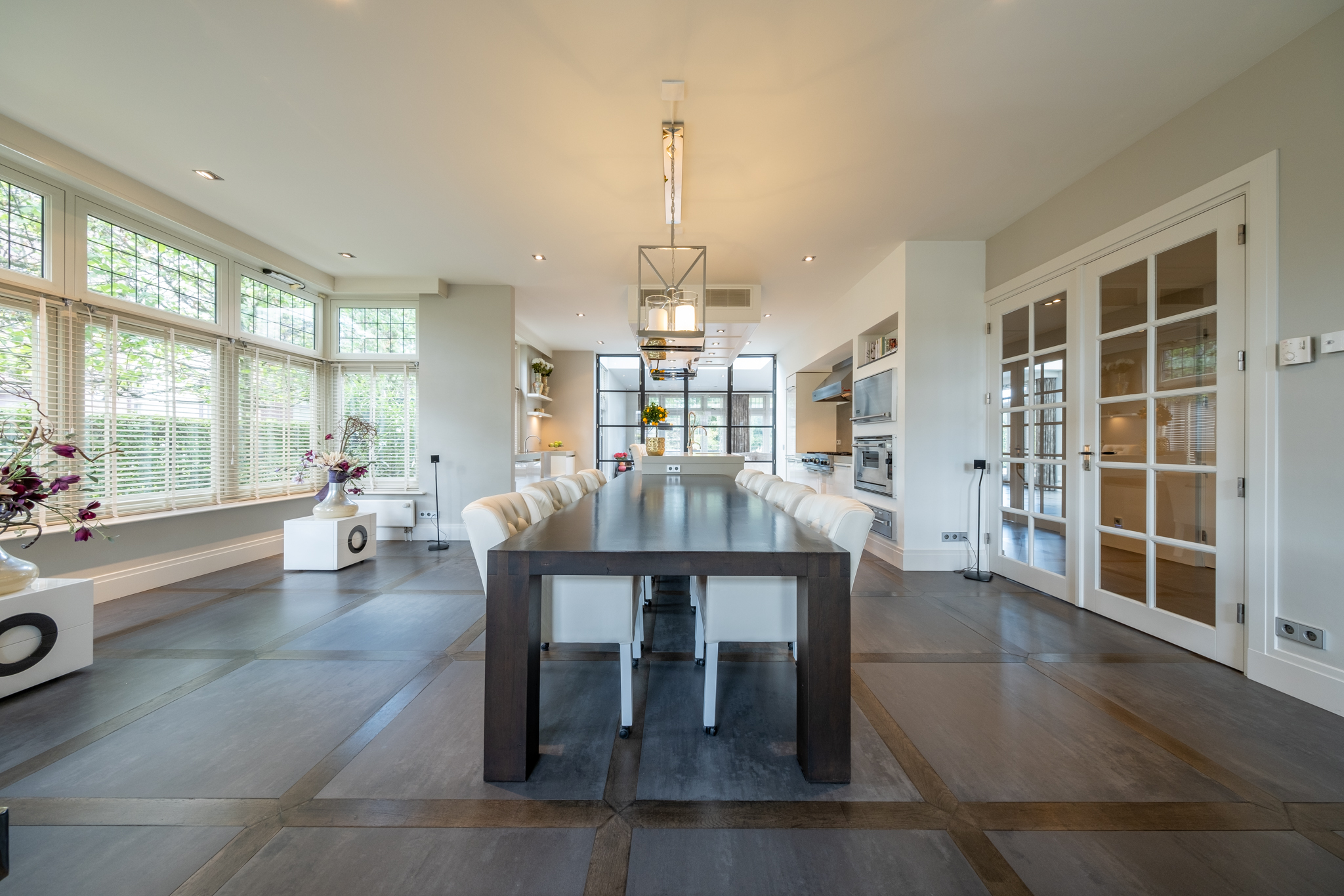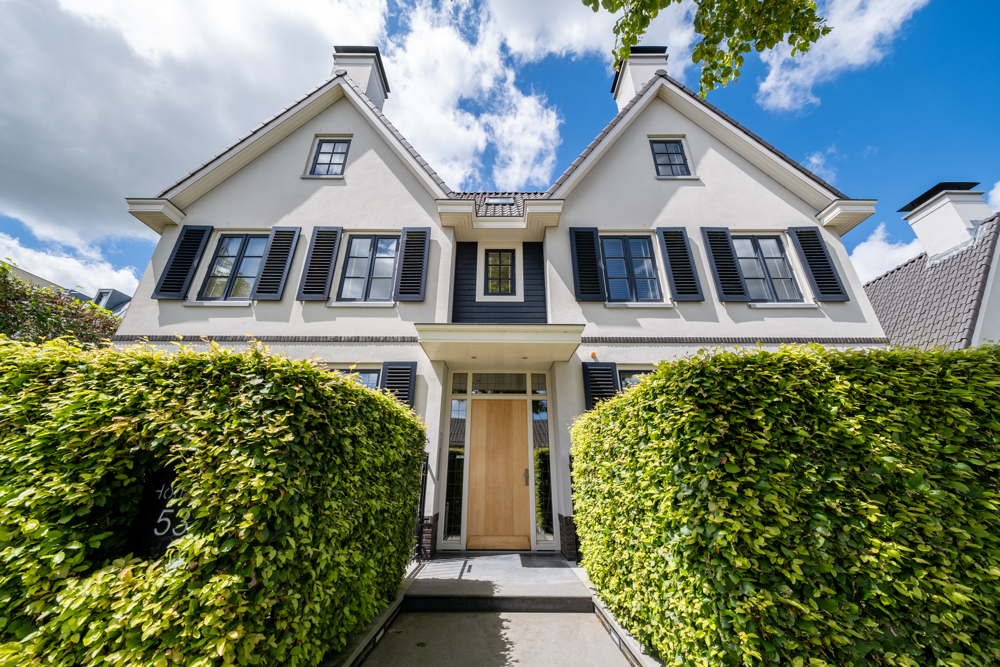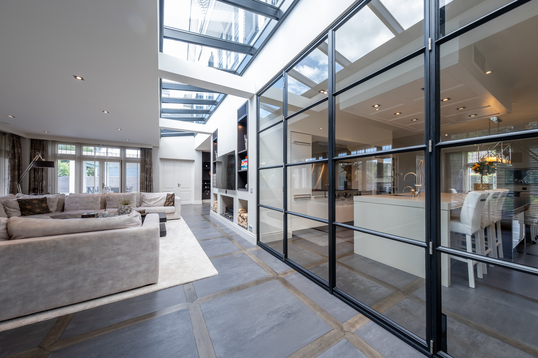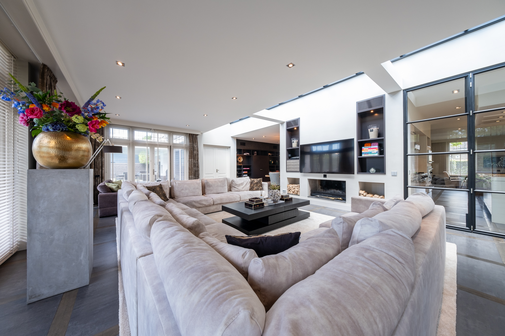 Bij binnenkomst ervaart u direct de allure van dit huis: een royale hal met statige bordestrap, een sfeervolle L-vormige woonkamer met glasstraat in het plafond en een fijne werkhoek. De woonkeuken van Eggersman is een waar pronkstuk: uitgerust met een kookeiland, topapparatuur van Viking en een sfeervolle gashaard. Dankzij de verdiepingshoge stalen pui is de keuken visueel verbonden met de woonkamer, terwijl u toch de luxe van een aparte keukenruimte behoudt. Naast de vele woonvertrekken beschikt de woning over een kelder, dubbele inpandige garage en een multifunctionele vleugel – ideaal als gastenverblijf, werkruimte of au-pair appartement.