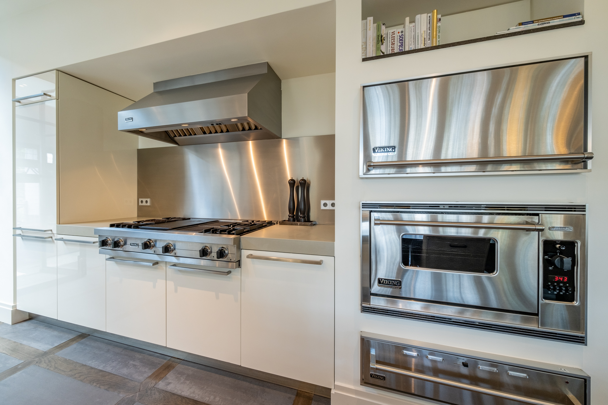 + kastenwand met diverse inbouwapparatuur (Viking), gasfornuis, tepan-yakki- en grillplaat, stoomoven, afzuigkap, twee vaatwassers, warmhoud-lade, koelkast met vriezer, tweede keukenblok met tweede gootsteen